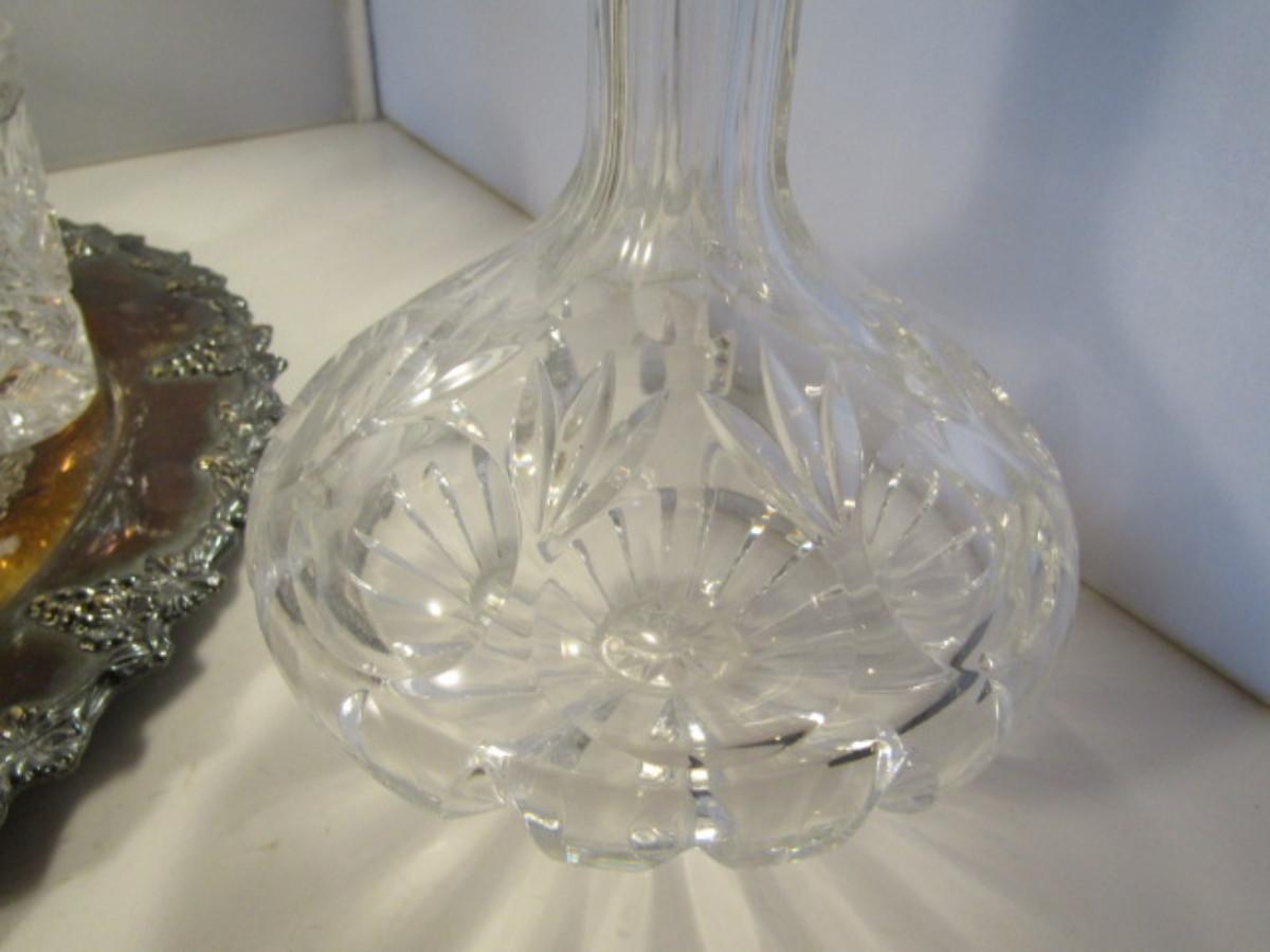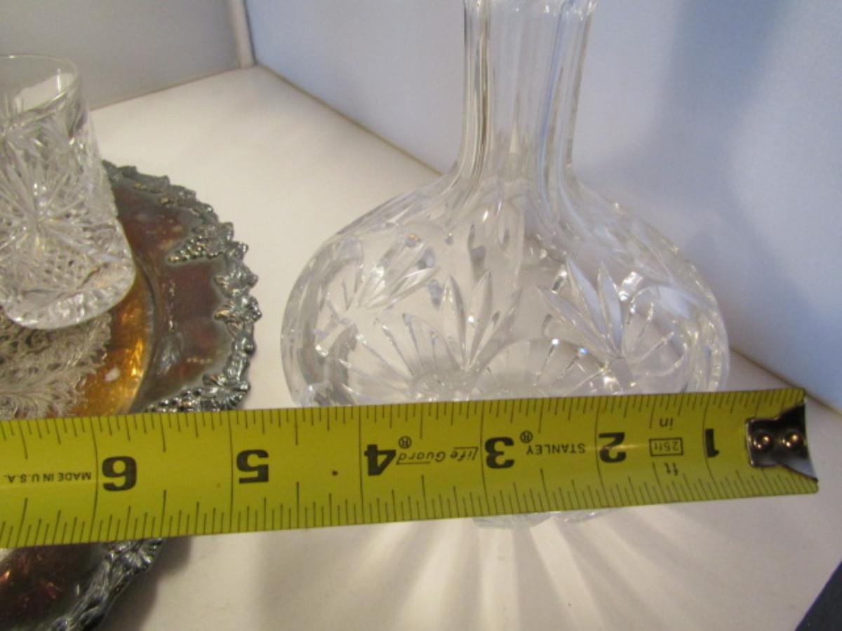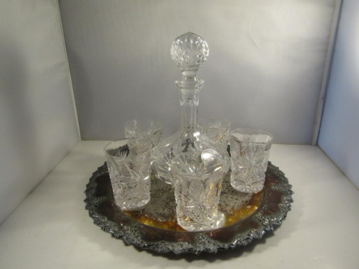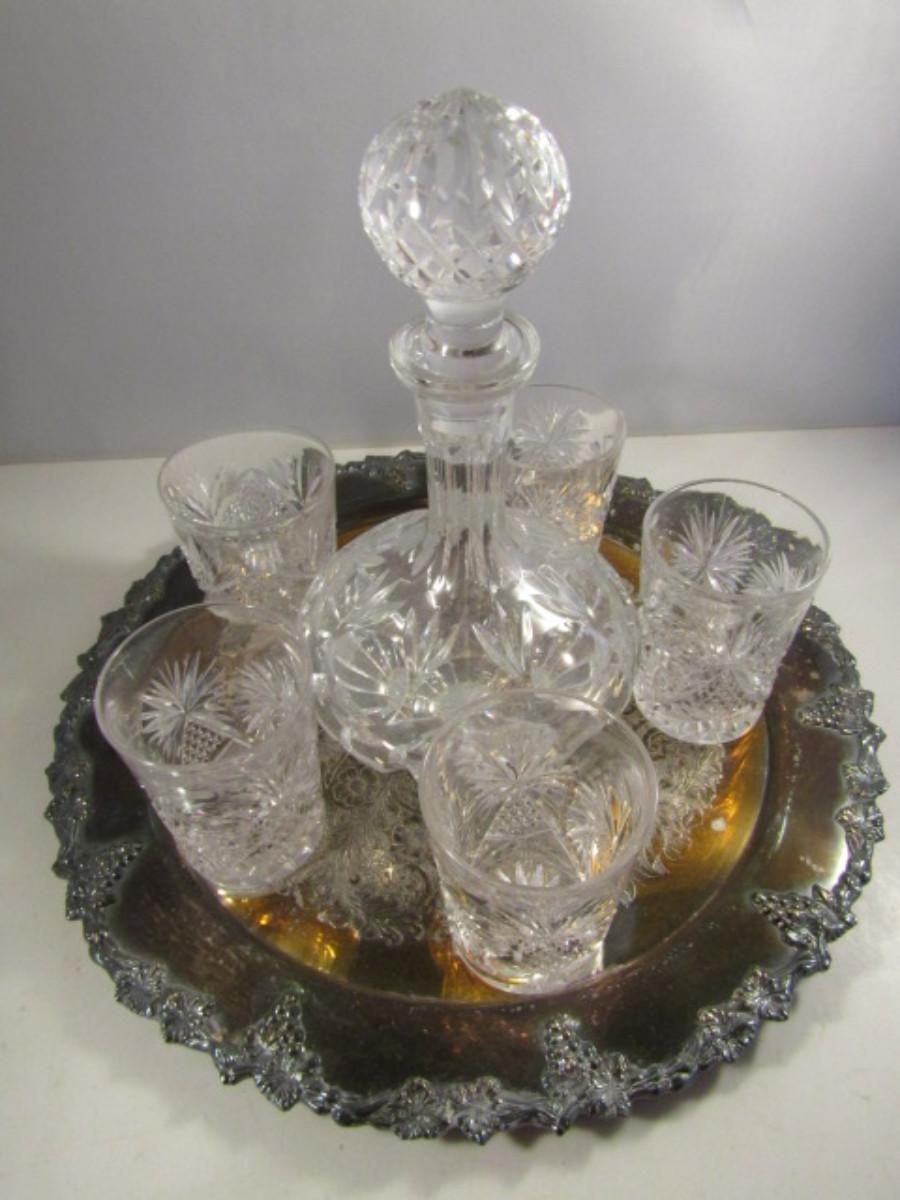 Crystal Cocktail Set with Silver Plated Tray. Set includes five glasses and one decanter with stopper.
