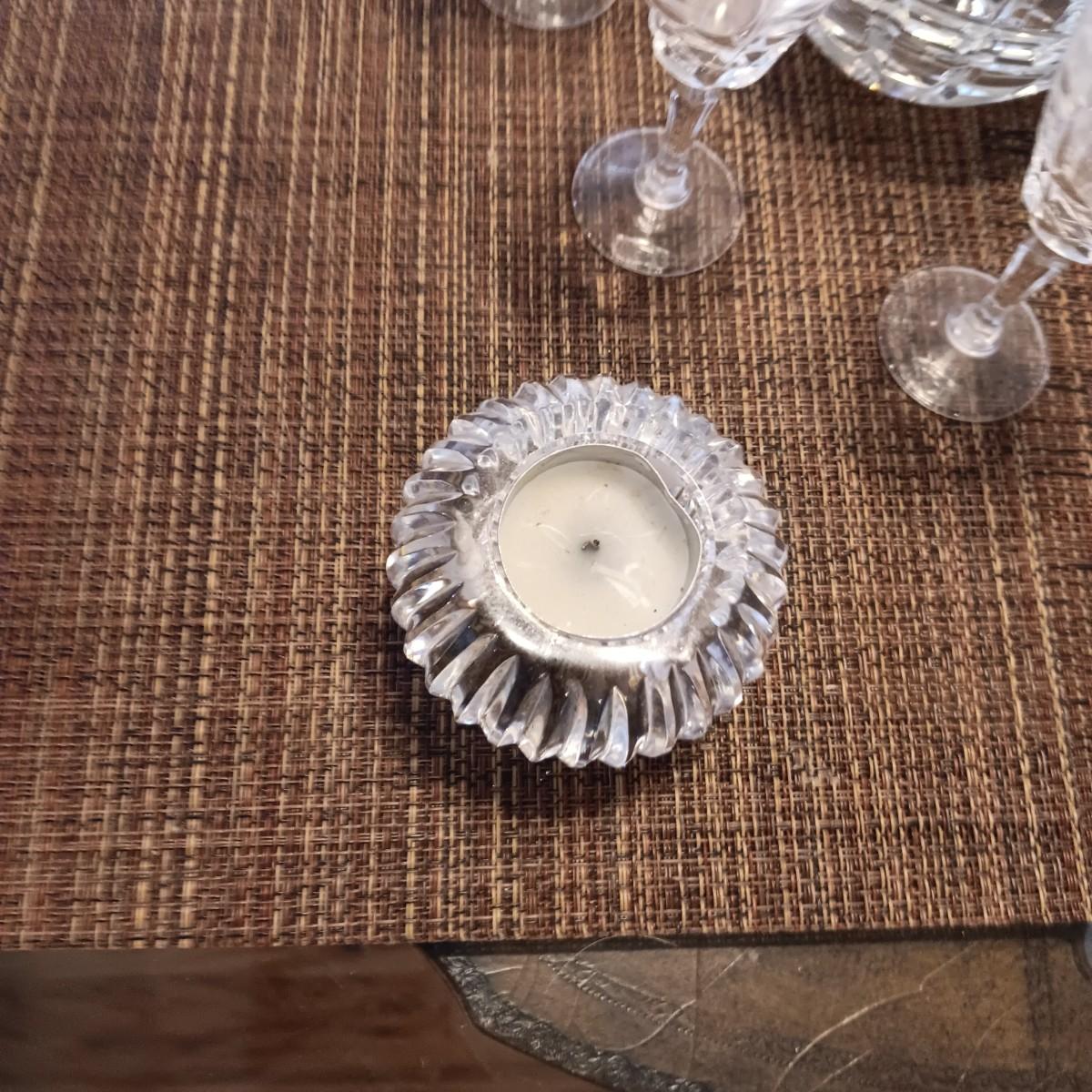 CRYSTAL DECANTER, 5 SMALL STEMMED GLASSES AND CRYSTAL VOTIVE CANDLE HOLDERS