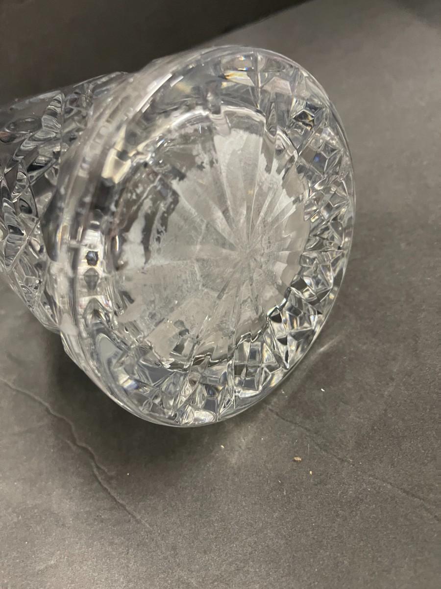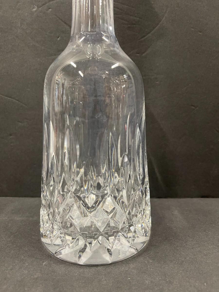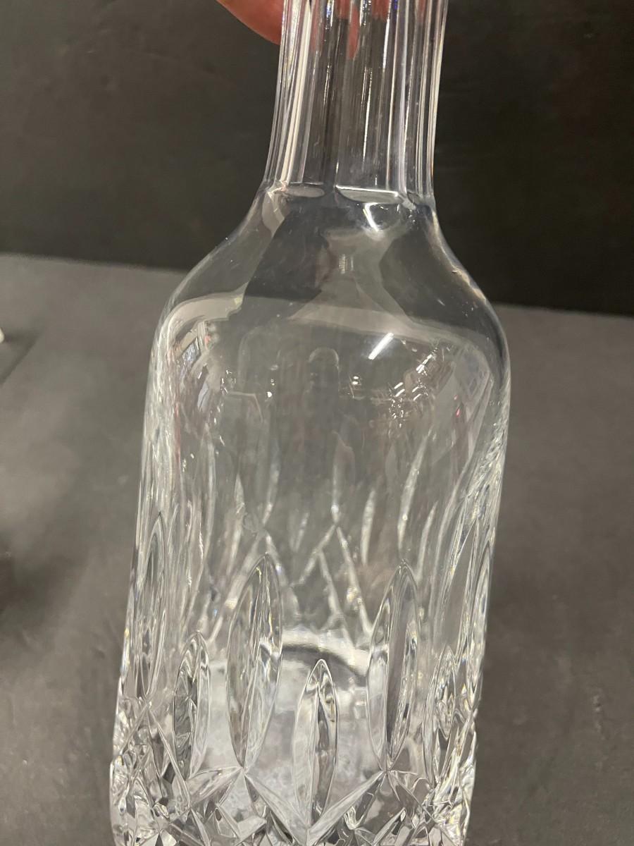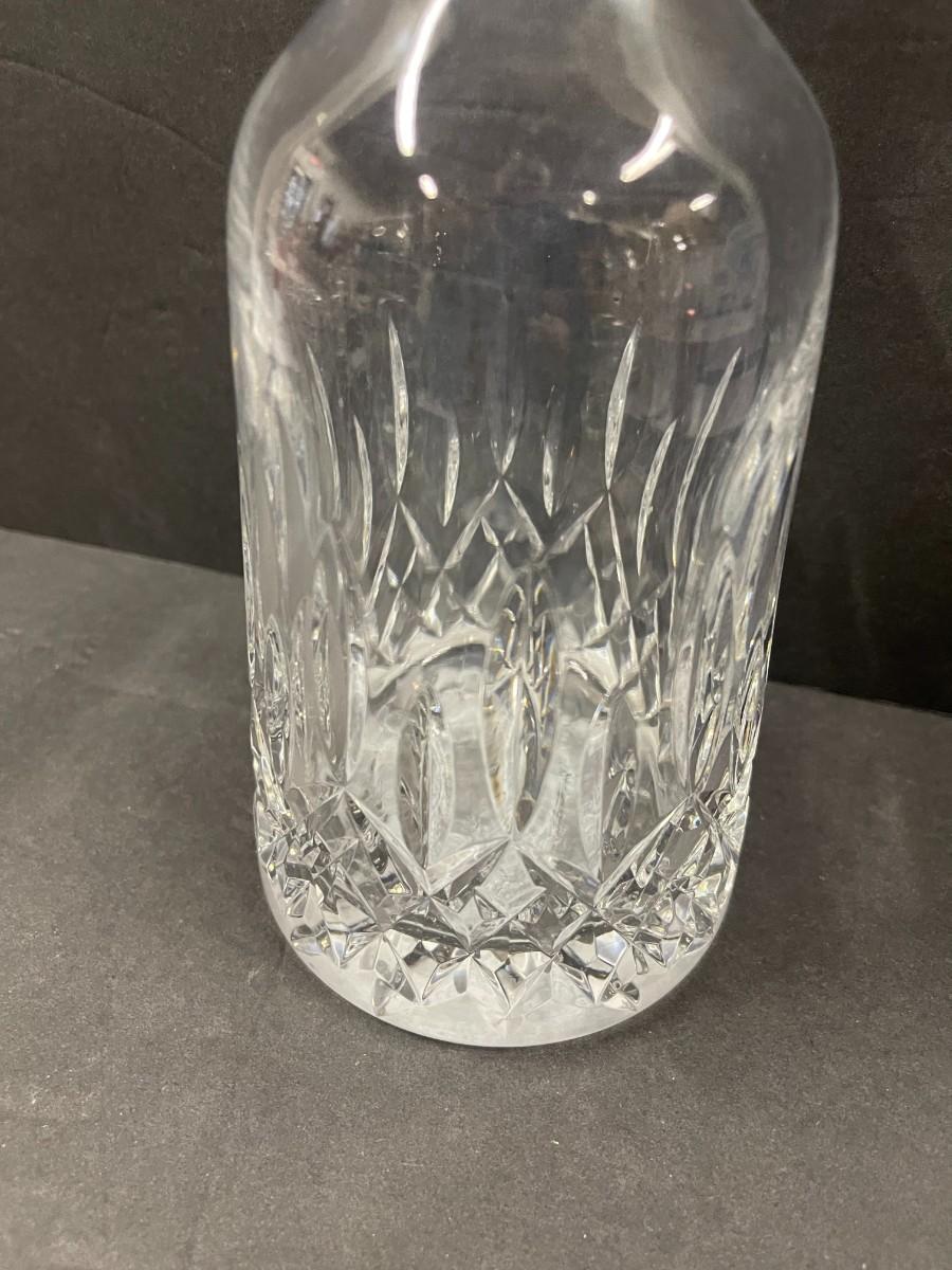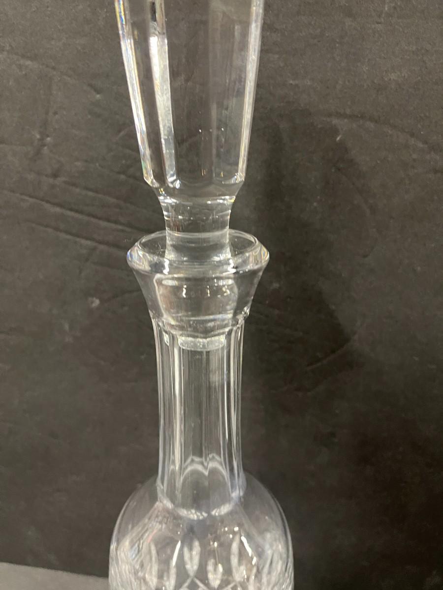 Crystal decanter . 14 1/2" . Has some residue on the bottom, but otherwise good condition.