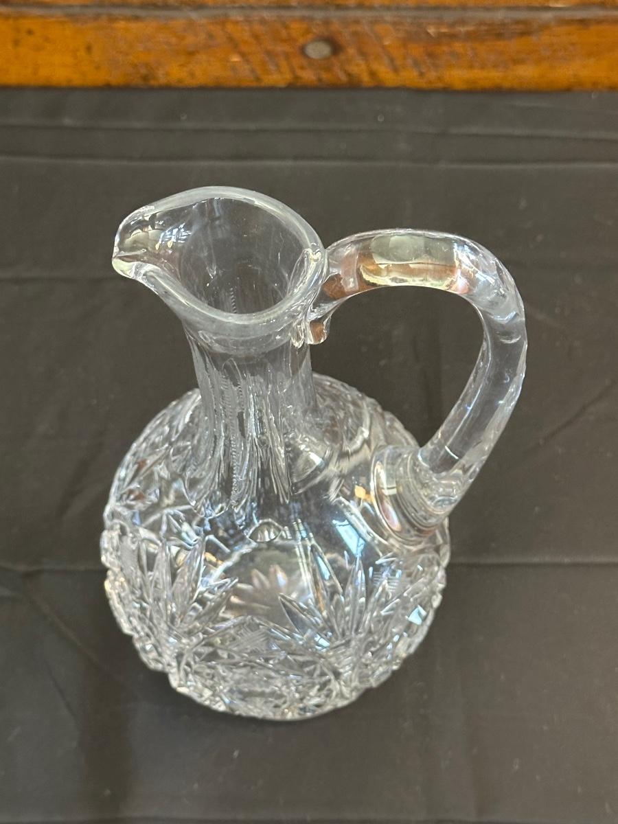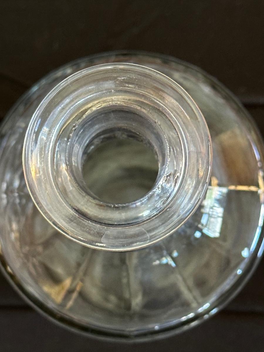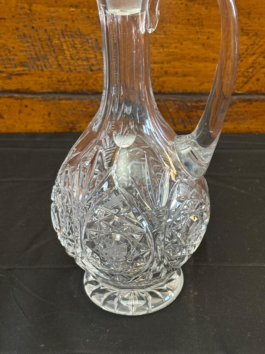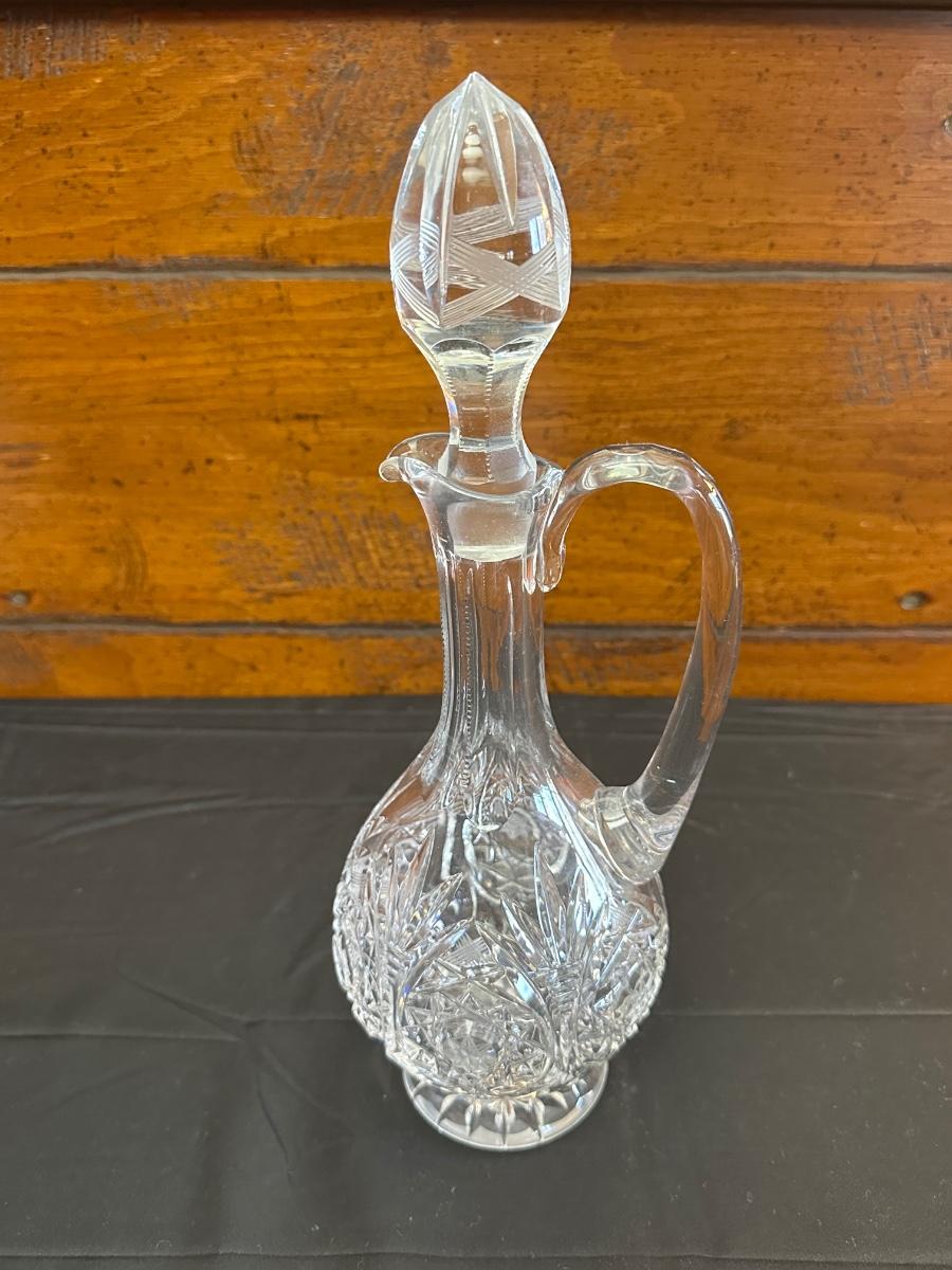 Vintage. The tall decanter has an etched pattern and a small chip on the bottom of the top/cork. There is some light residue in the short decanter and a small chip on the top rim. Overall in very good condition. Please see photos for details.