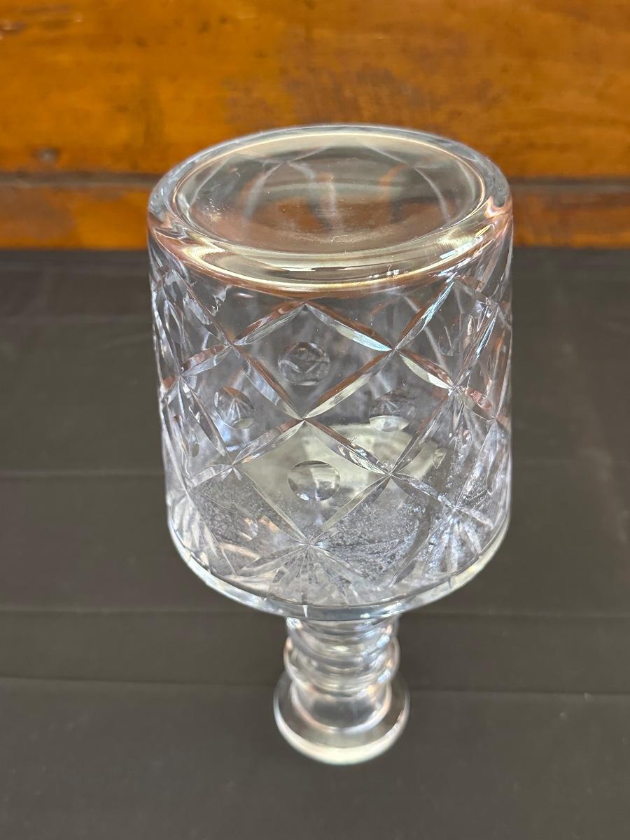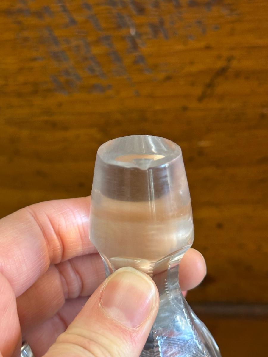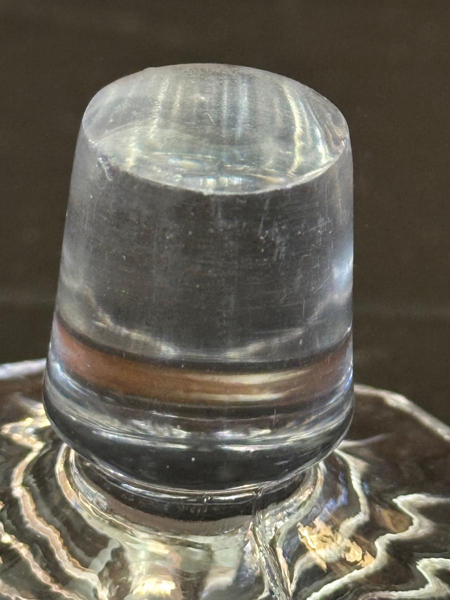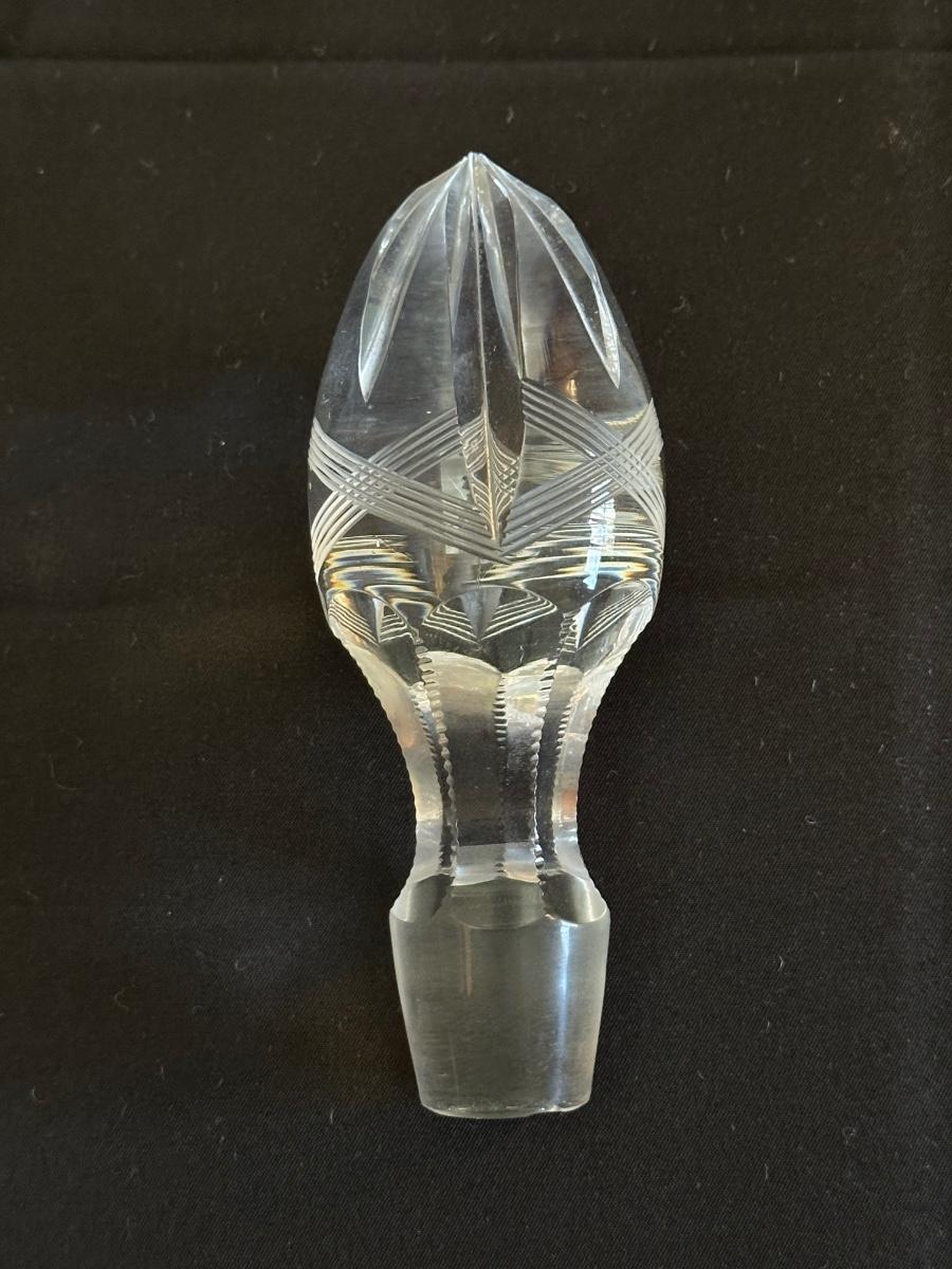Vintage. The tall decanter has an etched pattern and a small chip on the bottom of the top/cork. There is some light residue in the short decanter and a small chip on the top rim. Overall in very good condition. Please see photos for details.