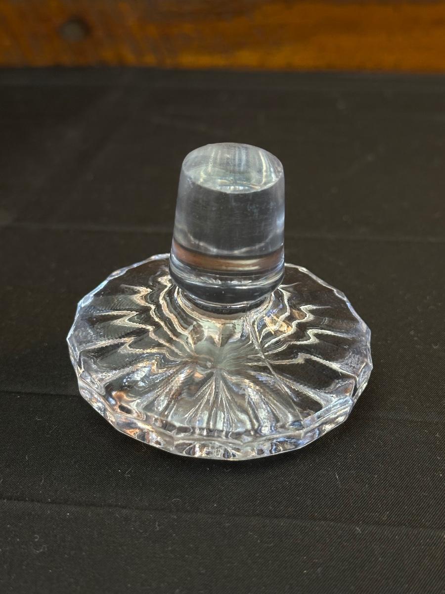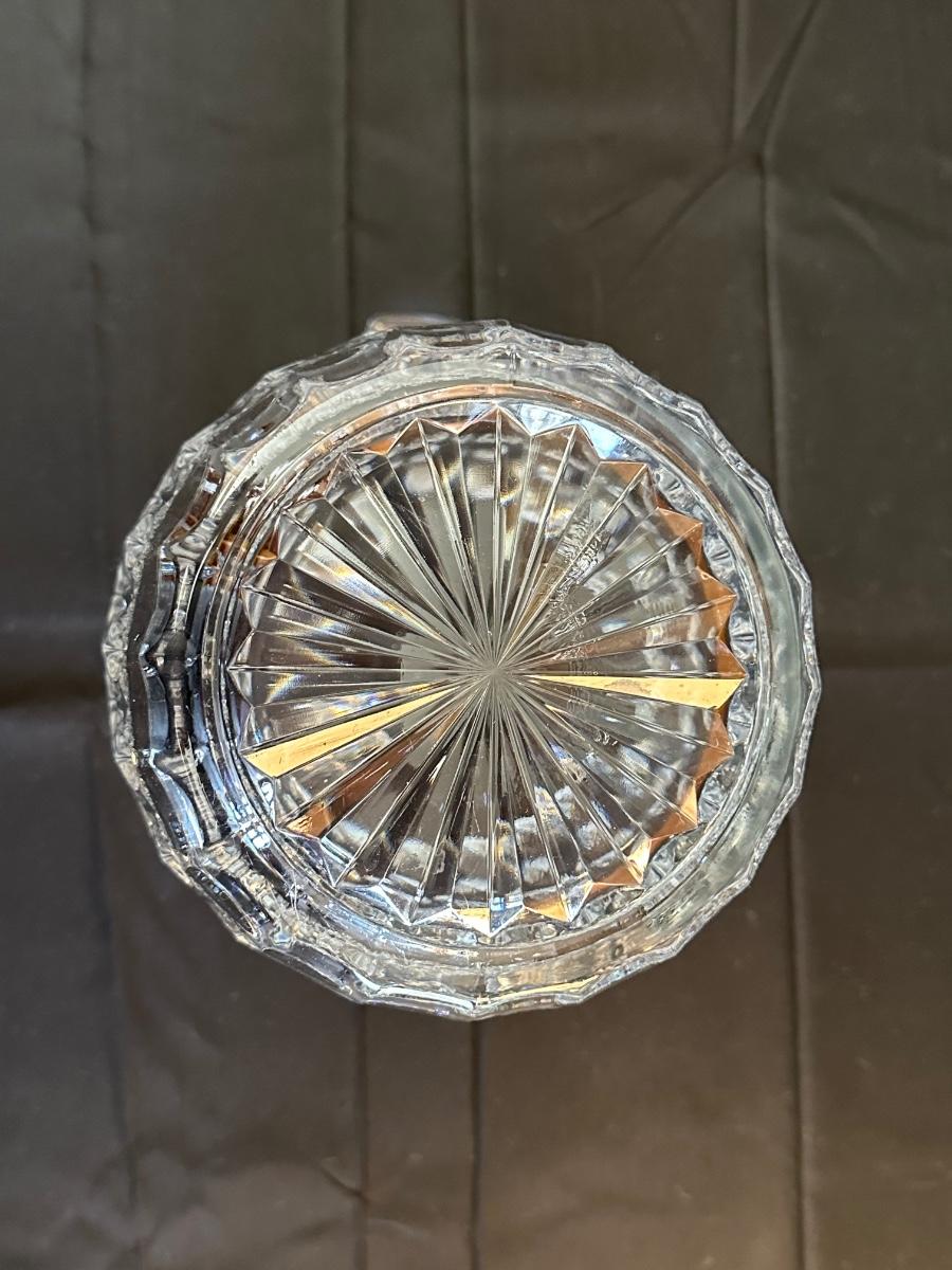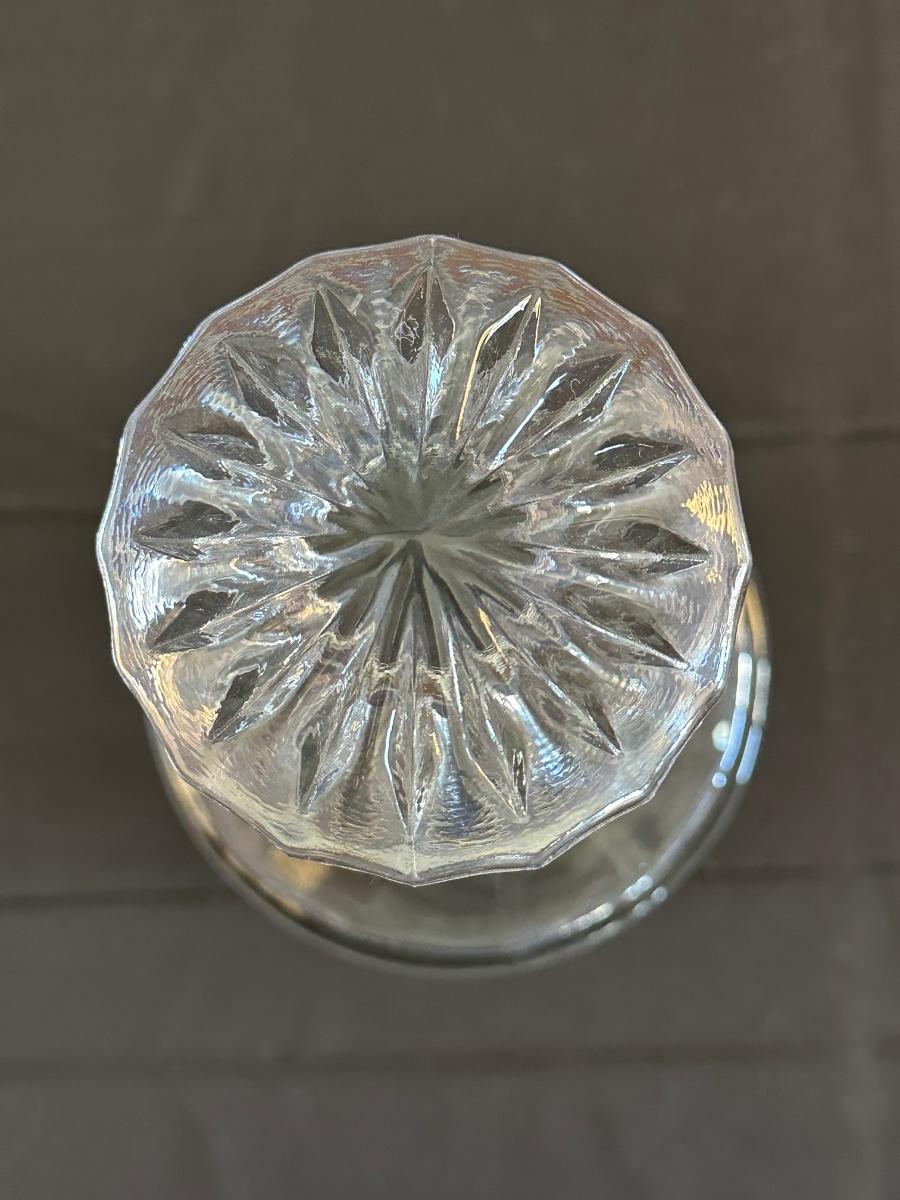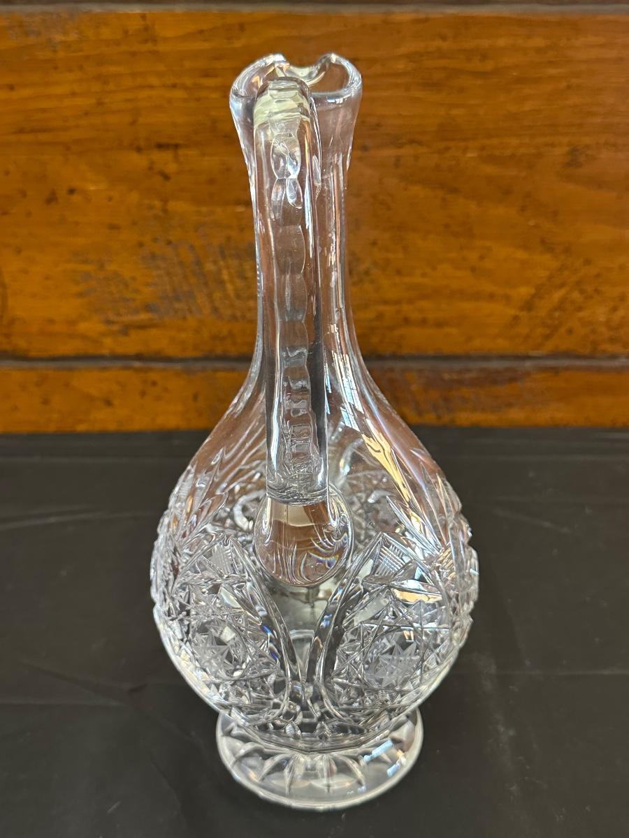 Vintage. The tall decanter has an etched pattern and a small chip on the bottom of the top/cork. There is some light residue in the short decanter and a small chip on the top rim. Overall in very good condition. Please see photos for details.