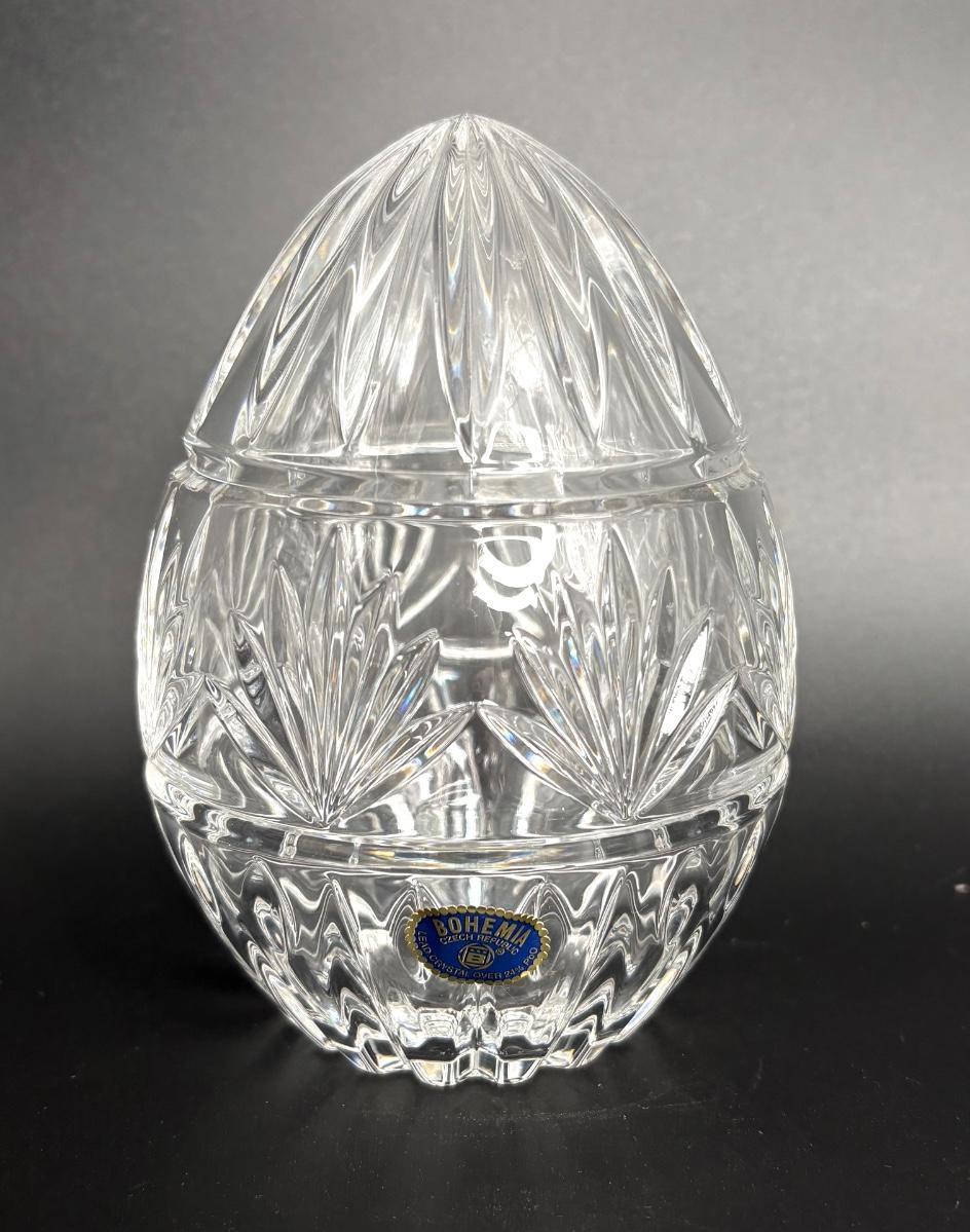 Egg is Bohemian crystal. It is 5-1/2” tall x 3-3/4” diameter.