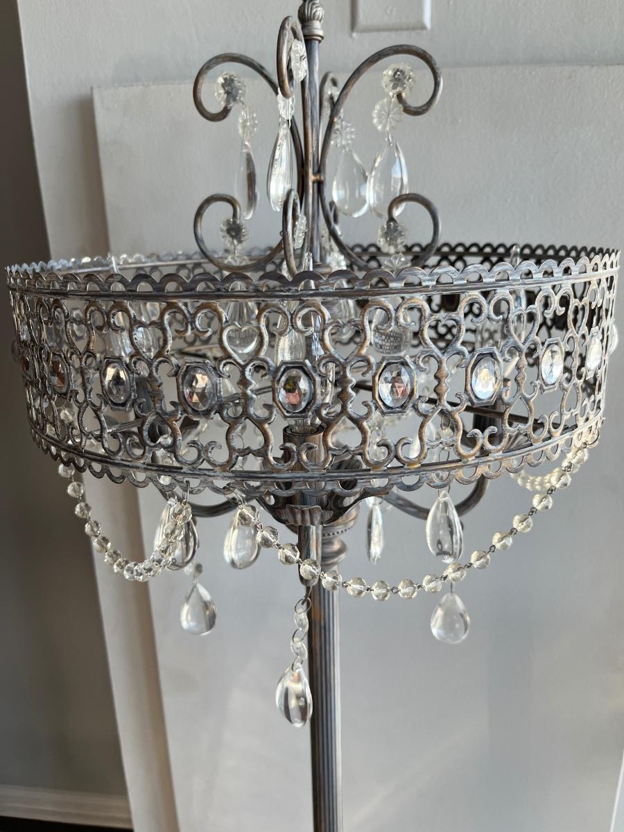 Elegant crystal floor lamp, silver metal, swagged with crystals, 4 lights. Excellent condition.