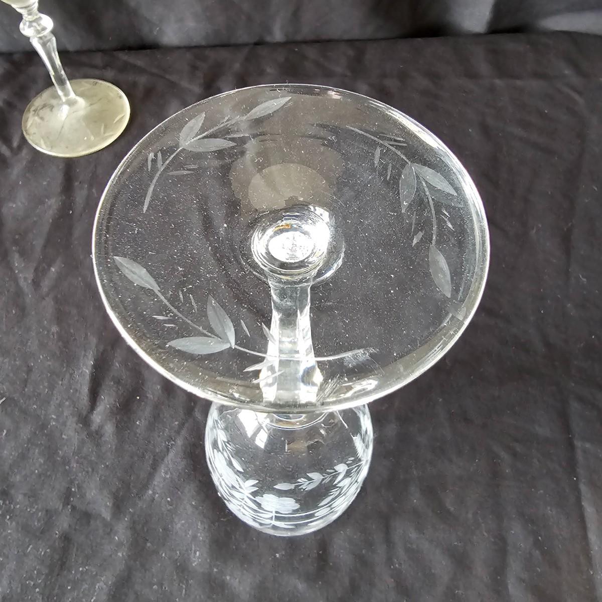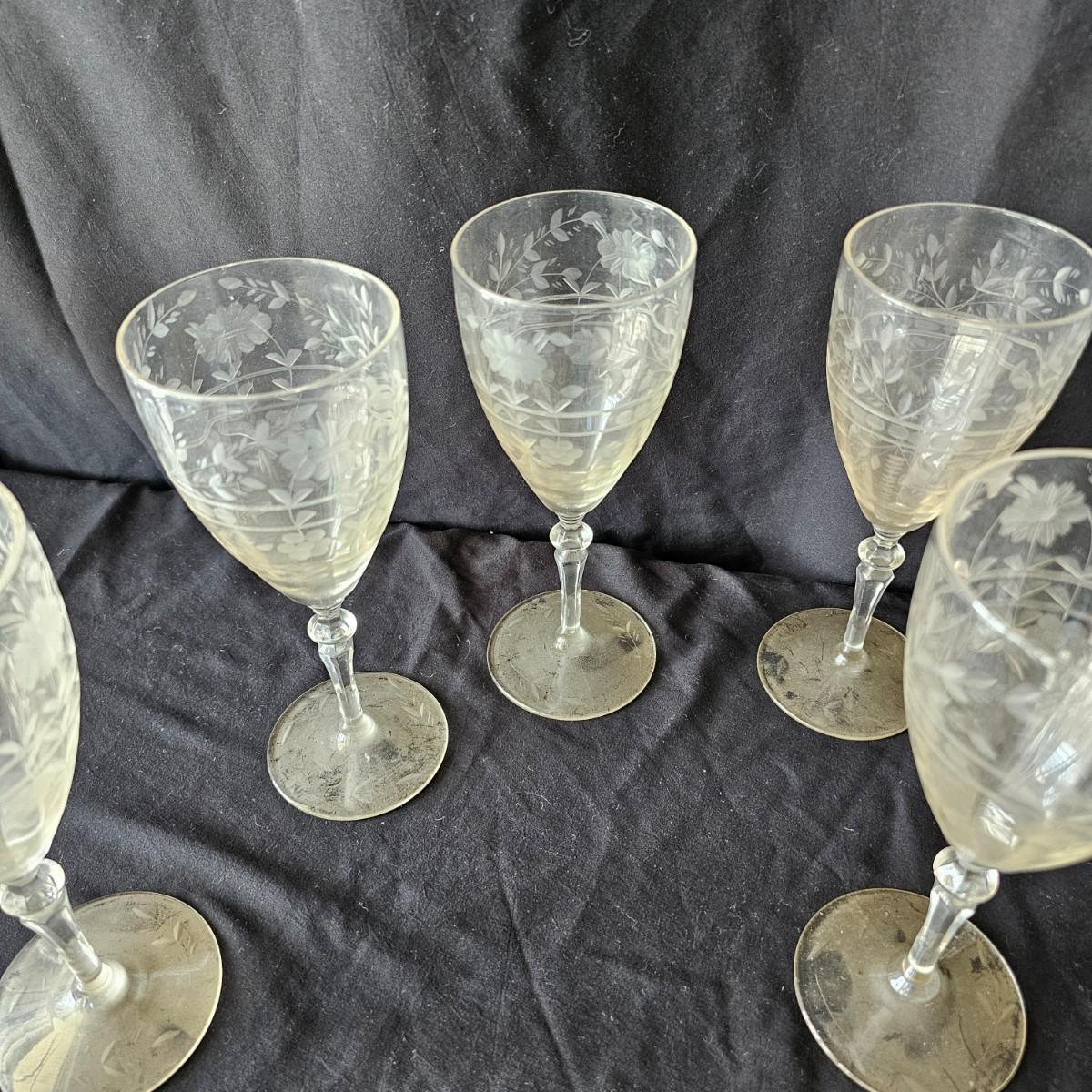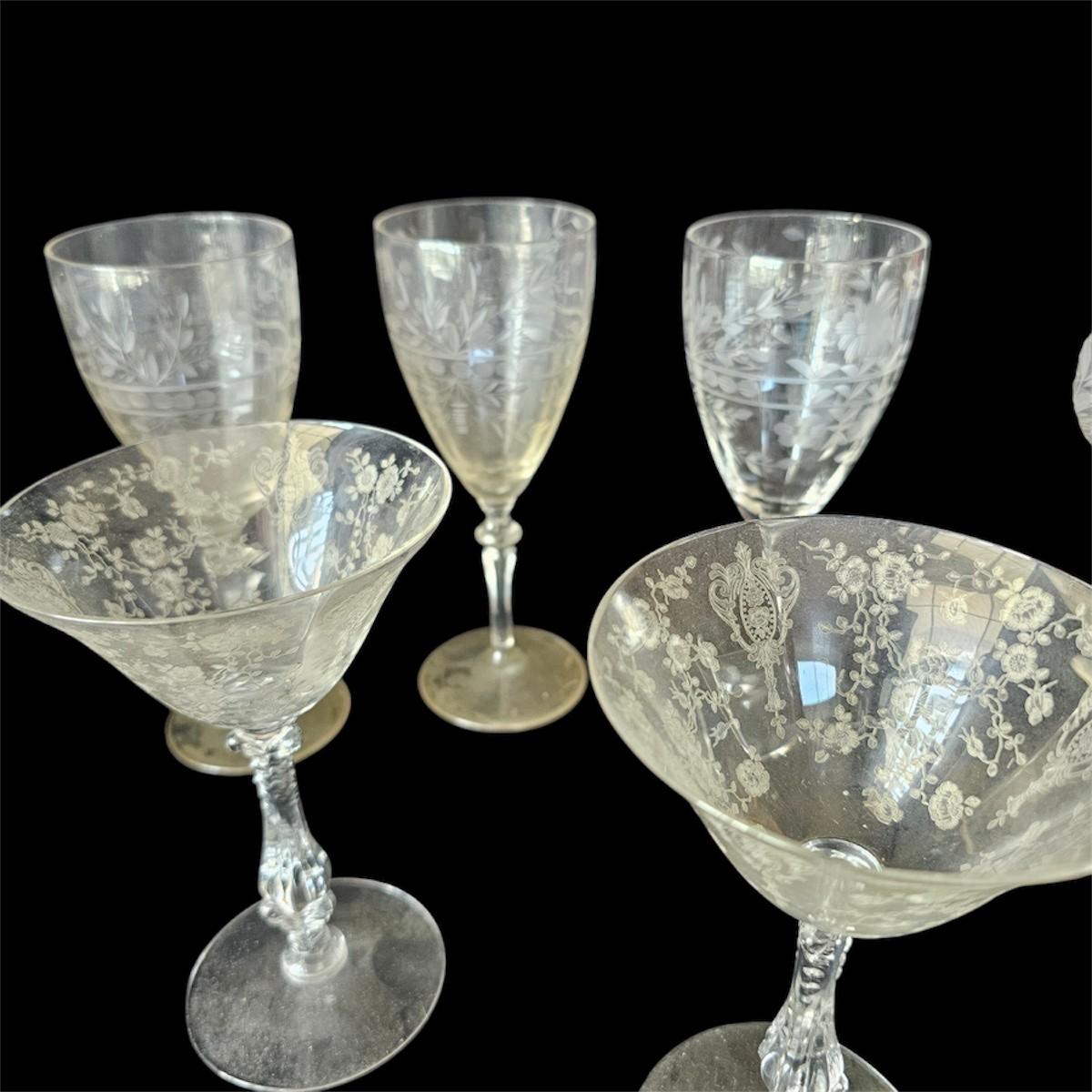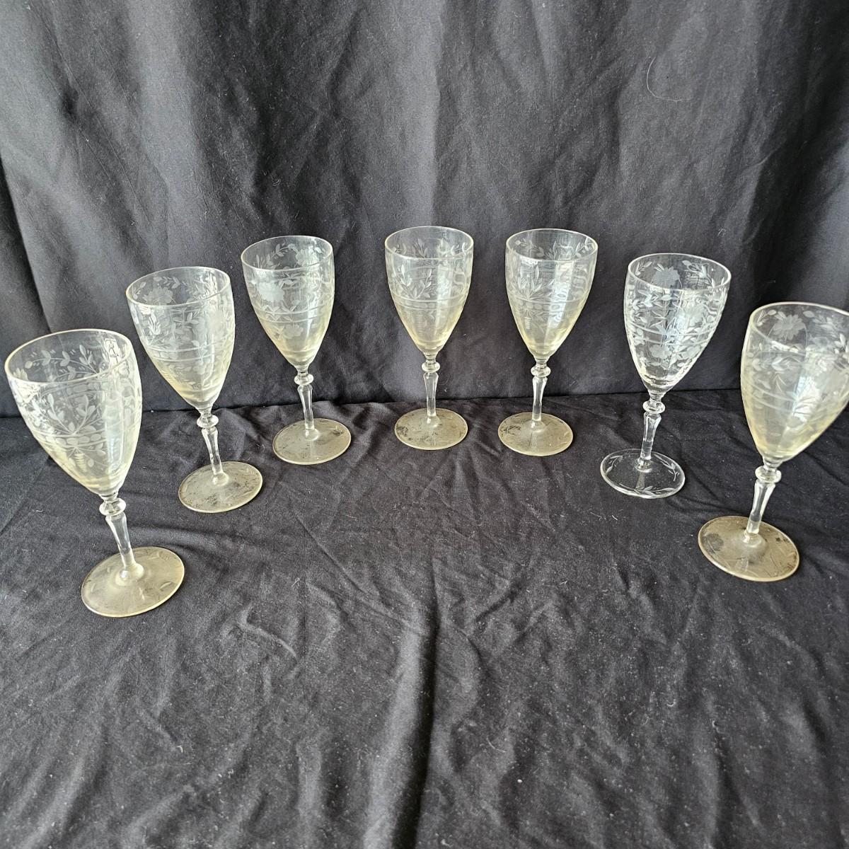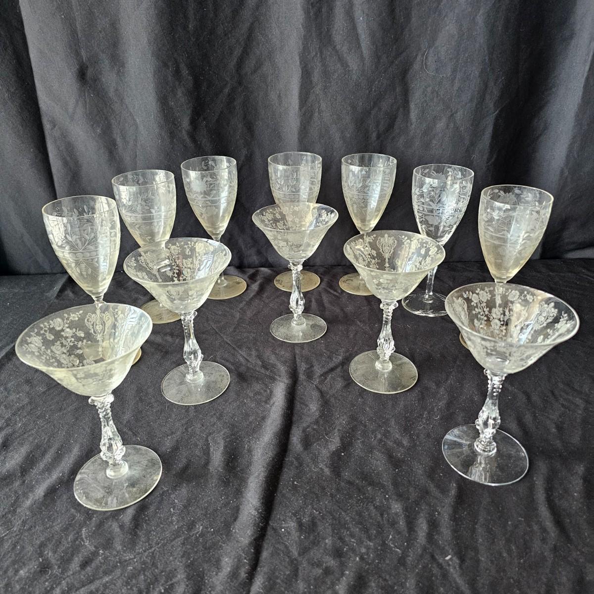 Seven wine and five cocktail glasses, all with distinctive etched floral patterns. Wine glasses are 3"D x 8"H, cocktail pieces are 4"D x 6"H. Most items clouded from storage, need good rinse. No visible chips or cracks. See photos for details. Shipping available.