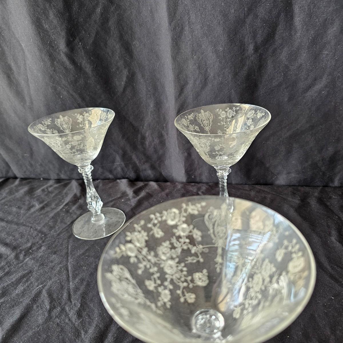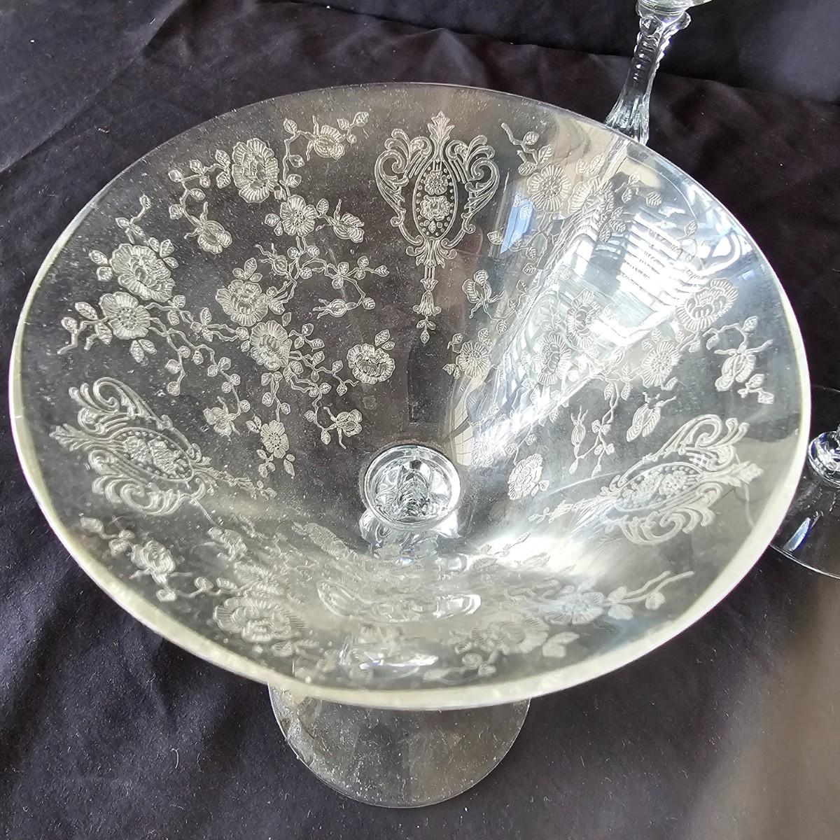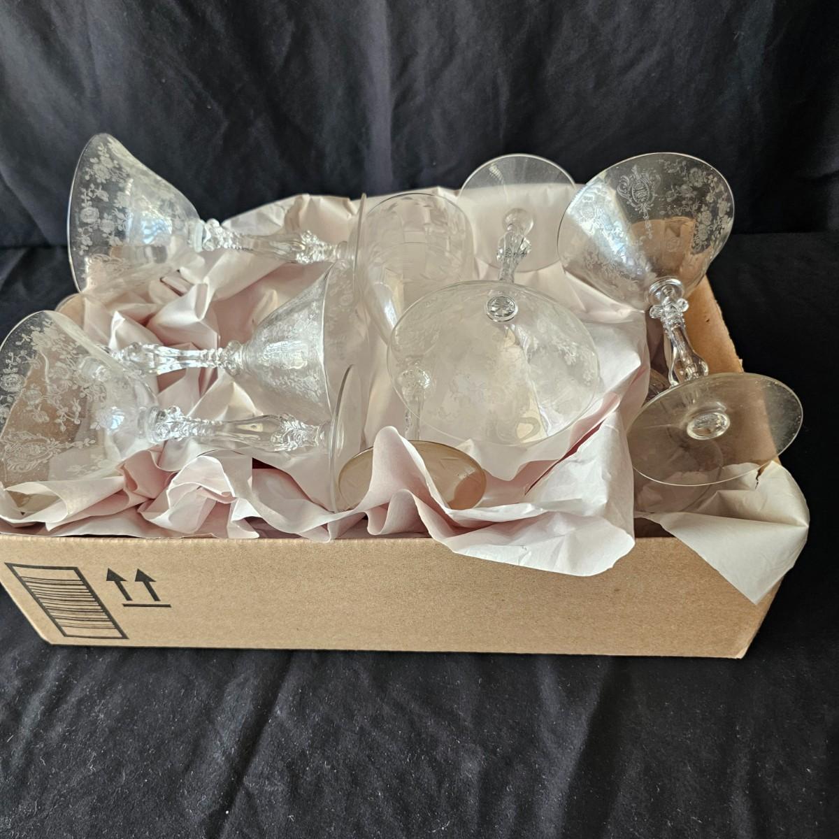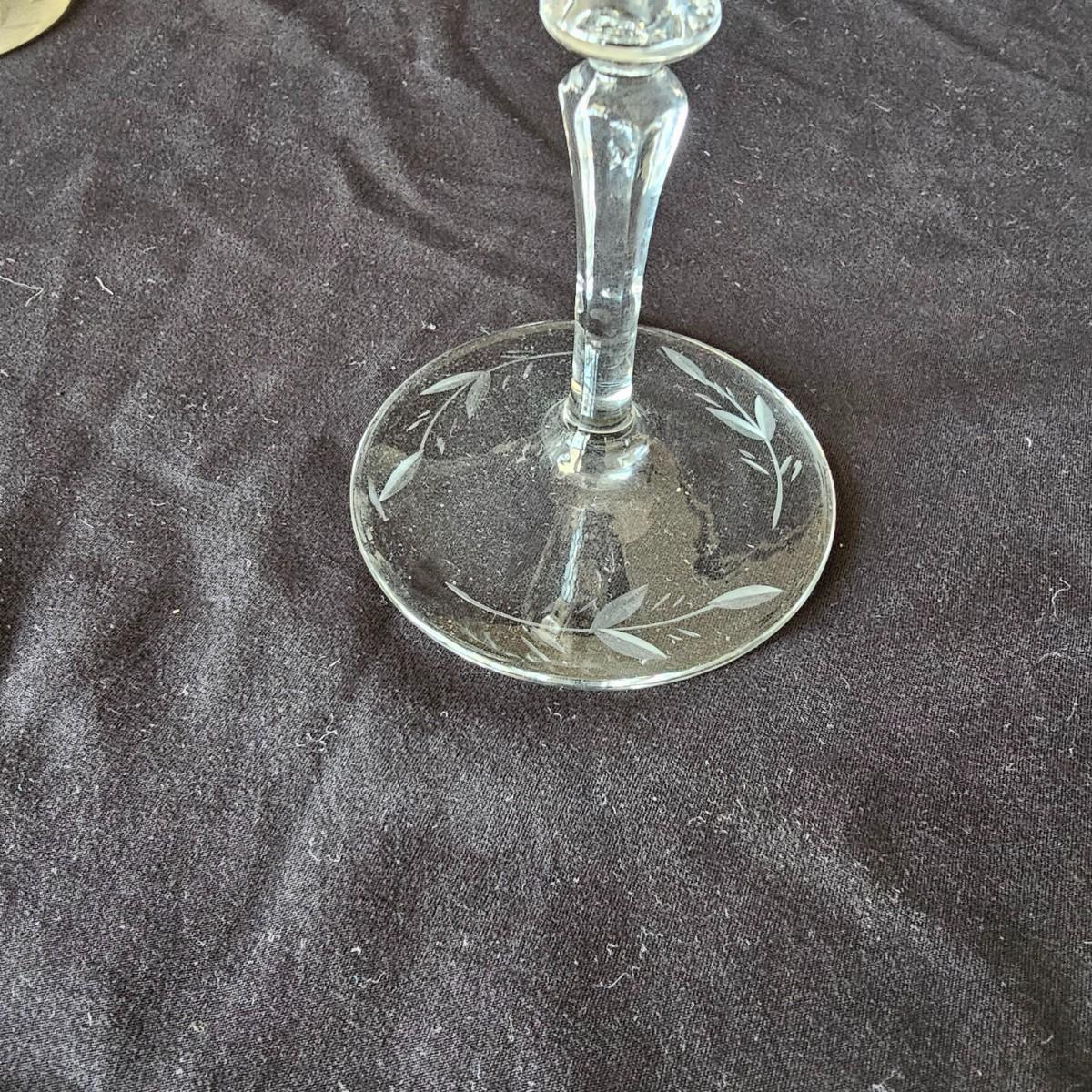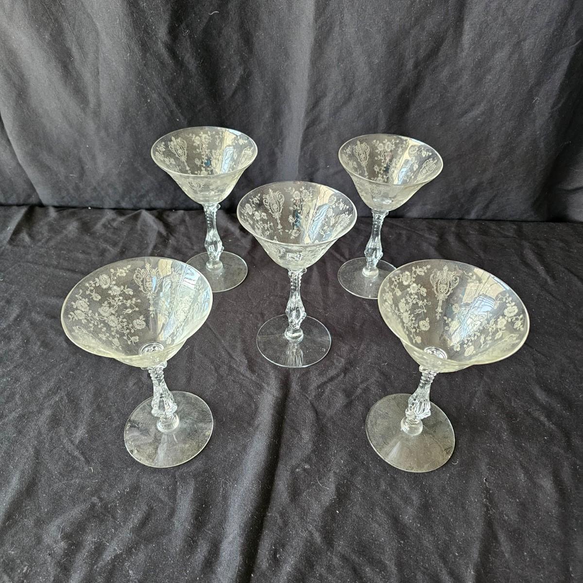 Seven wine and five cocktail glasses, all with distinctive etched floral patterns. Wine glasses are 3"D x 8"H, cocktail pieces are 4"D x 6"H. Most items clouded from storage, need good rinse. No visible chips or cracks. See photos for details. Shipping available.