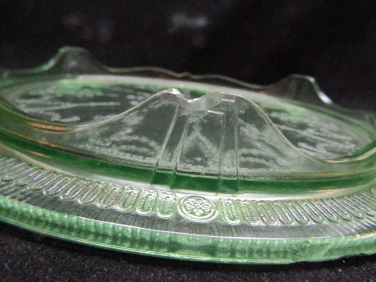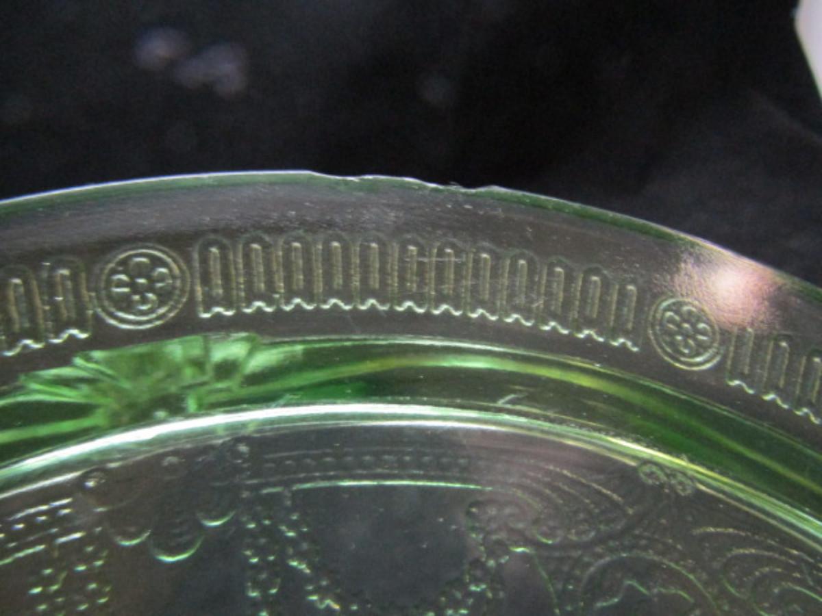 Footed Uranium Glass Cake Plate with Etched Design- Approx 10" in Diameter (#292). Please see all pictures- some fine smooth edged chips on rim.