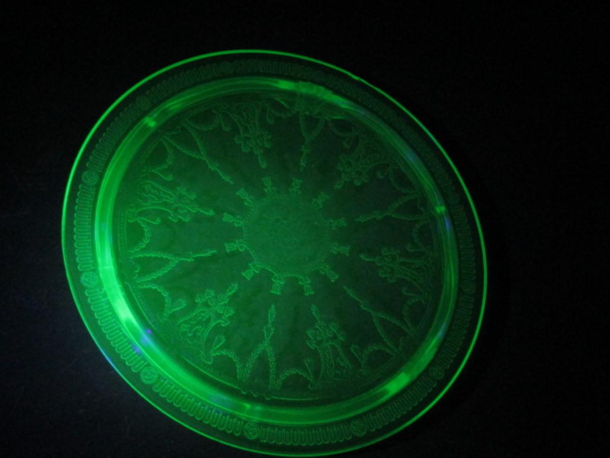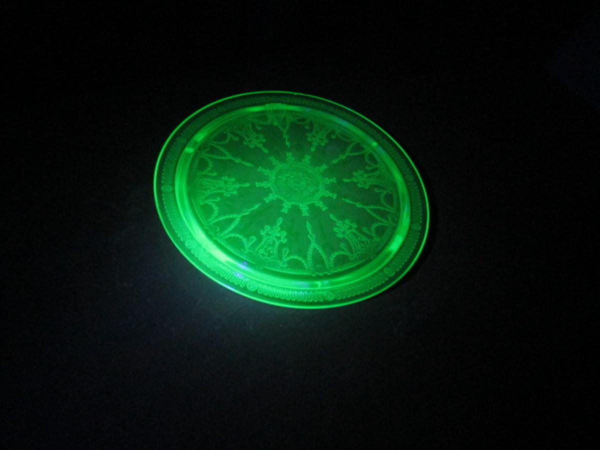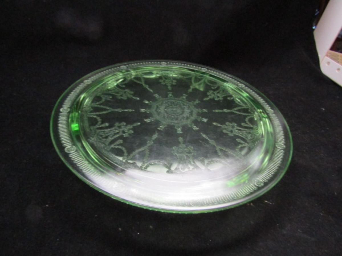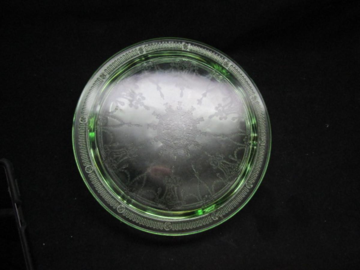 Footed Uranium Glass Cake Plate with Etched Design- Approx 10" in Diameter (#292)