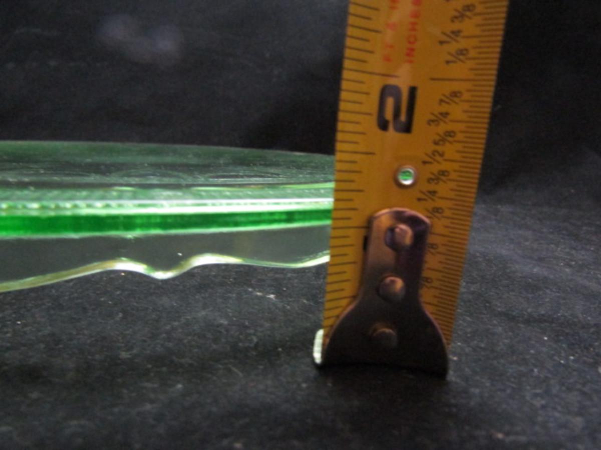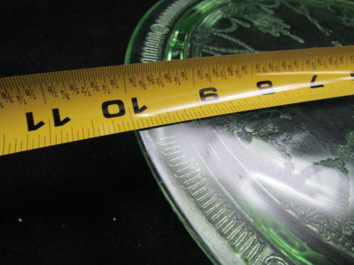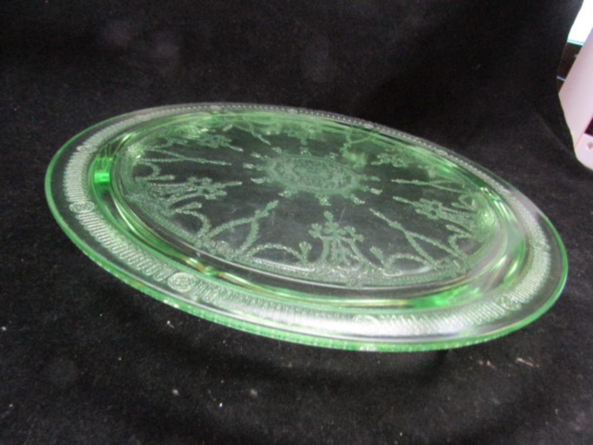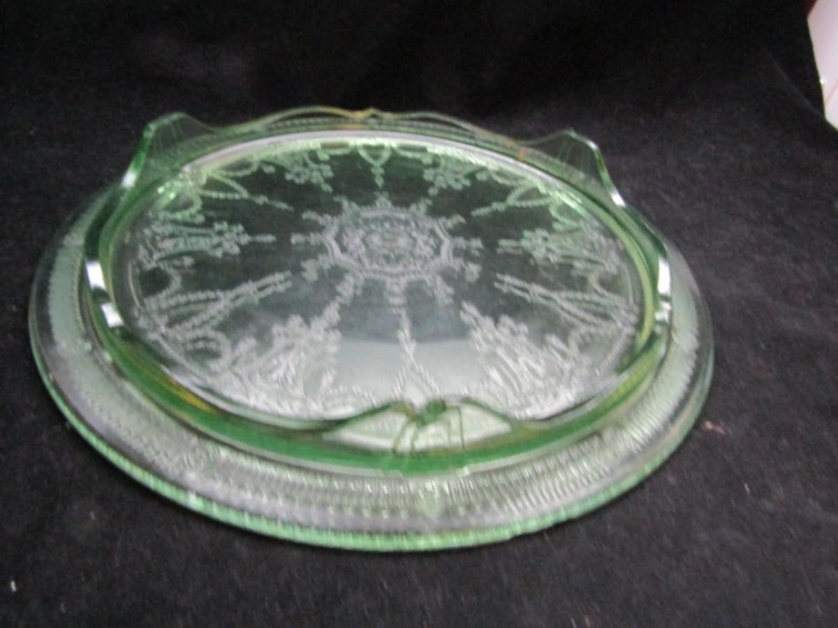 Footed Uranium Glass Cake Plate with Etched Design- Approx 10" in Diameter (#292)
