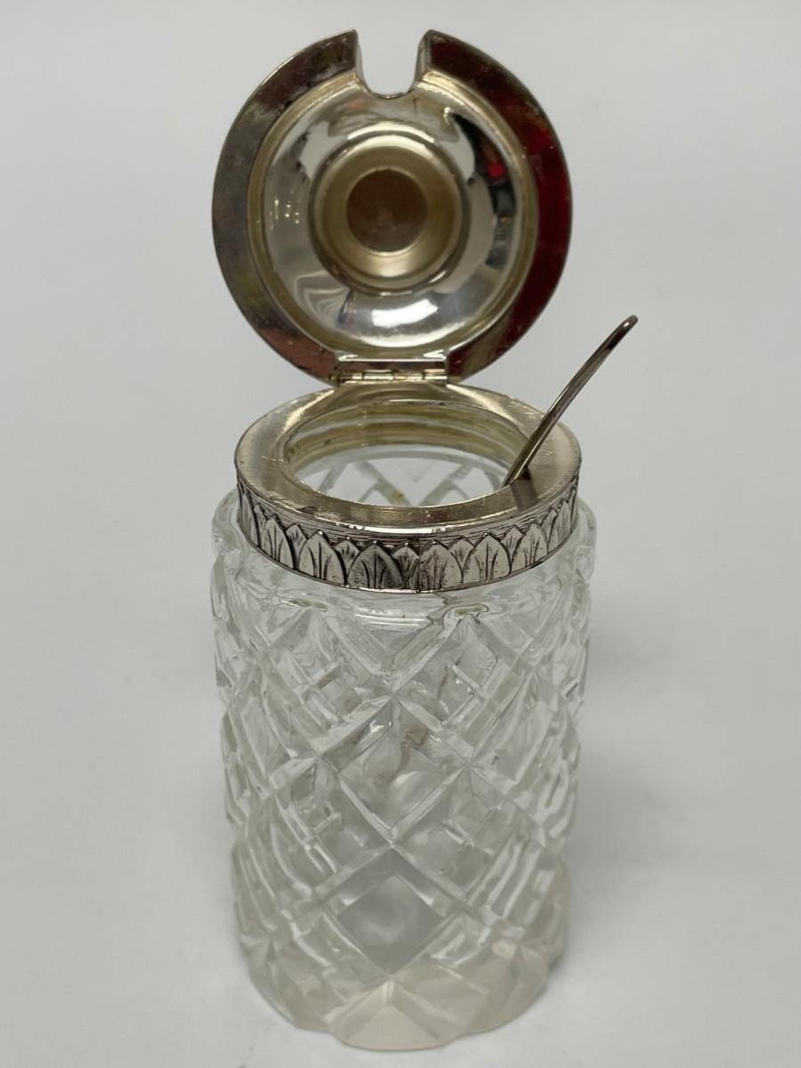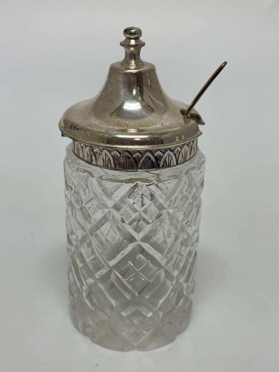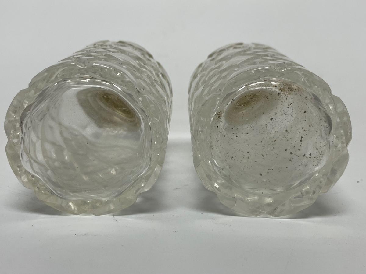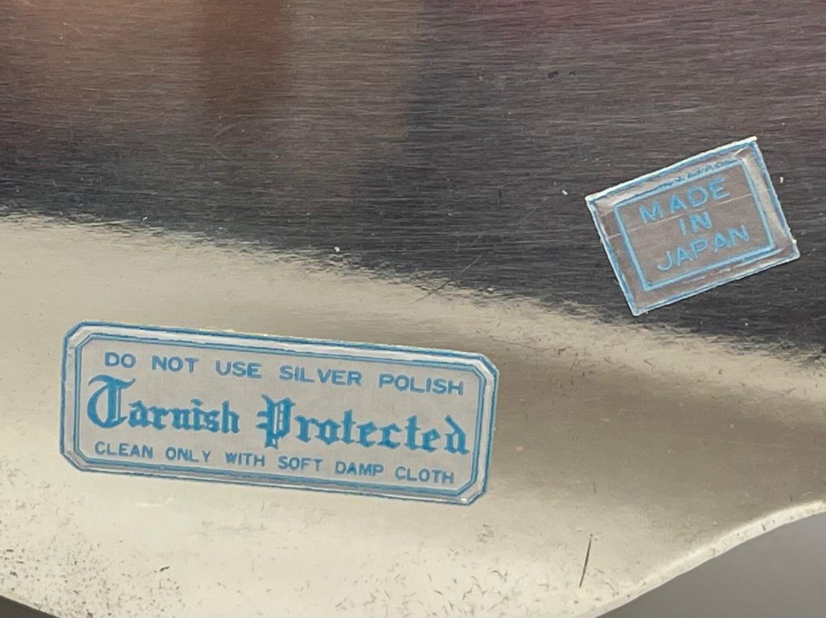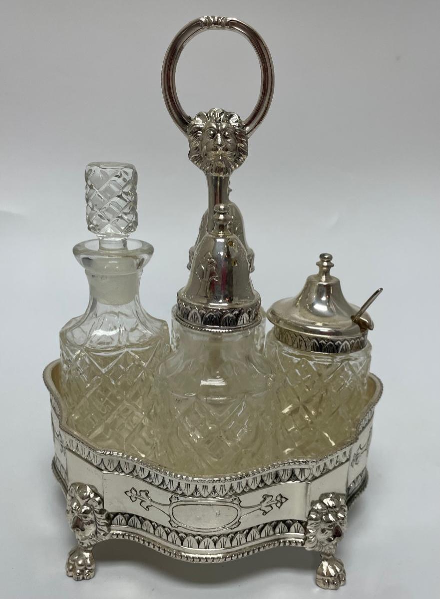 These items are all in great condition. The stand is silver plate and the items placed inside are made of crystal glass. It comes with a salt and pepper shaker, a container for spice, and a glass to hold liquid. The items are a bit scratched up, but not too bad.