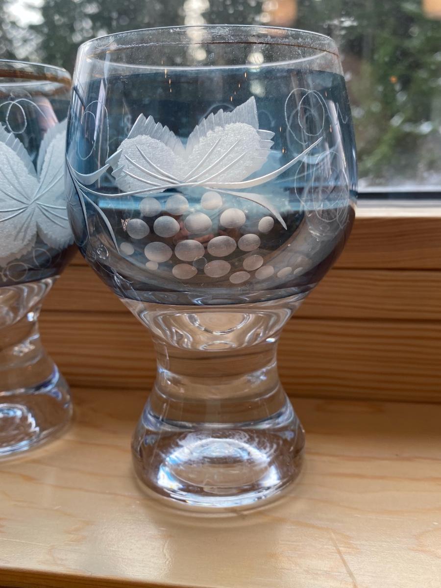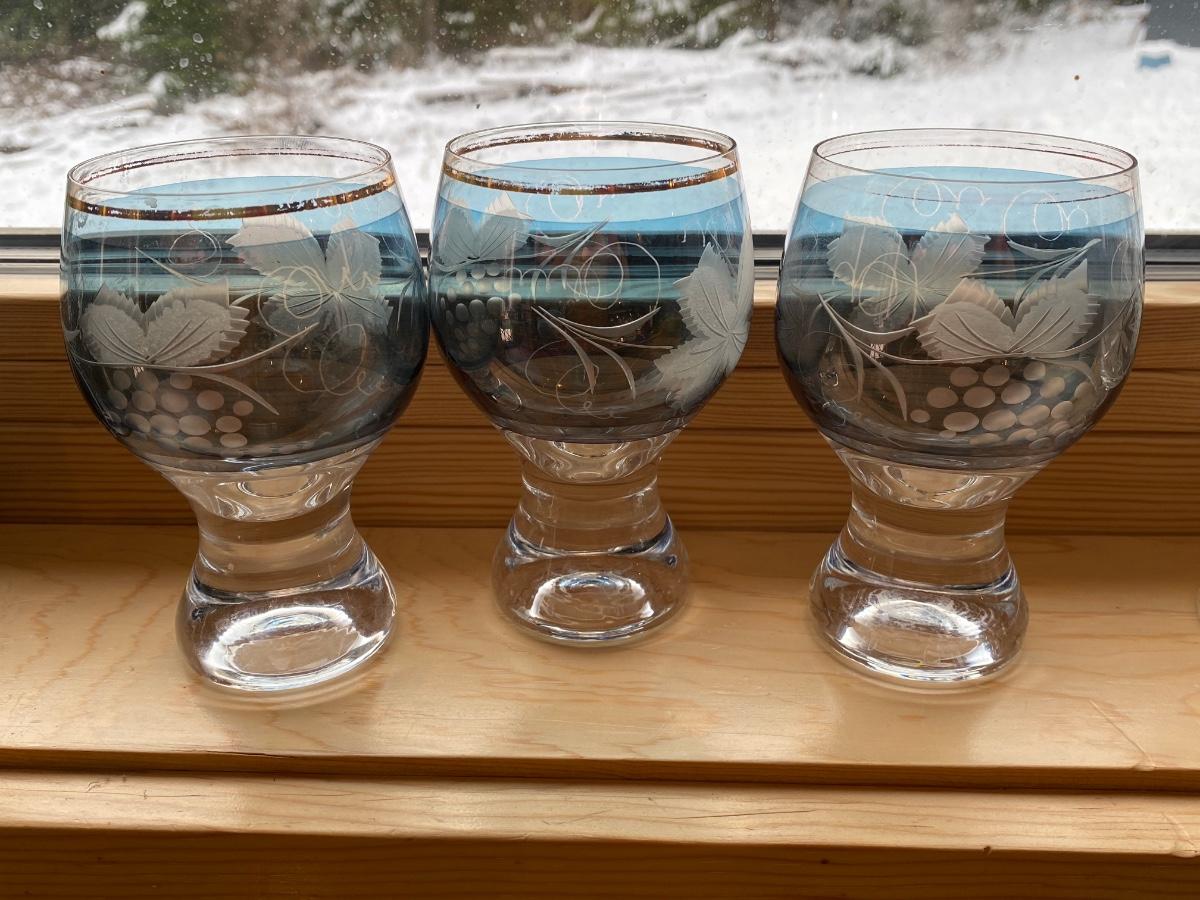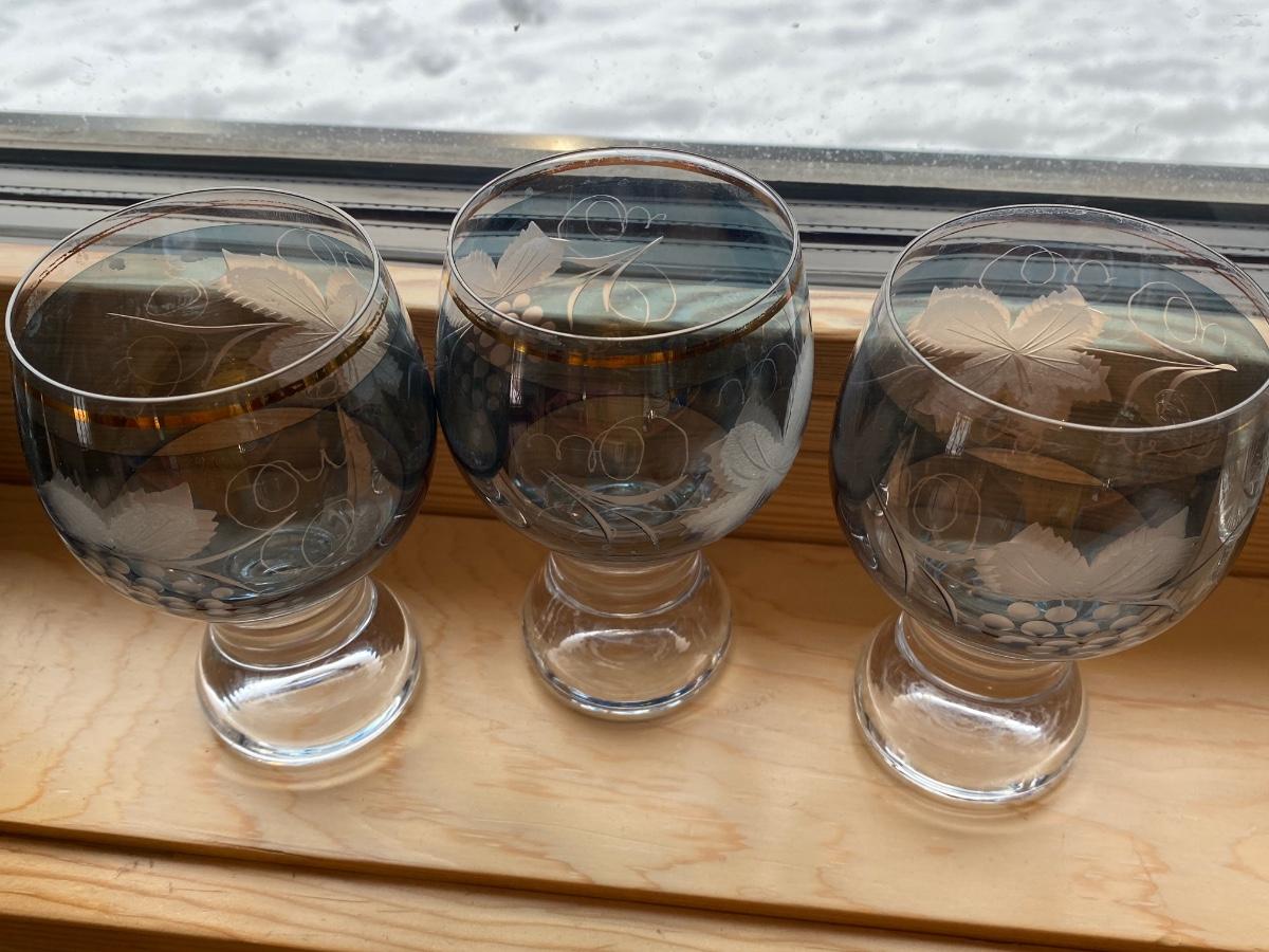 Genuine crystal with blue frost and etched pattern made in Czechoslovakia. Set of three (3).