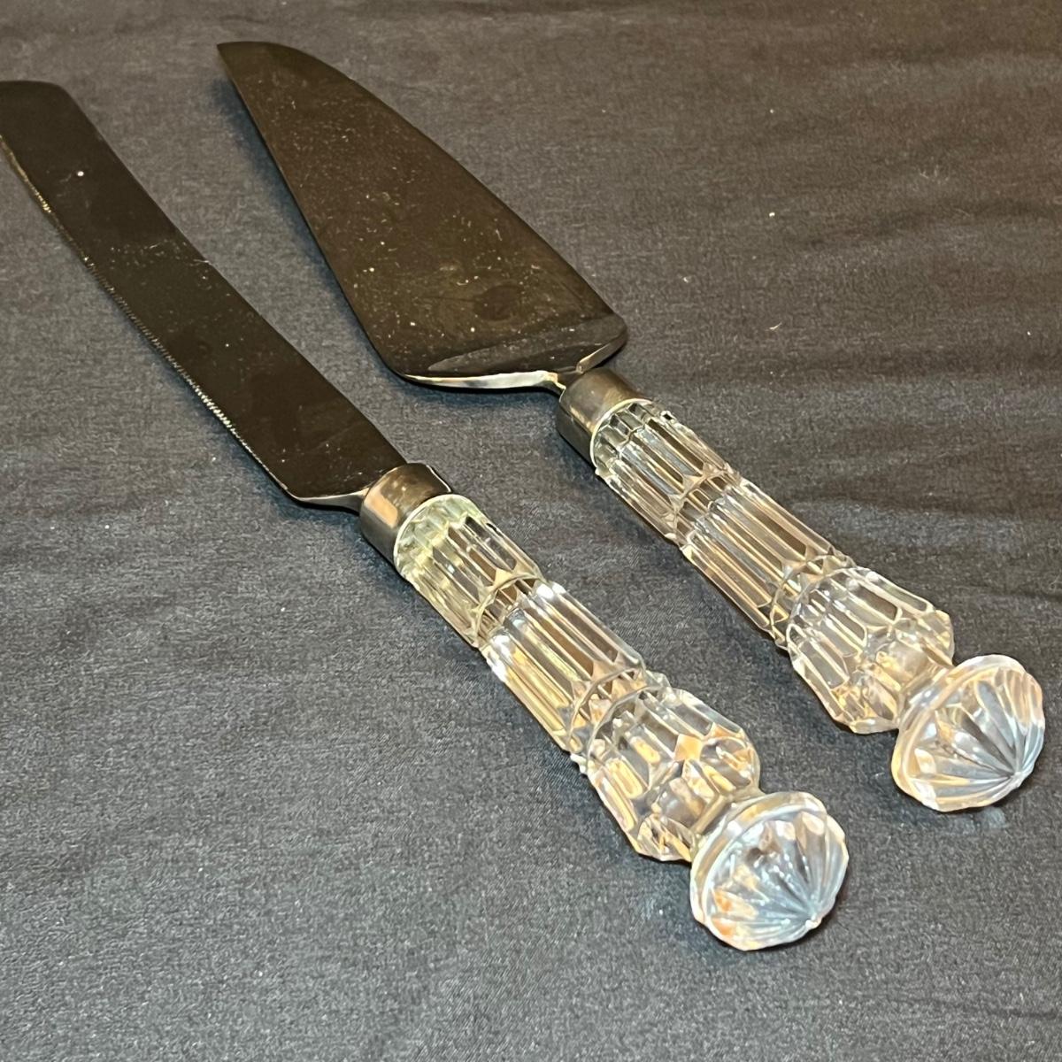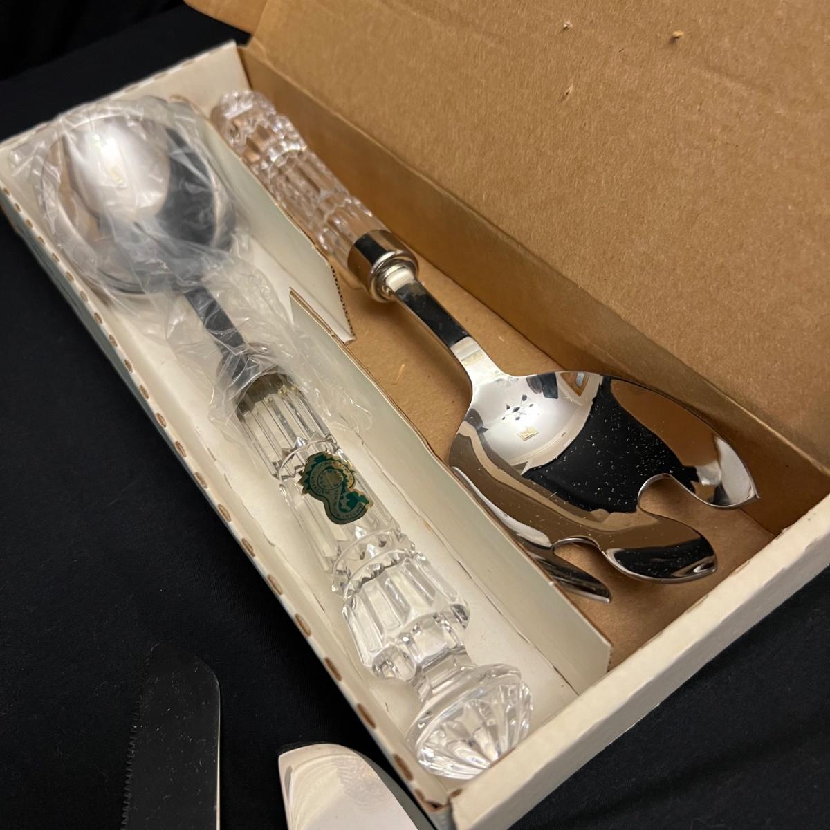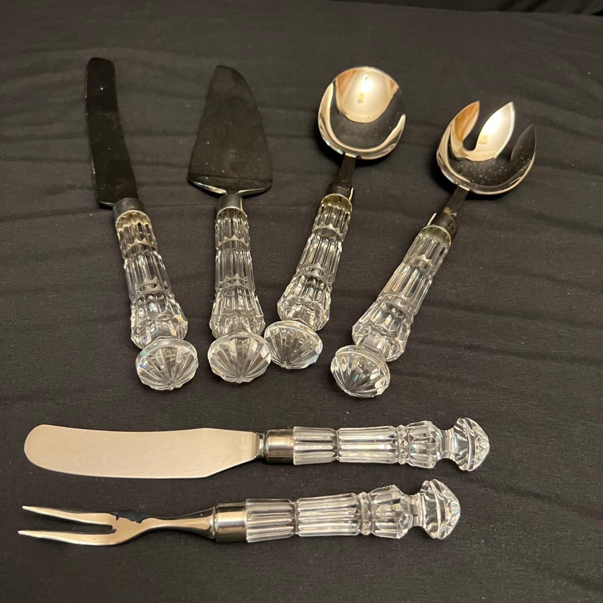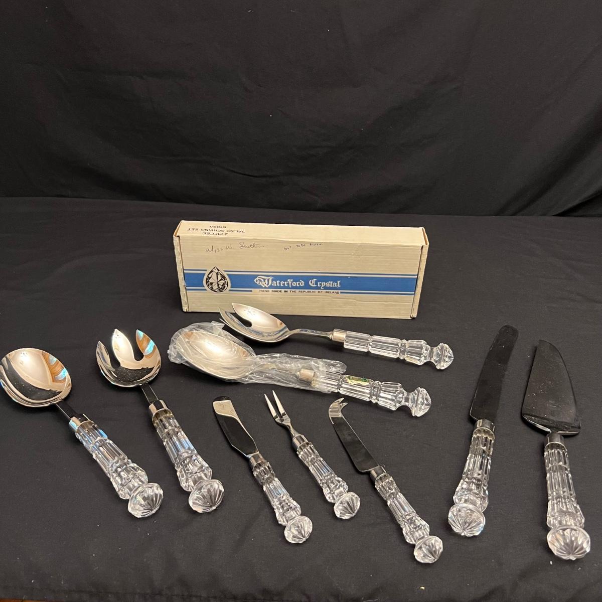 Nine Crystal handled serving utensils altogether. Two sets of salad serving utensils comes with a box for one set. Two knives, fork and includes a pie server. Waterford markings are hard to see but are on all handles.