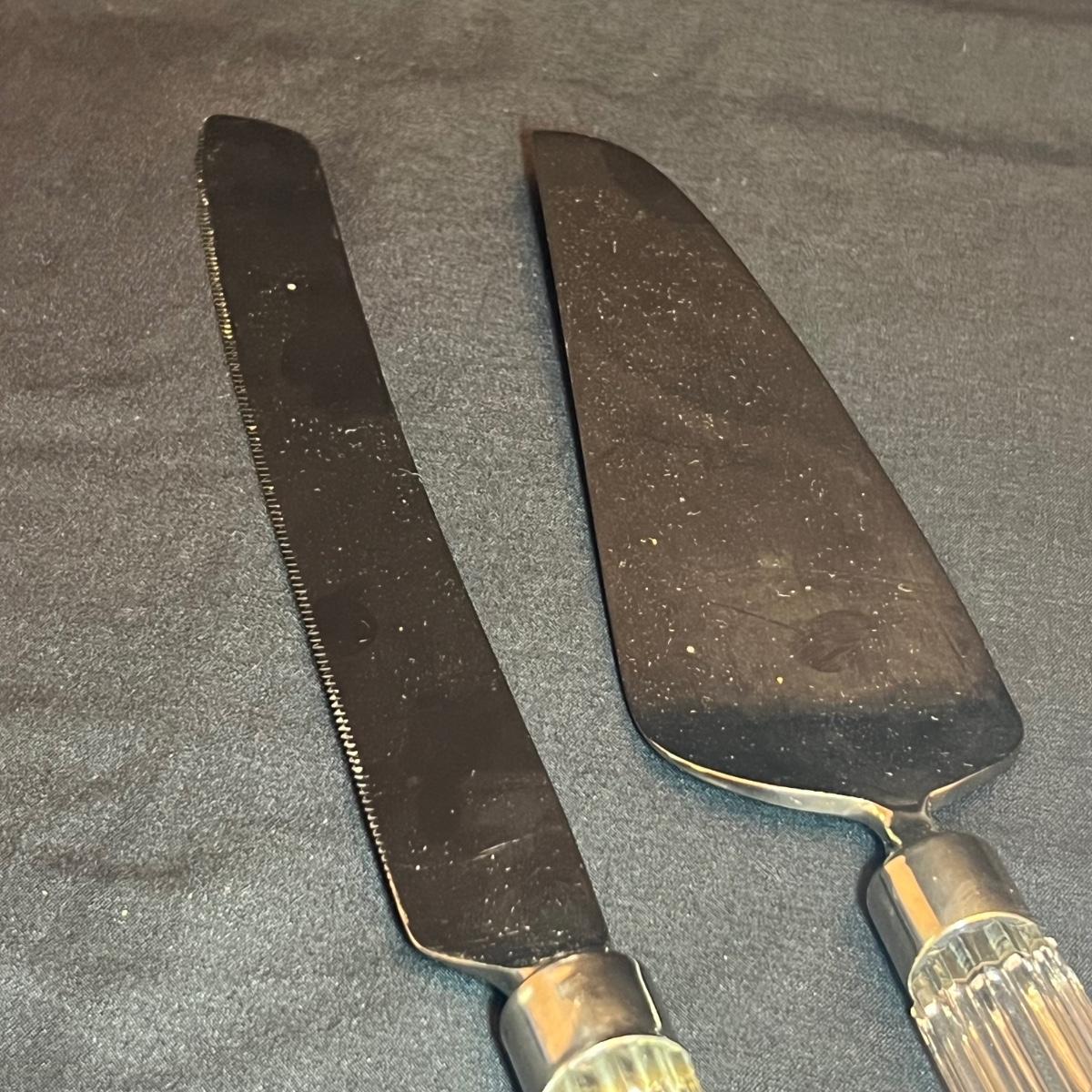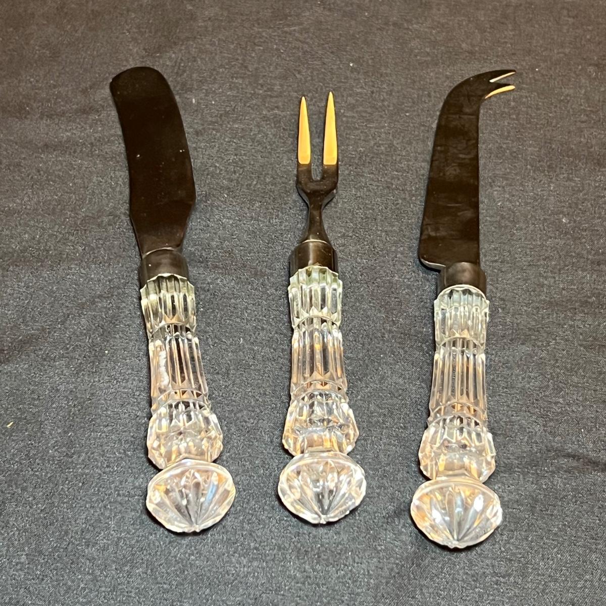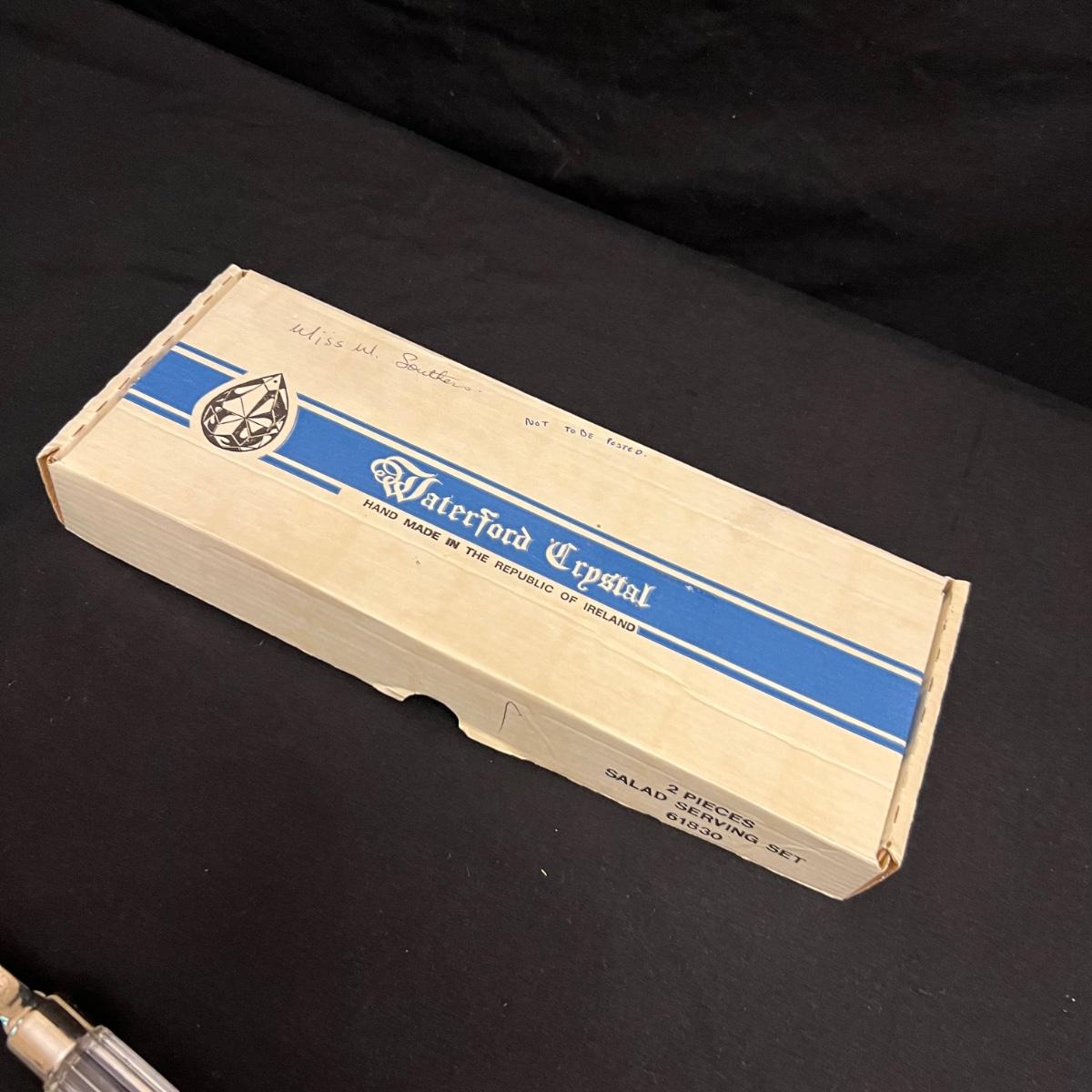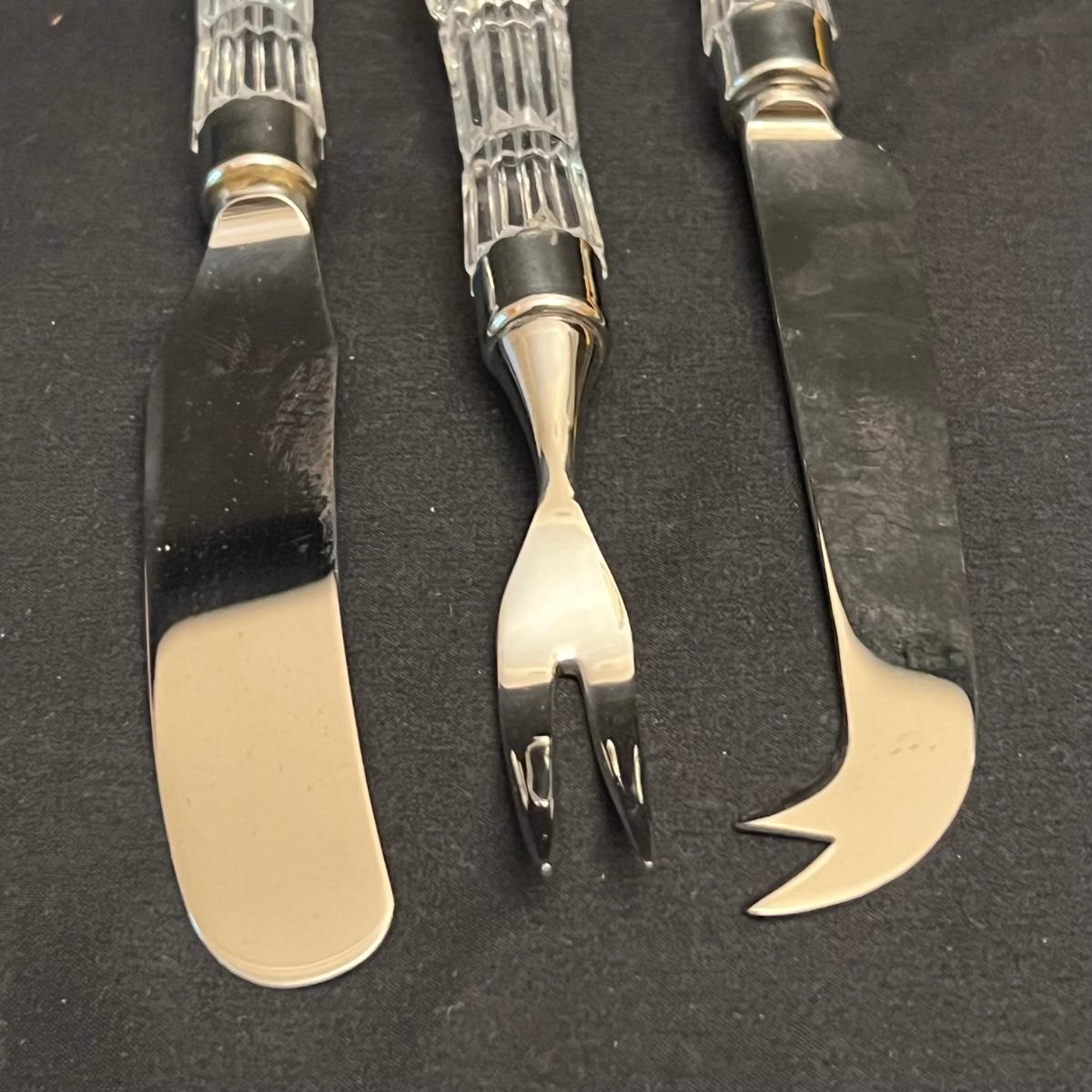 Nine Crystal handled serving utensils altogether. Two sets of salad serving utensils comes with a box for one set. Two knives, fork and includes a pie server. Waterford markings are hard to see but are on all handles.