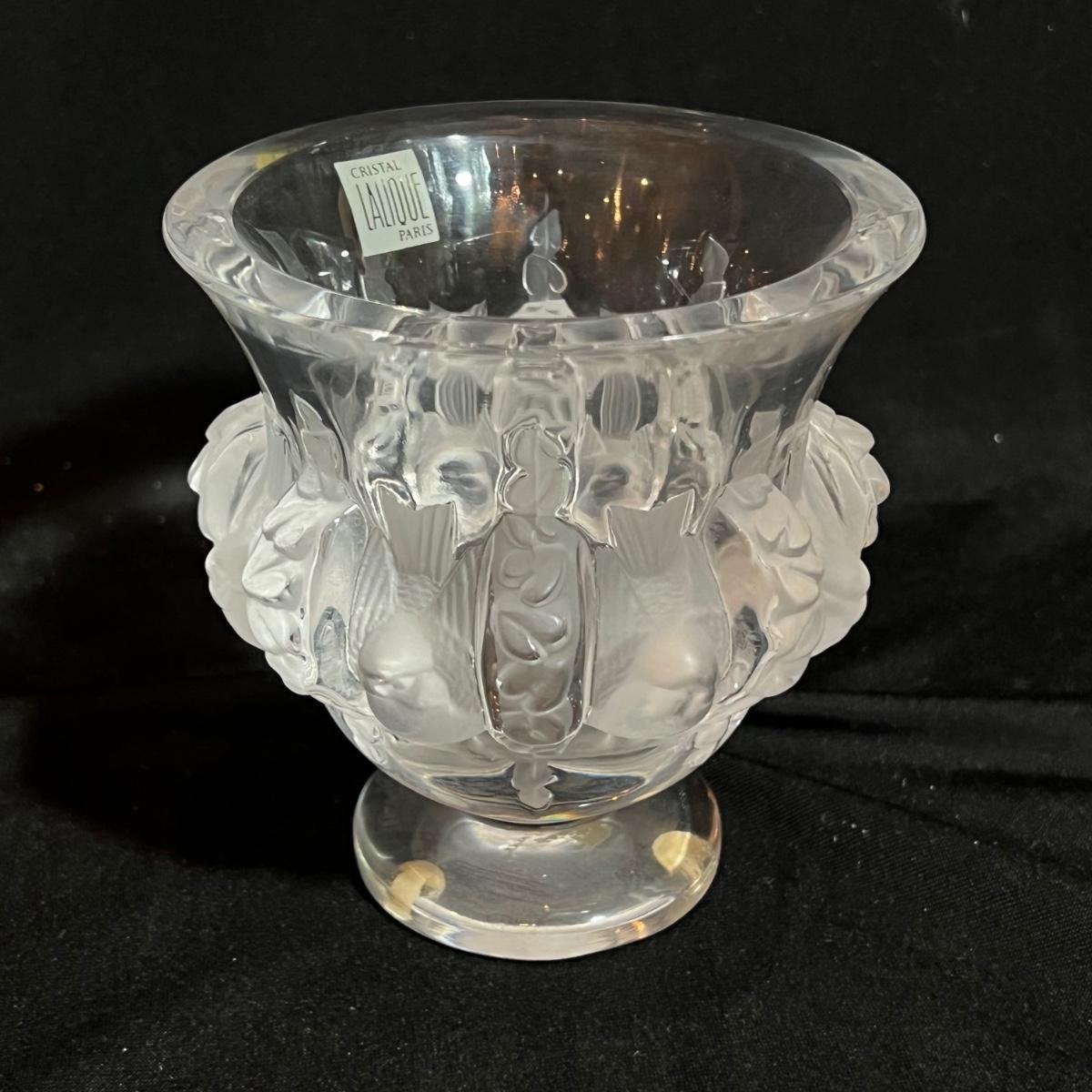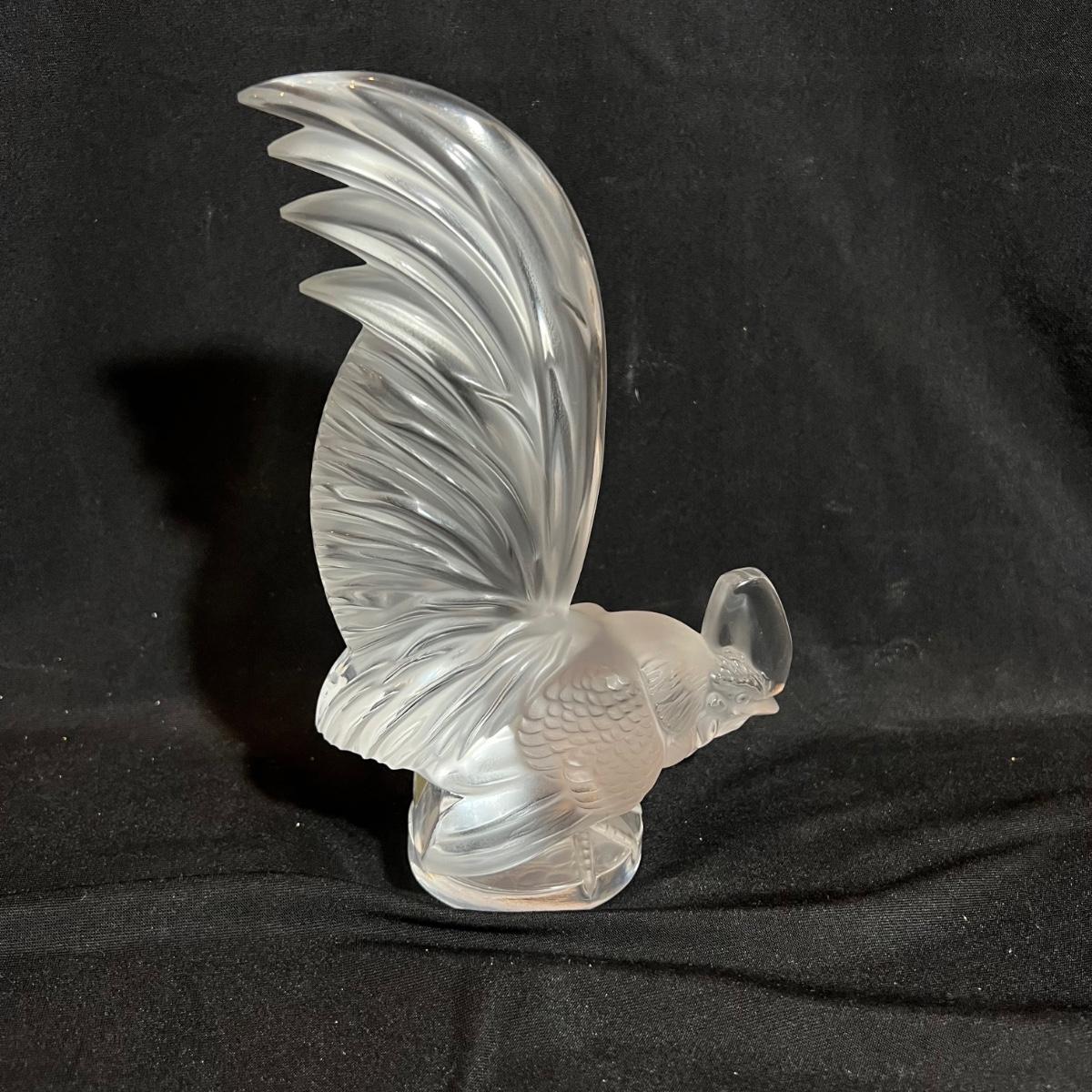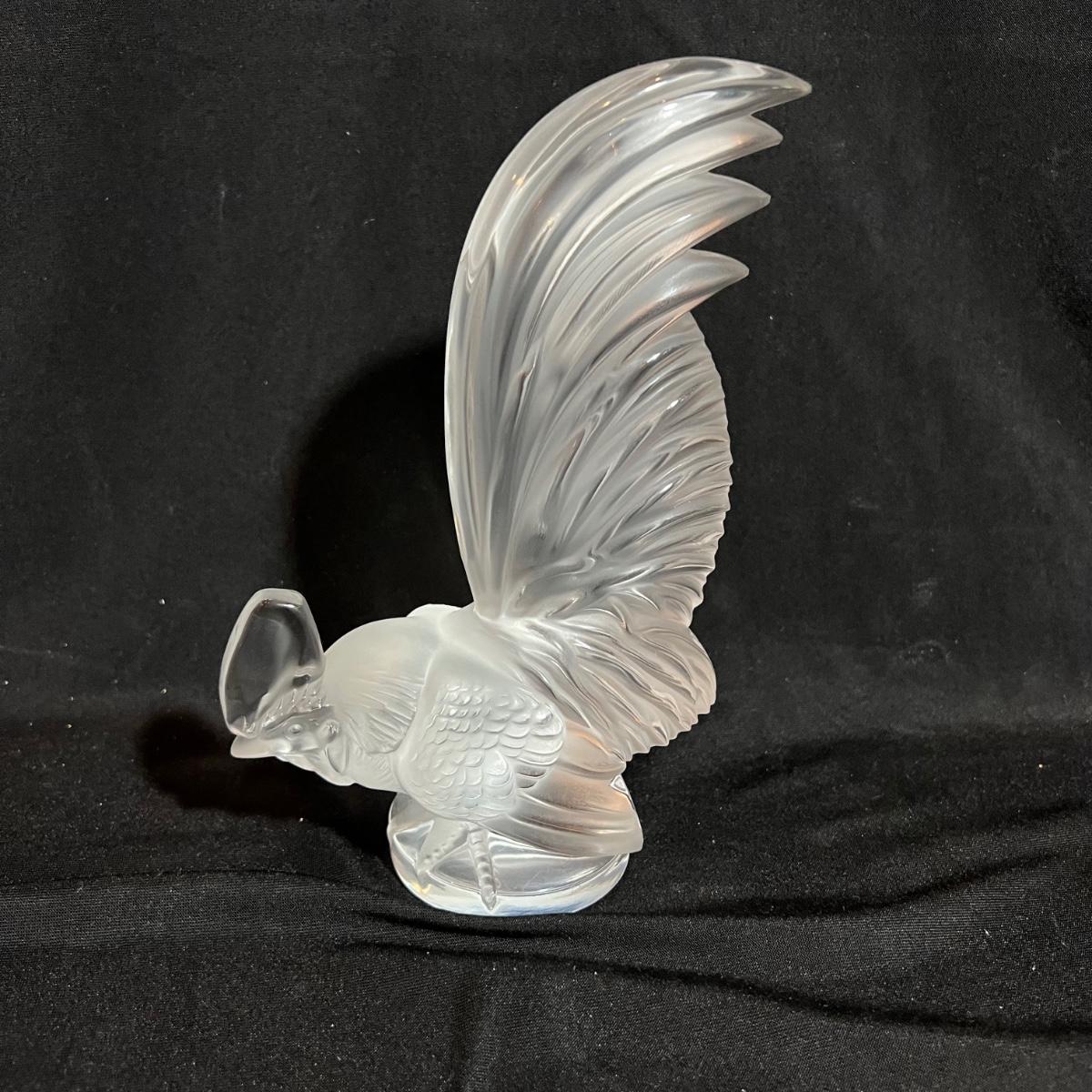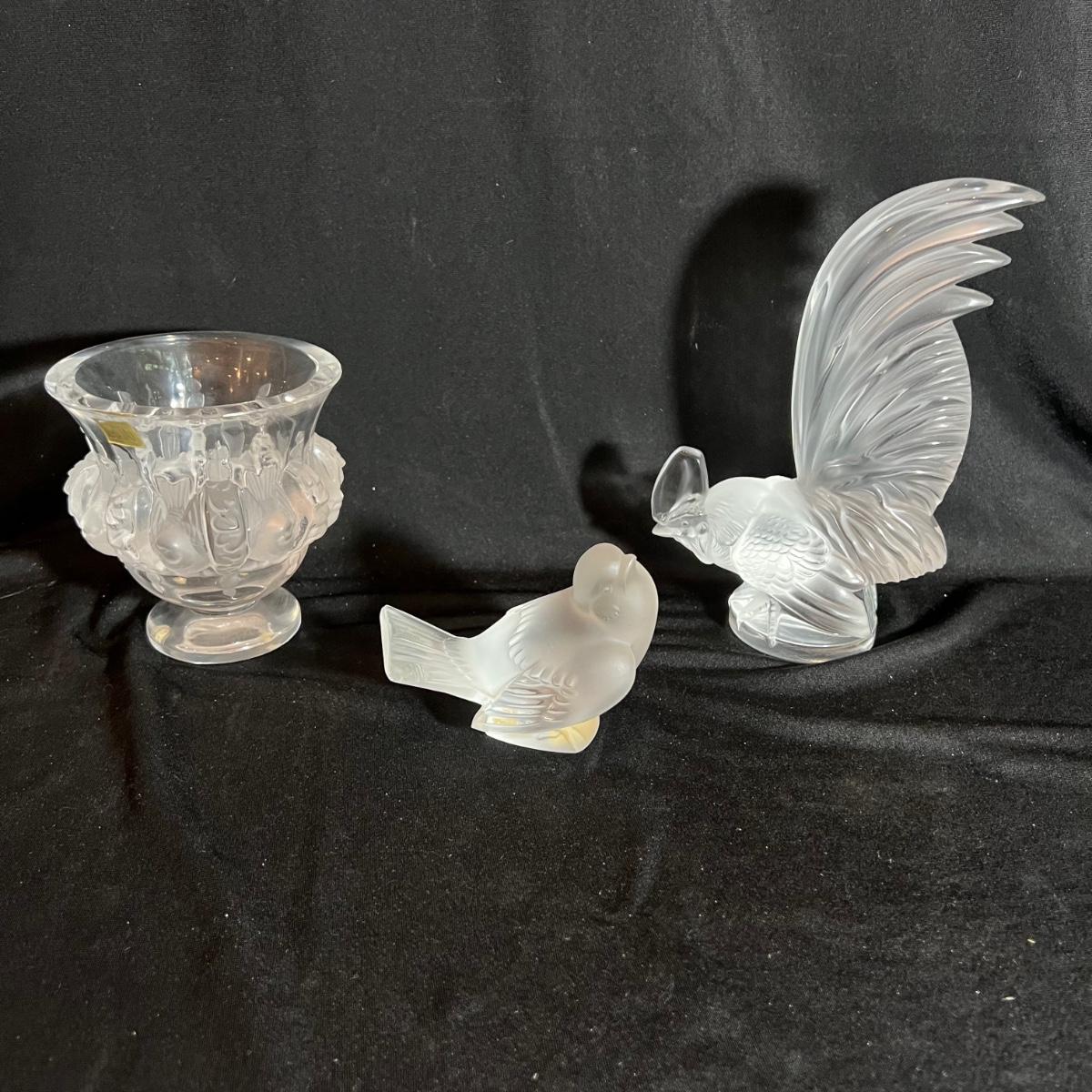 Three beautiful Lalique crystal pieces. The bird is largely frosted crystal and measures approximately 4.25” x 2.5” x 3.5”H. The rooster also largely frosted measures approximately 5.25” x 3” x 8.5”H. The bird urn measures 4.5”D x 5”H.