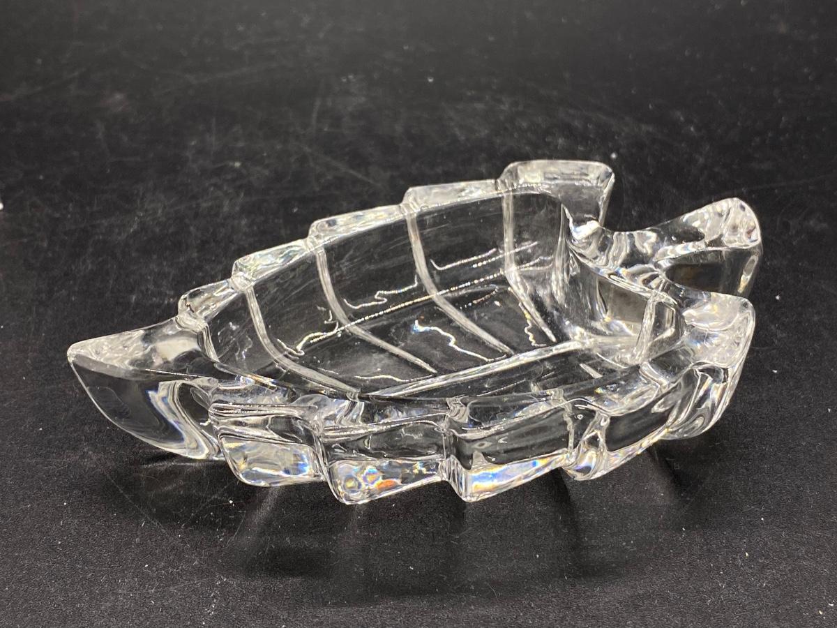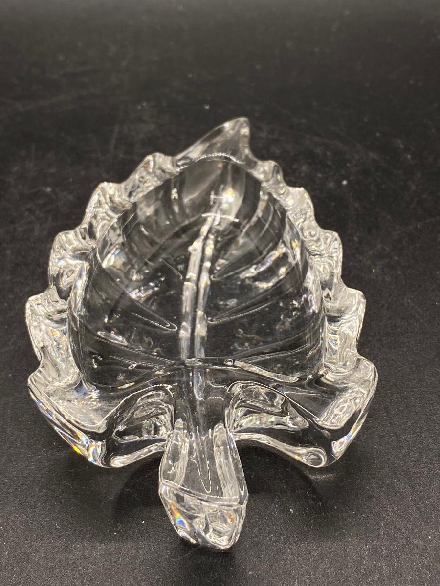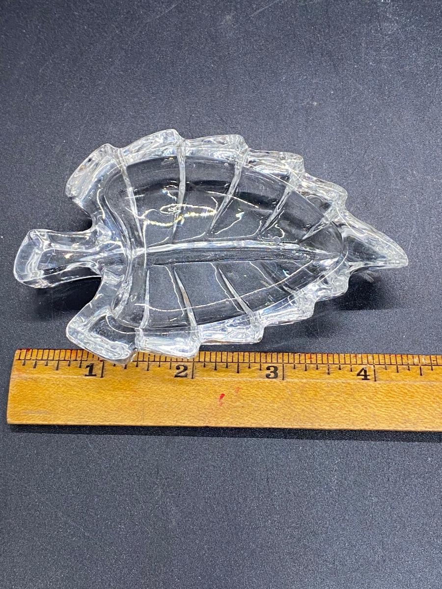 Small crystal leaf shaped trinket dish. Thick glass, good condition. About 4" length.