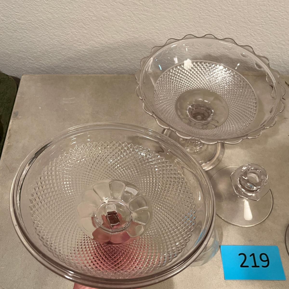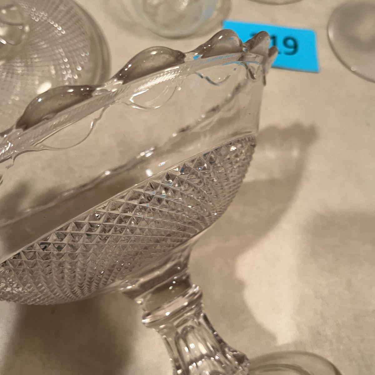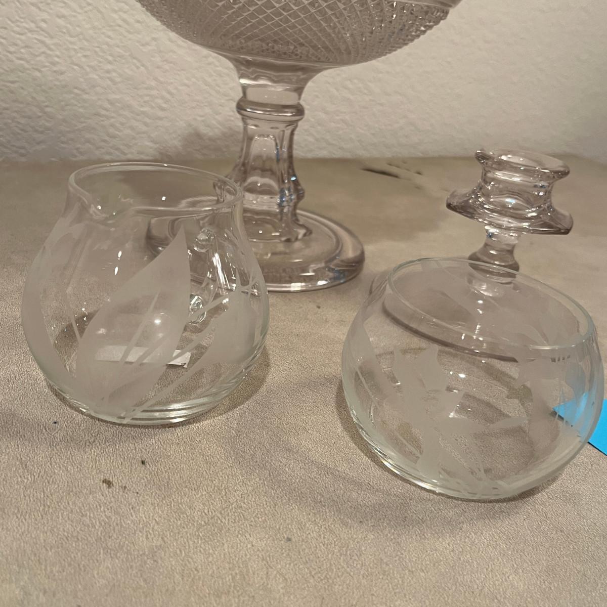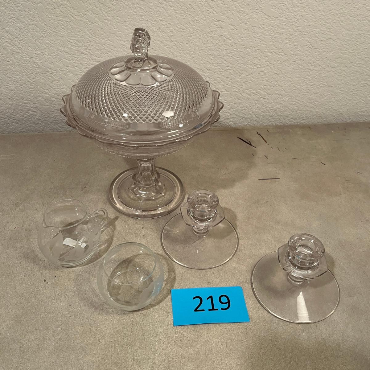 Antique Covered Compote, Fostoria Candles. Deep etched Cream & sugar. No damage.