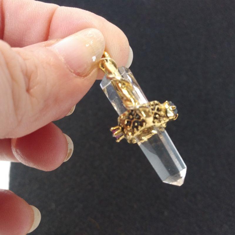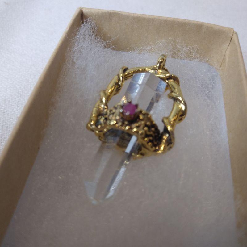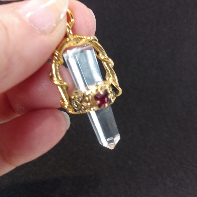 This lot is a petite and lovely clear faceted crystal with gold-washed adornment with a Ruby CZ on both sides - Pendant. It measures 1 1/2-inches long. Reserve/Starting Bid is $10.
