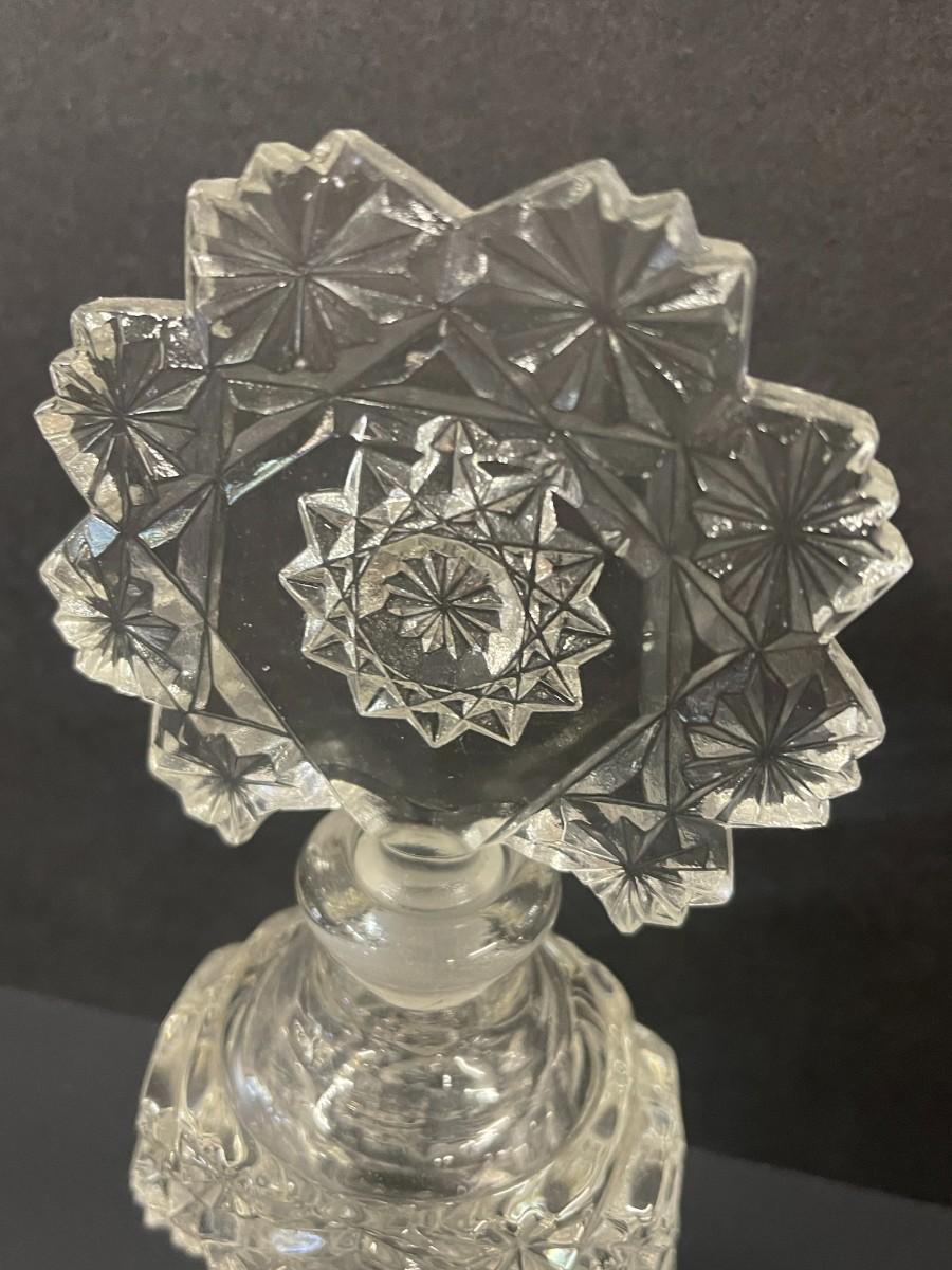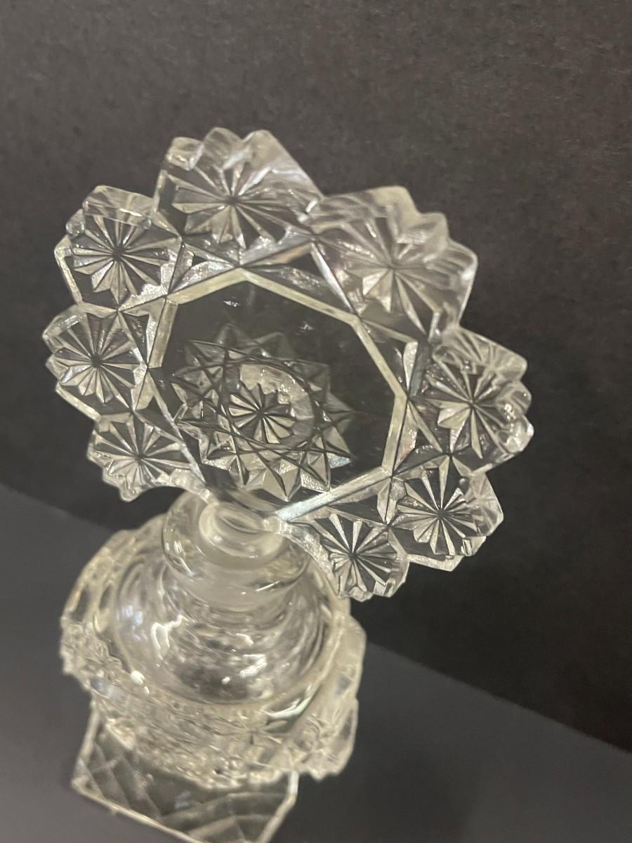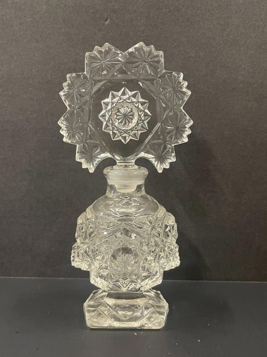 Clear crystal perfume bottle with matching stopper, excellent condition.