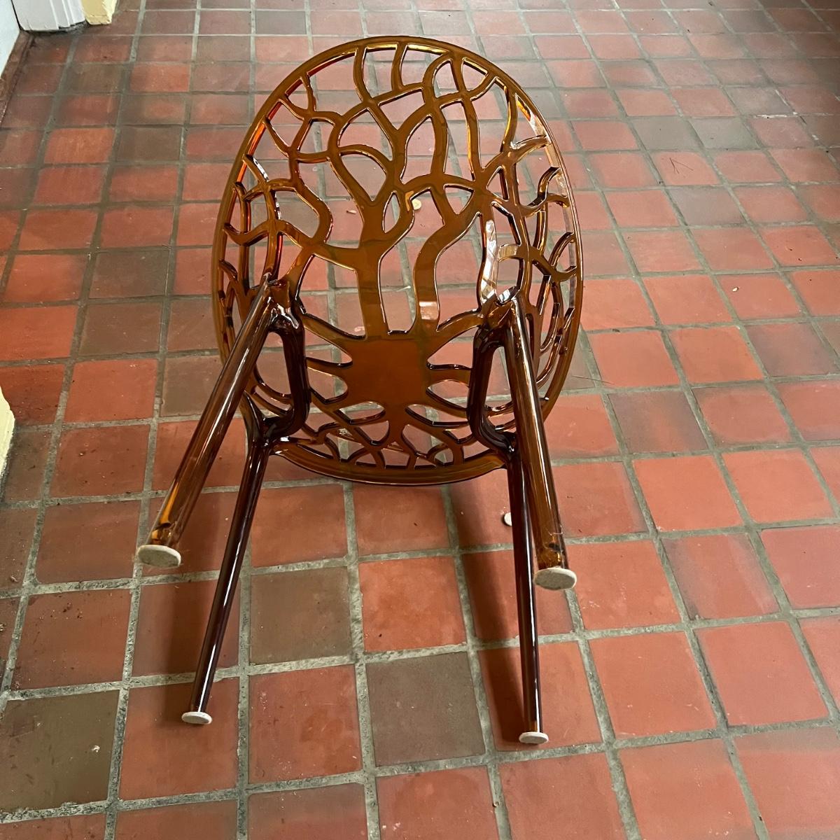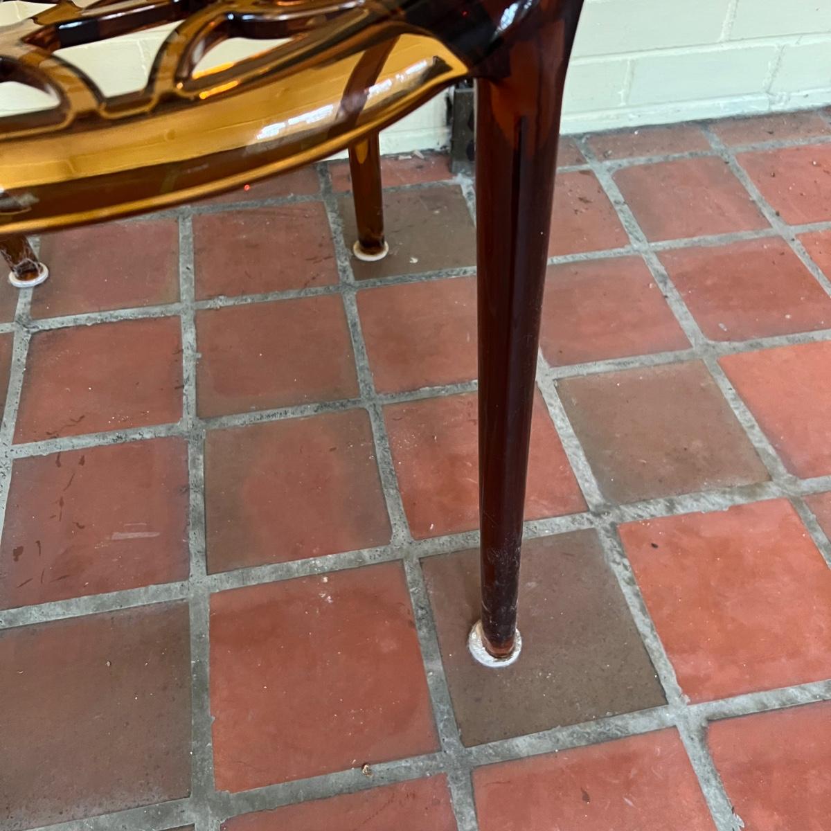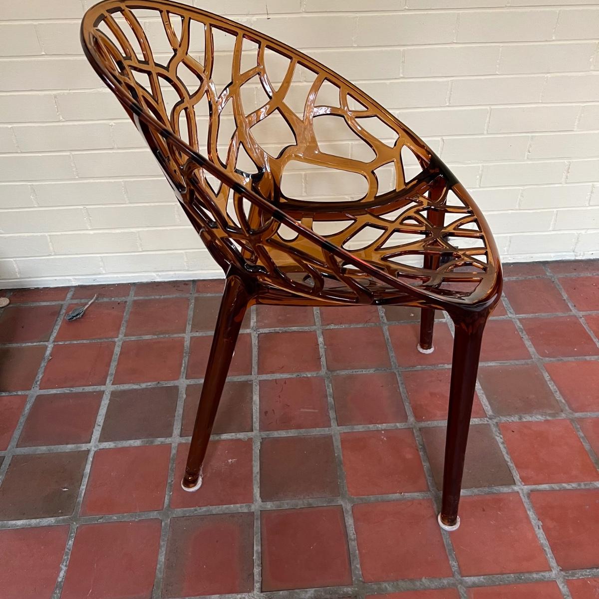 This amber color chair is as comfortable as it is good looking! Information found online suggests this is made of very durable polycarbonate. This chair is stackable. A pair of clear colored matching chairs are available in another lot in this sale.