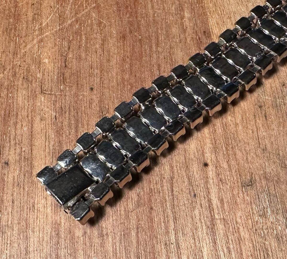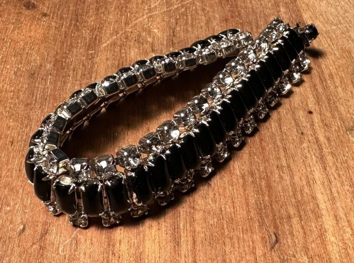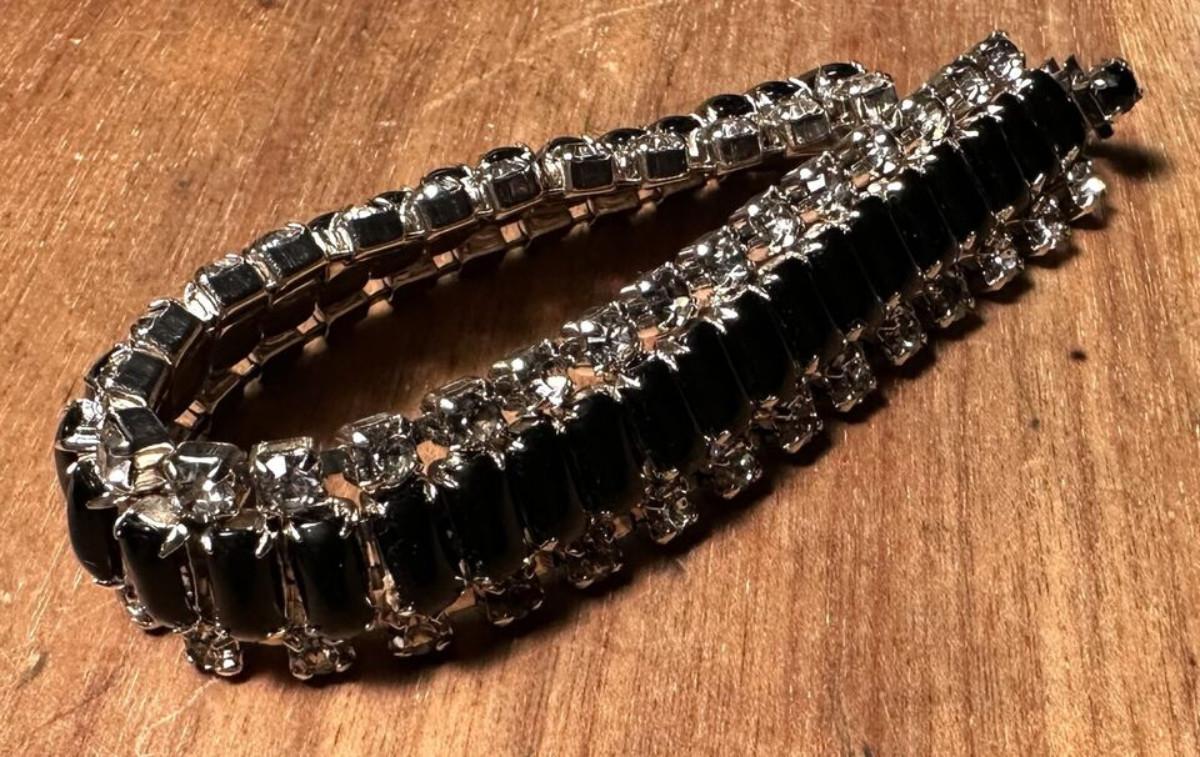 Here is a stunning bracelet with black onyx baguettes and round cut crystal rhinestones on silvertone settings...6 1/2" long..3/4" wide..Unknown maker on this quality vintage fashion jewelry...Estate find…