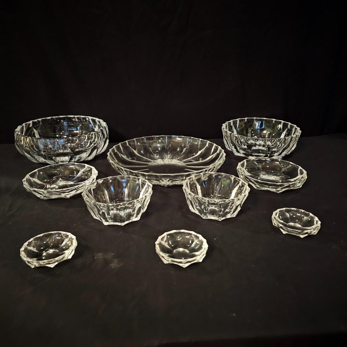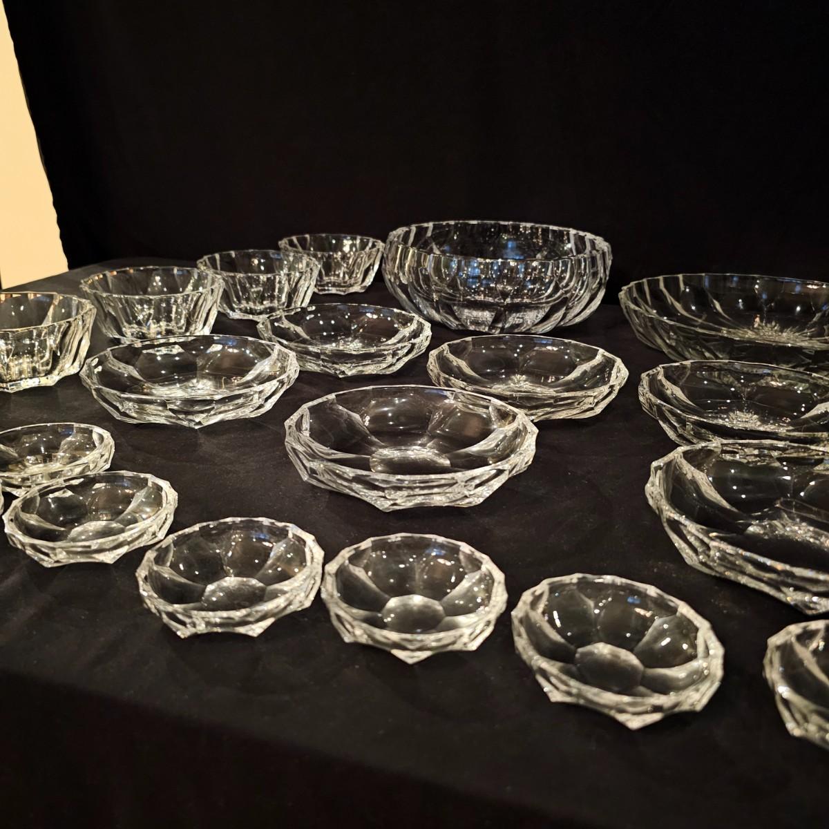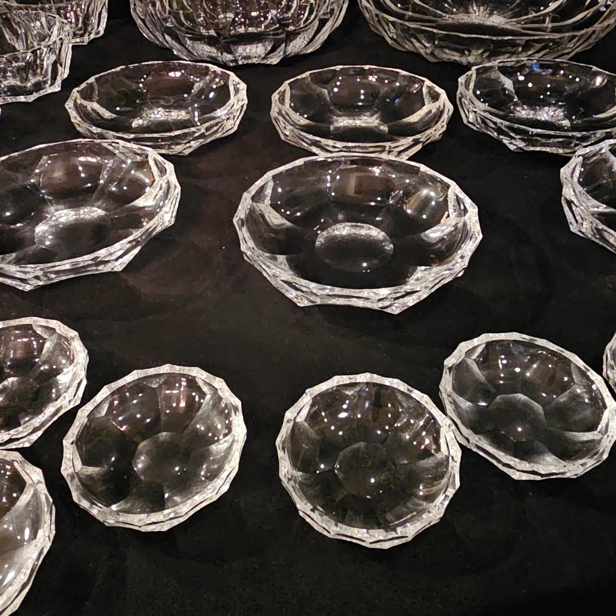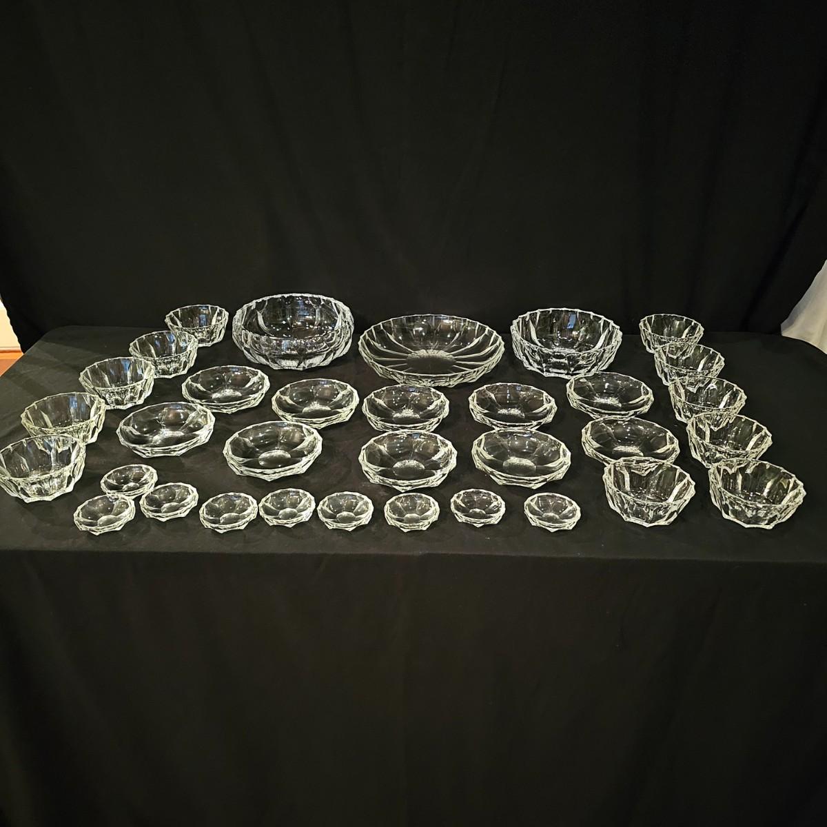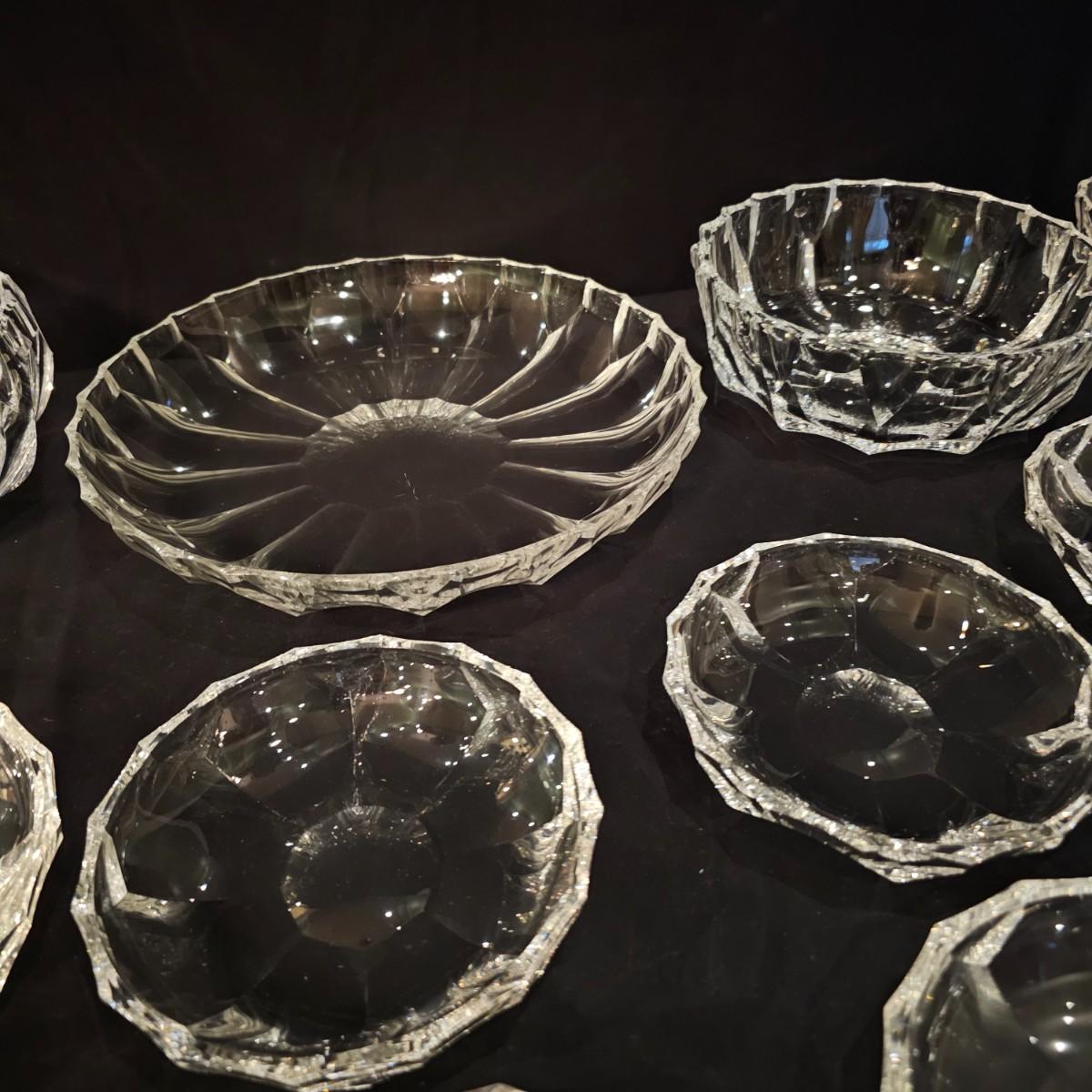 33 pieces of heavy crystal plates, bowls and side dishes. Items all have same cut pattern, no other markings. Large plate is 11" D x 2"H, large bowl is 9.5" D x 3"H. Flat side bowl is 5.75" D x 1.5"H, taller side bowl is 4.5" D x 2"H. Small bowls are 3" D x .75" H. See photos for details. Shipping available.