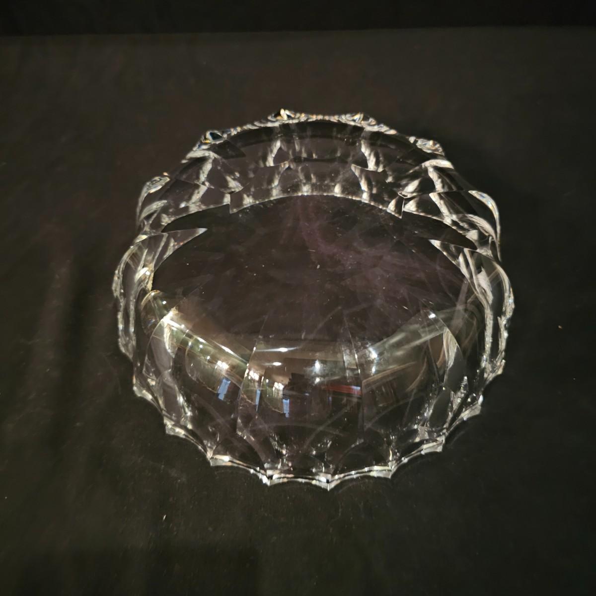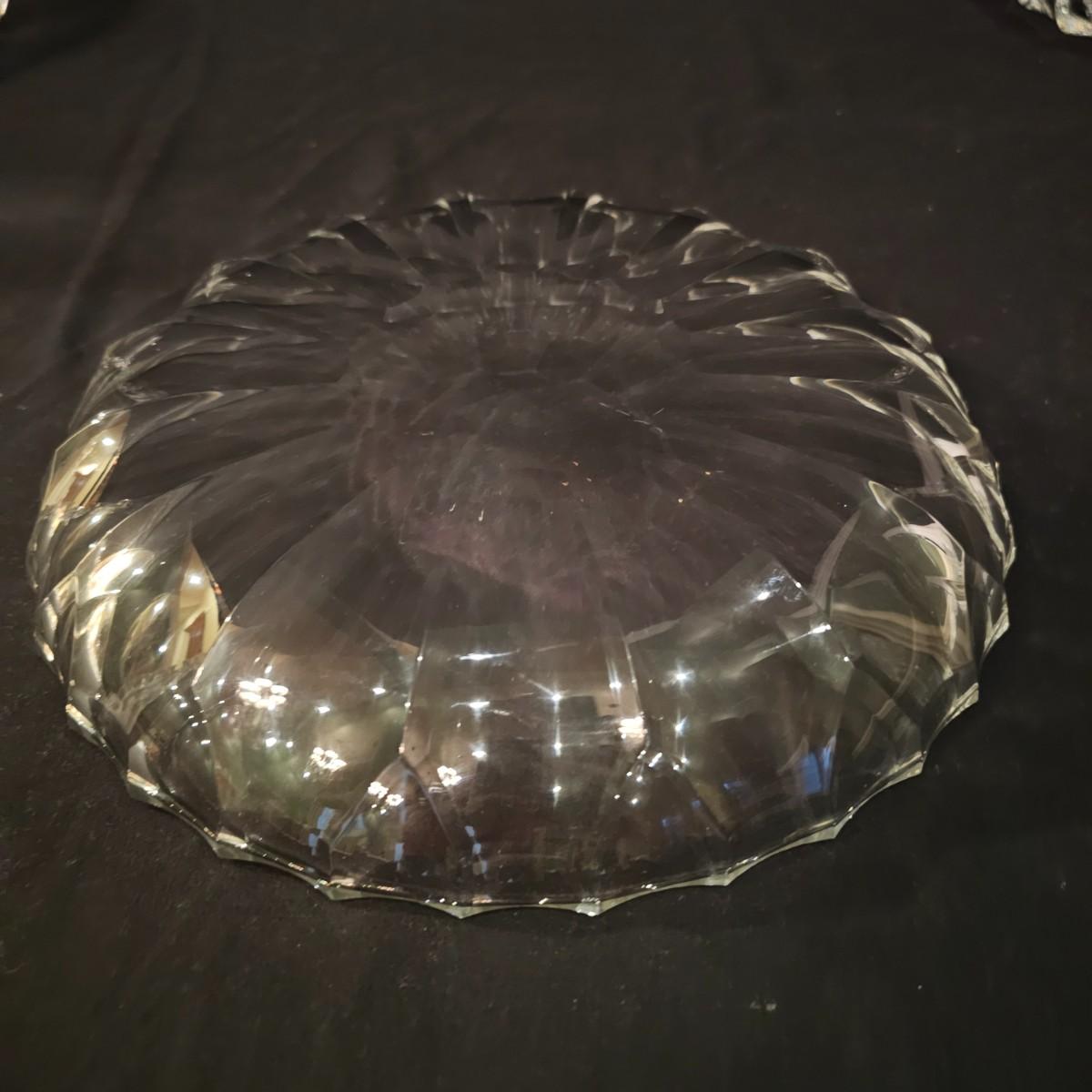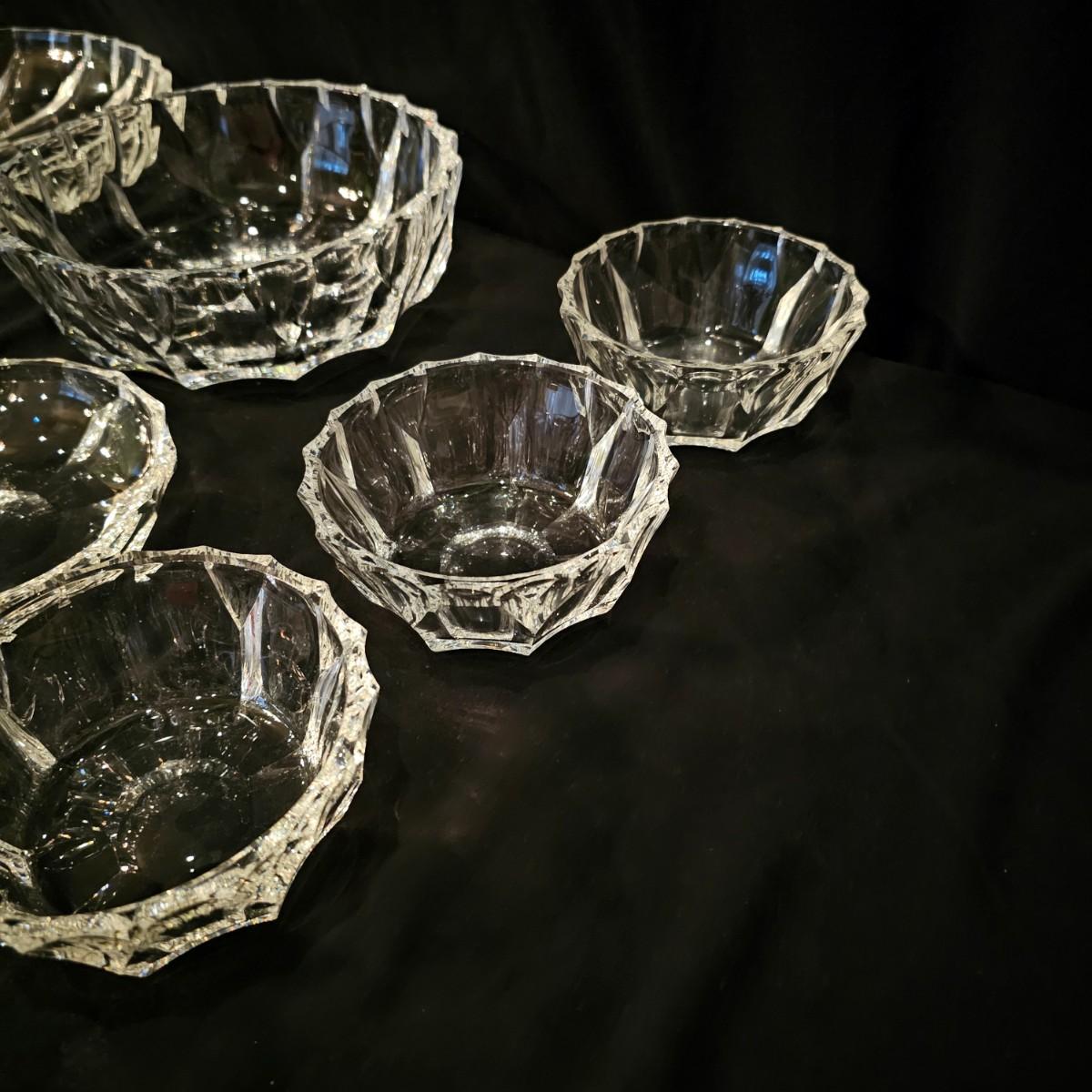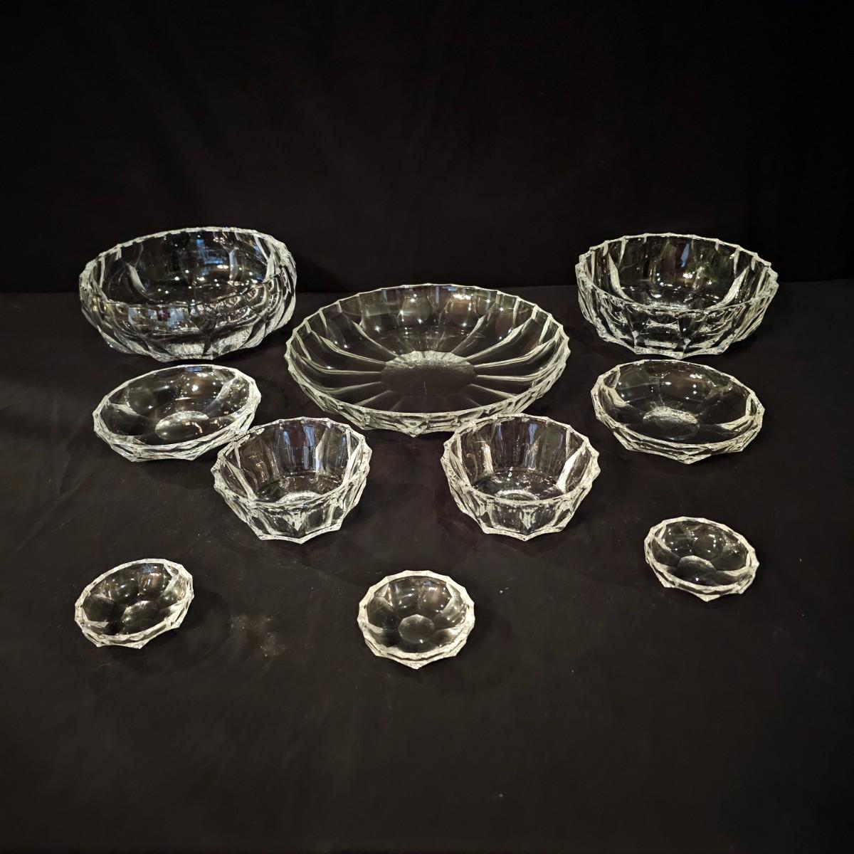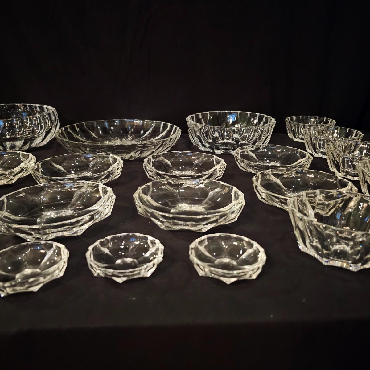 33 pieces of heavy crystal plates, bowls and side dishes. Items all have same cut pattern, no other markings. Large plate is 11" D x 2"H, large bowl is 9.5" D x 3"H. Flat side bowl is 5.75" D x 1.5"H, taller side bowl is 4.5" D x 2"H. Small bowls are 3" D x .75" H. See photos for details. Shipping available.