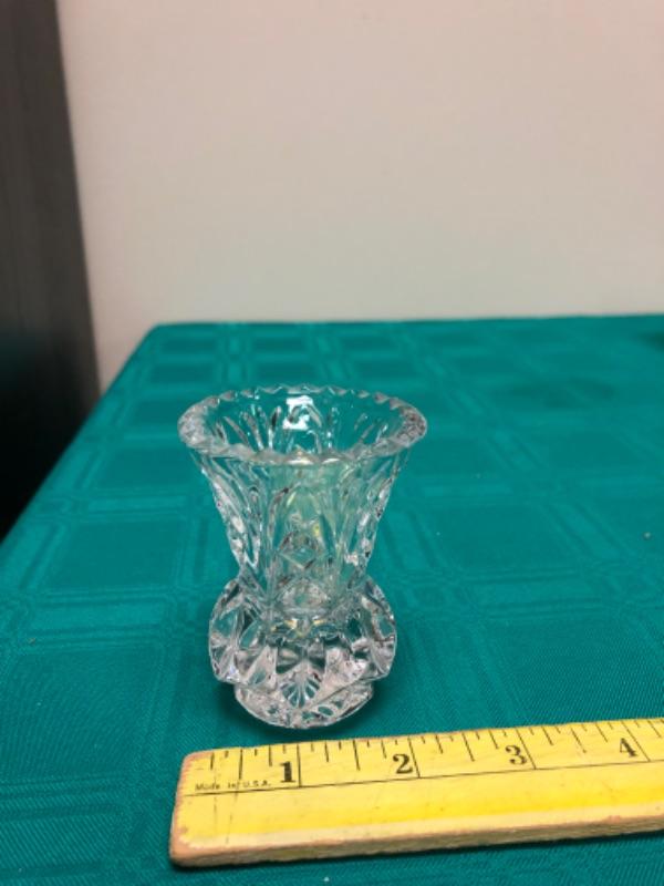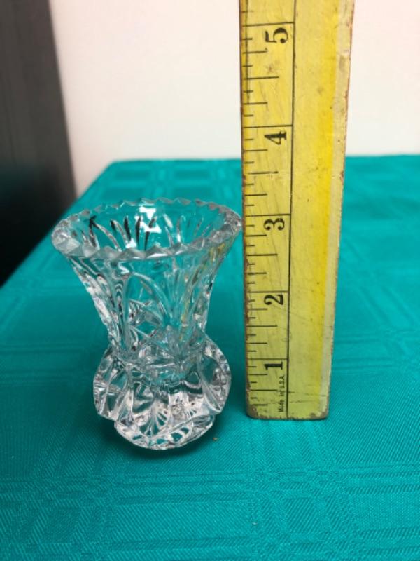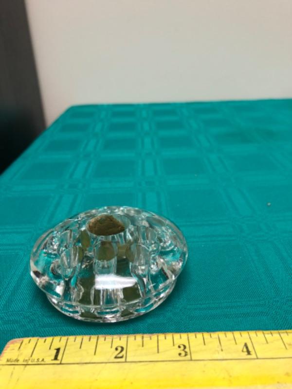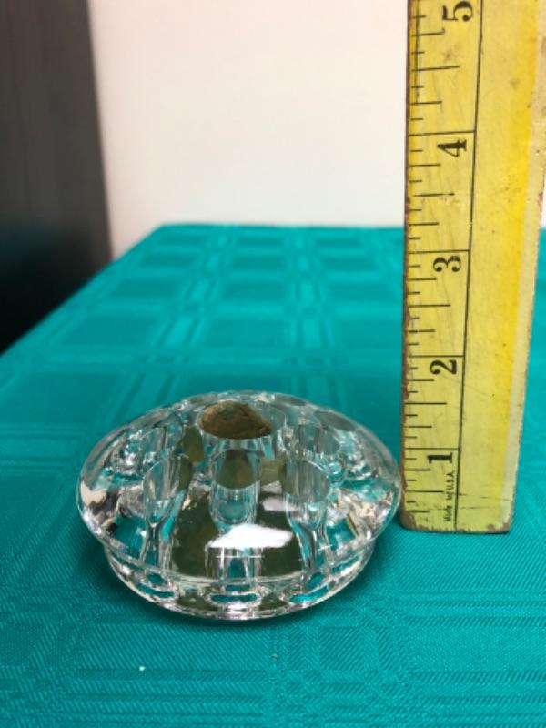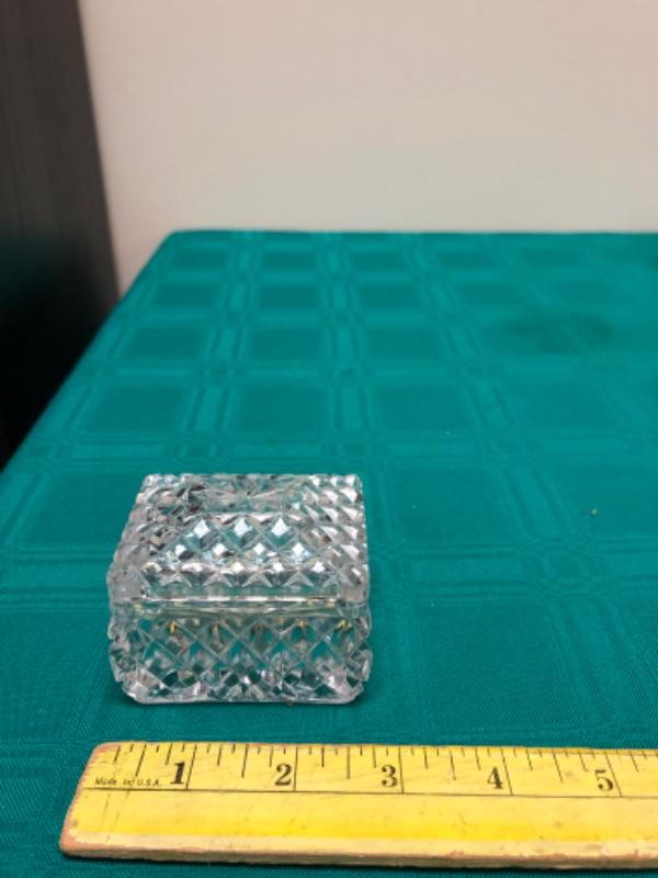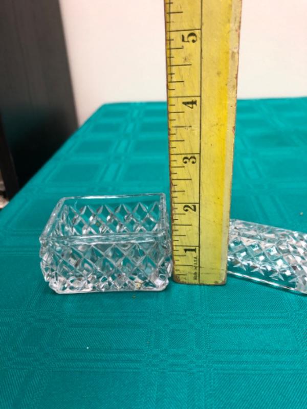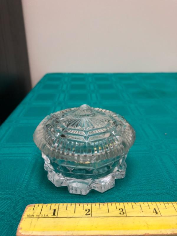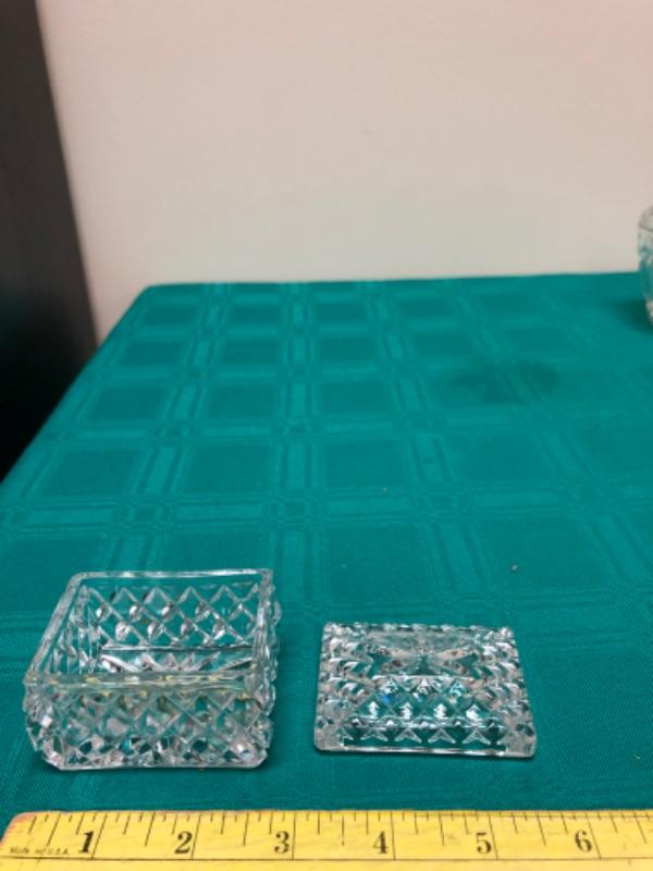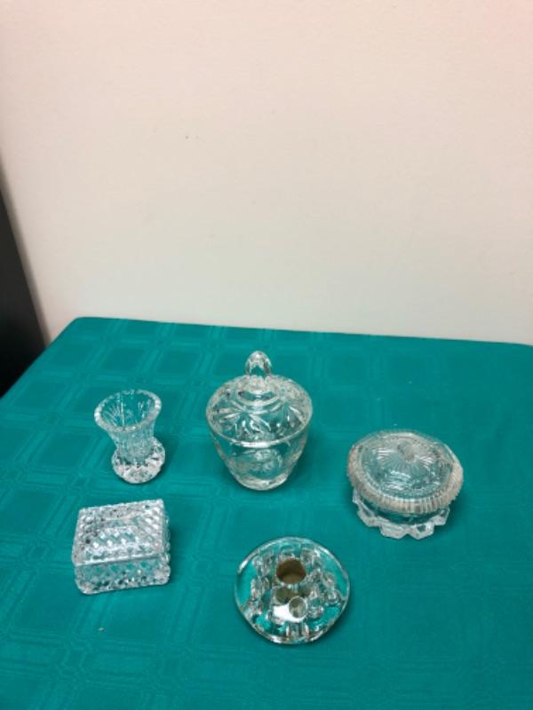 Misc. small crystal decor lot. Lidded trinket dishes, a flower frog, and a toothpick holder.