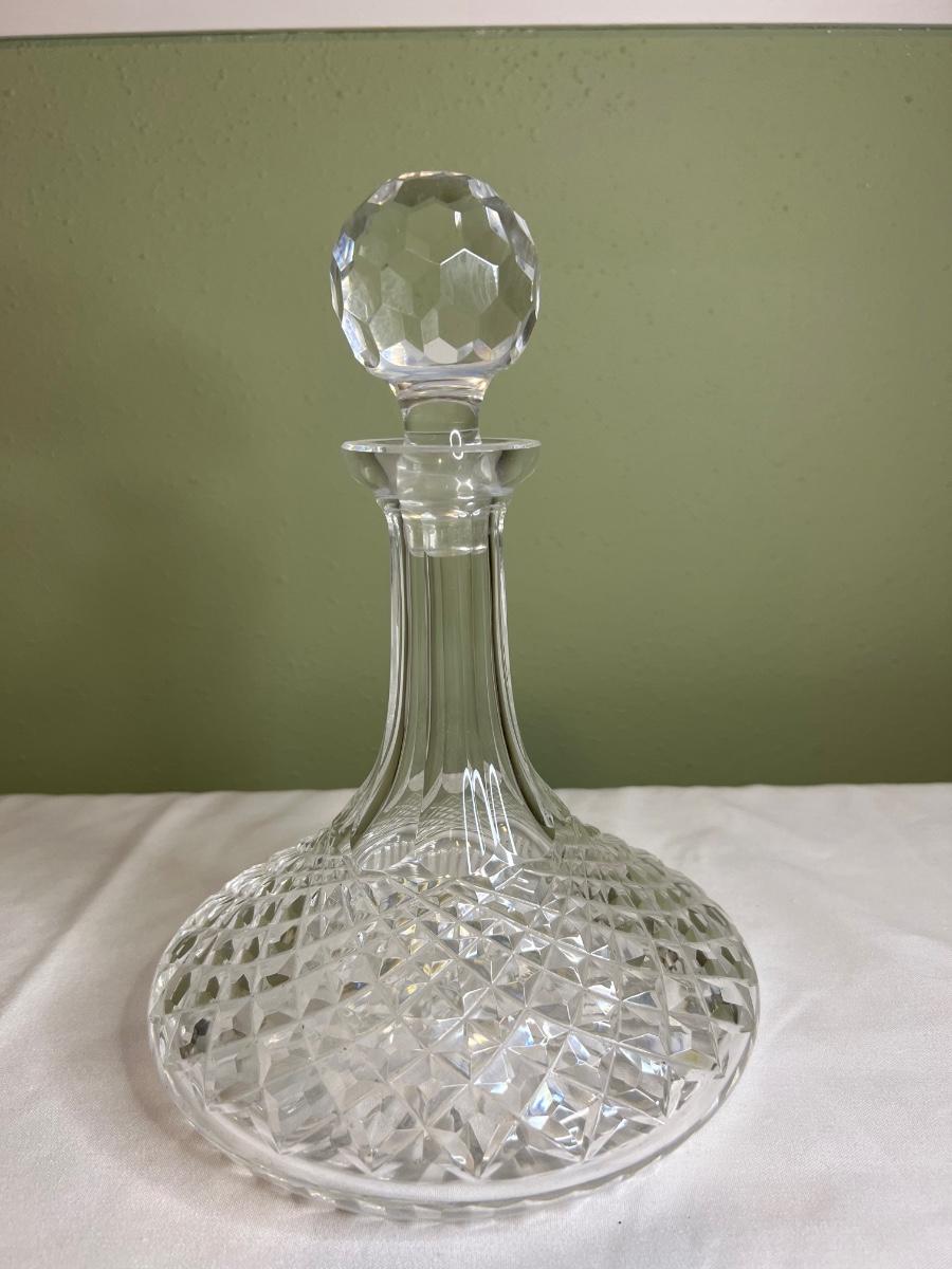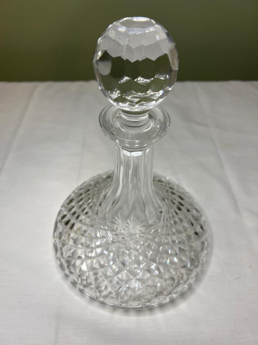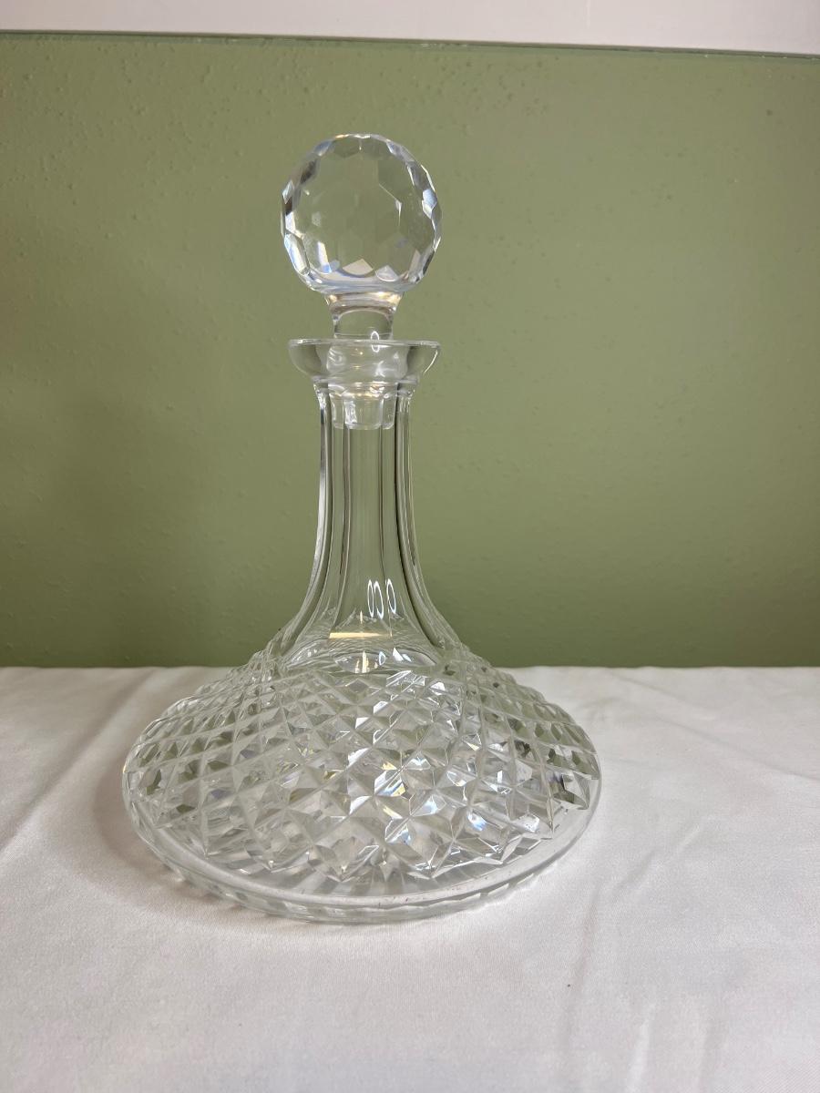Crystal Ships Decanter and Crystal Stopper. Measures 10” tall, 8” wide, 8” Deep