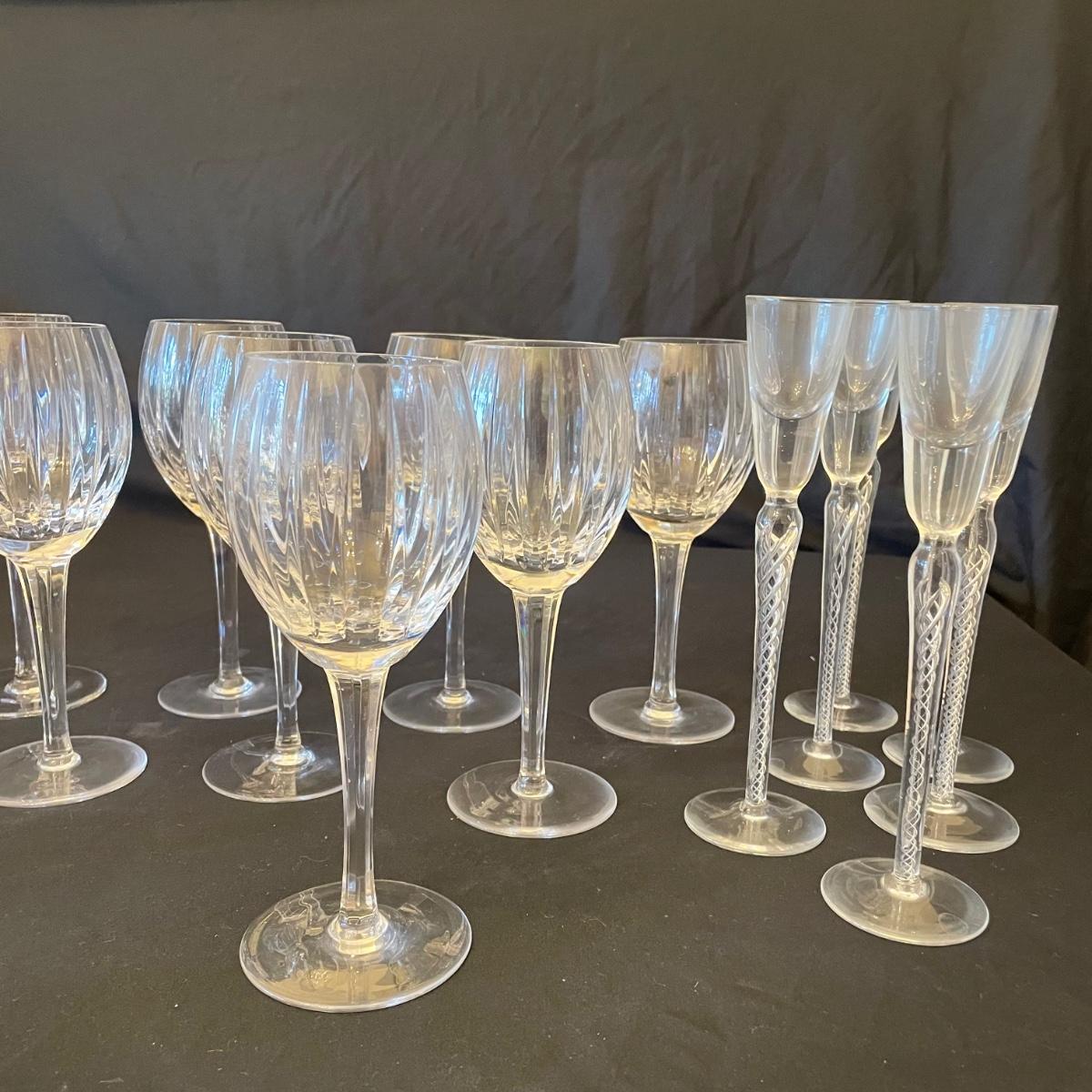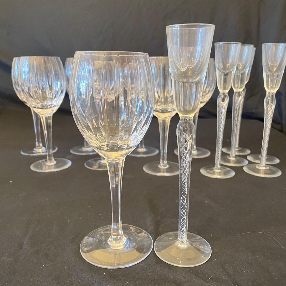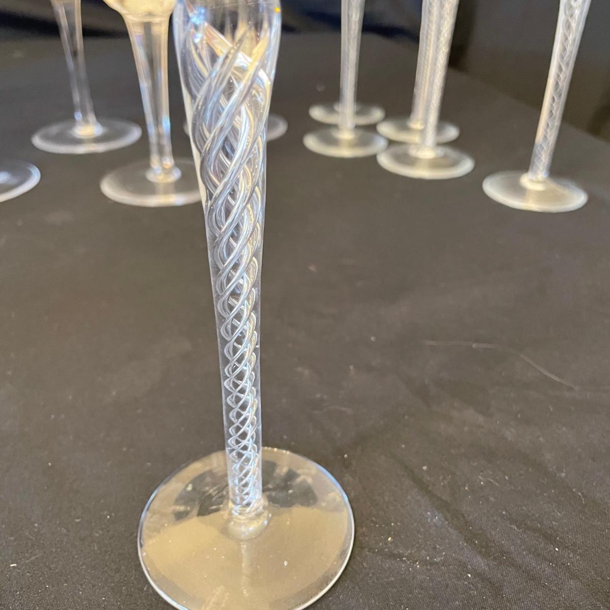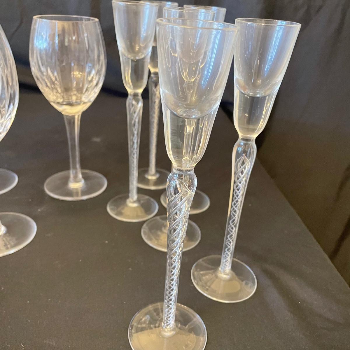 These eight stemmed wine glasses look and feel like Crystal however no markings were found to support this; they are in great condition with no chips or cracks, which can be said also for the accompanying six stemmed cordial glasses that appear hand blown. These glasses have beautiful swirling inner glass design within their stems.