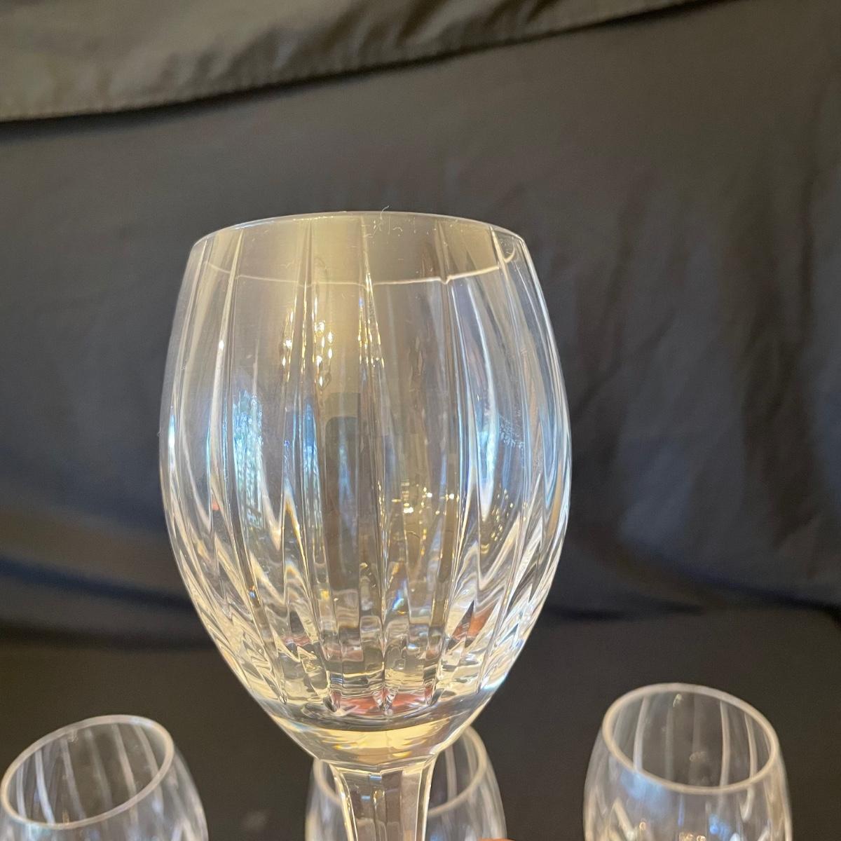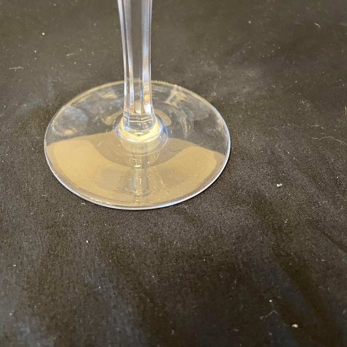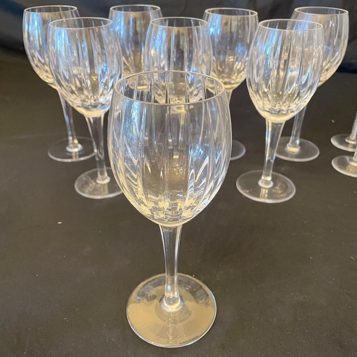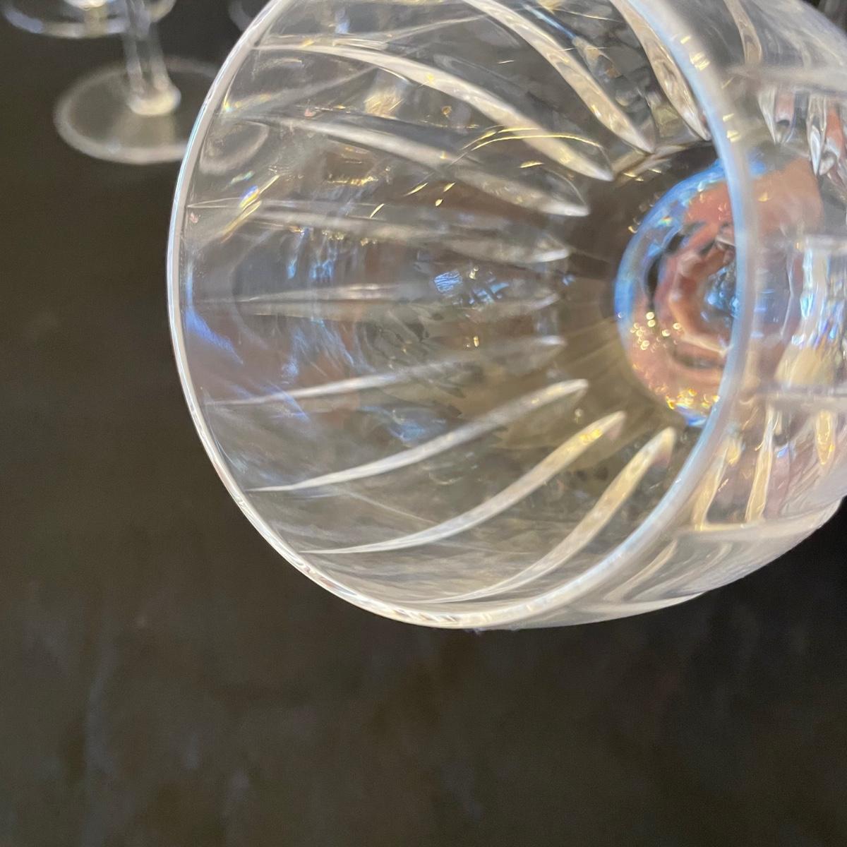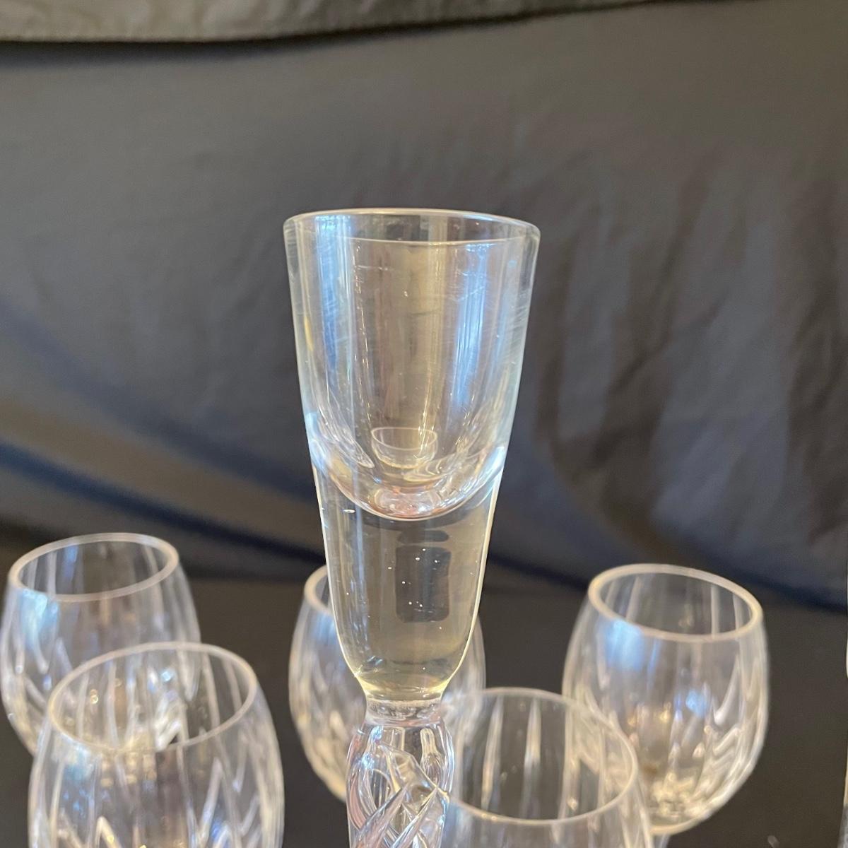 These eight stemmed wine glasses look and feel like Crystal however no markings were found to support this; they are in great condition with no chips or cracks, which can be said also for the accompanying six stemmed cordial glasses that appear hand blown. These glasses have beautiful swirling inner glass design within their stems.