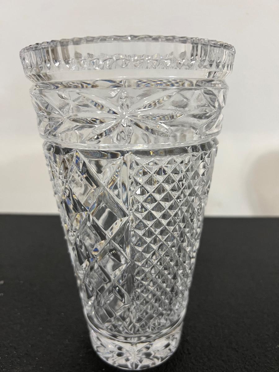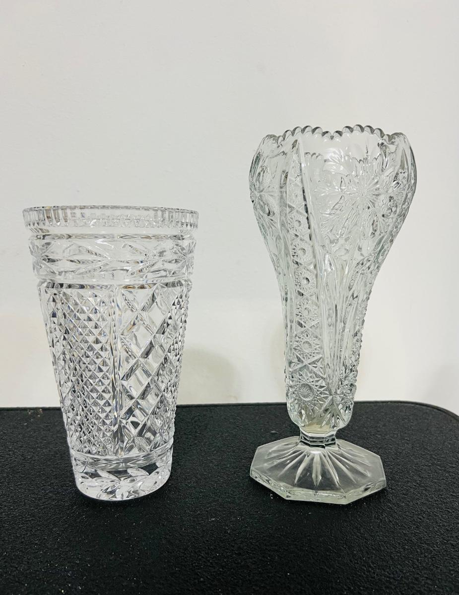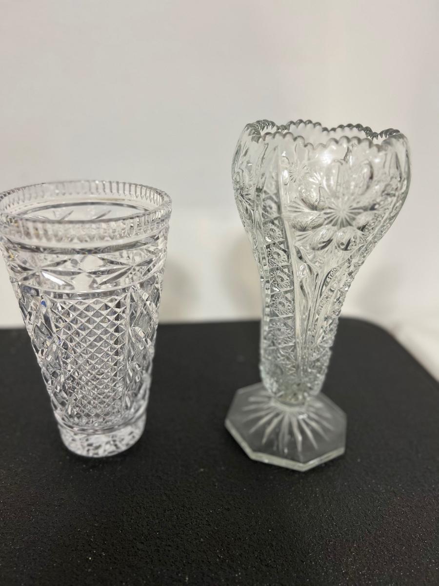 Crystal Vases. Very detailed crystal vase with flower measures 10 1/2 inches tall and 5 inches wide. Second variants of cut crystal measures 8 1/2 inches tall, 5 inches wide.
