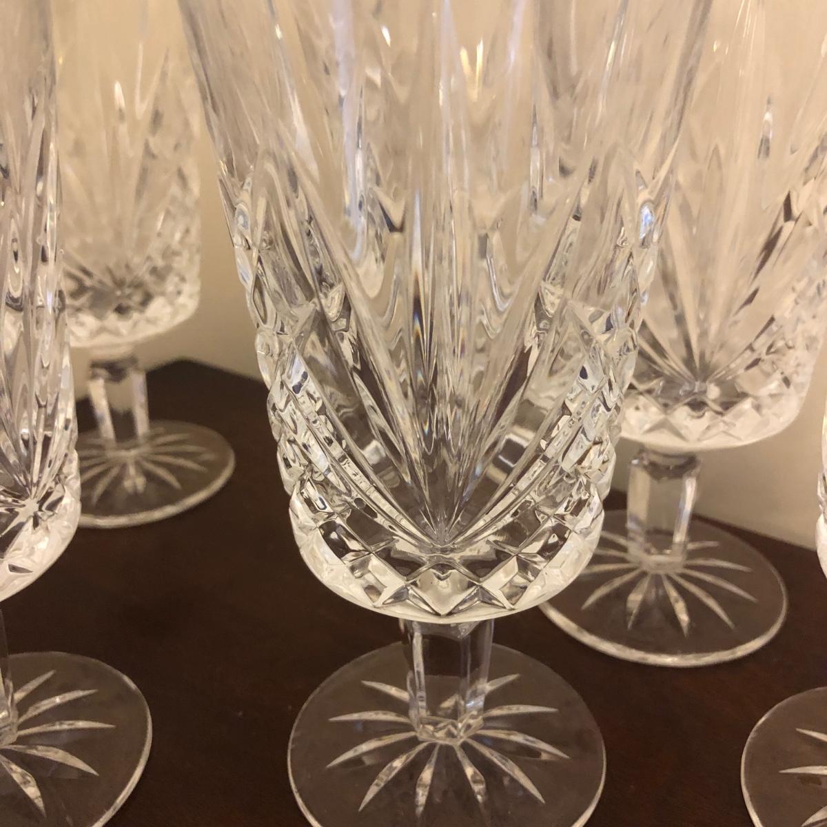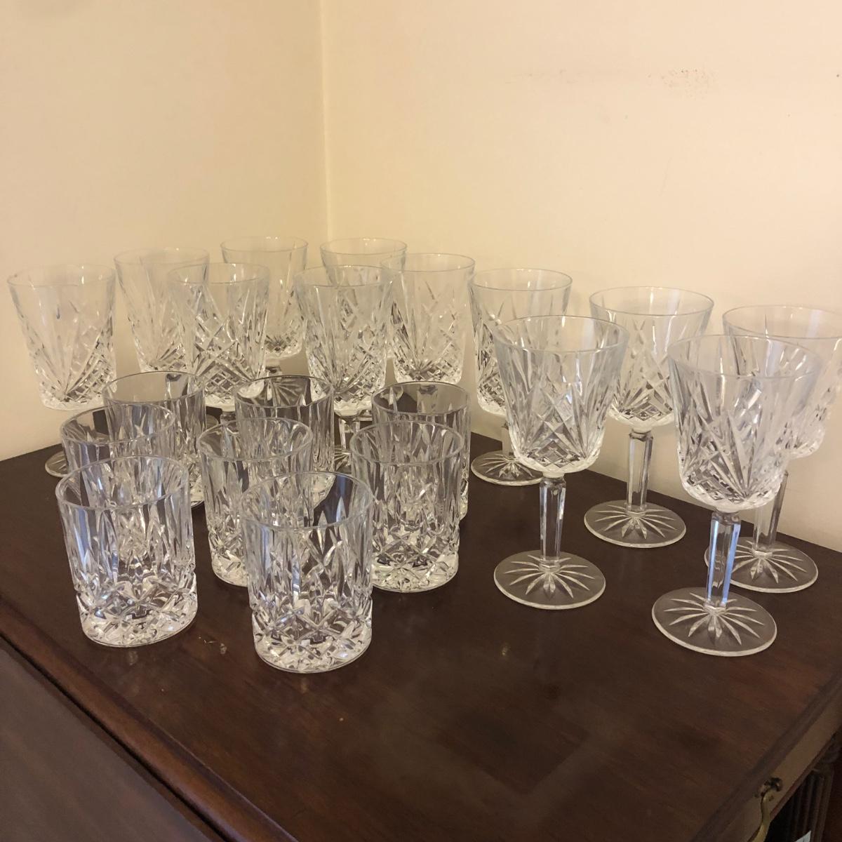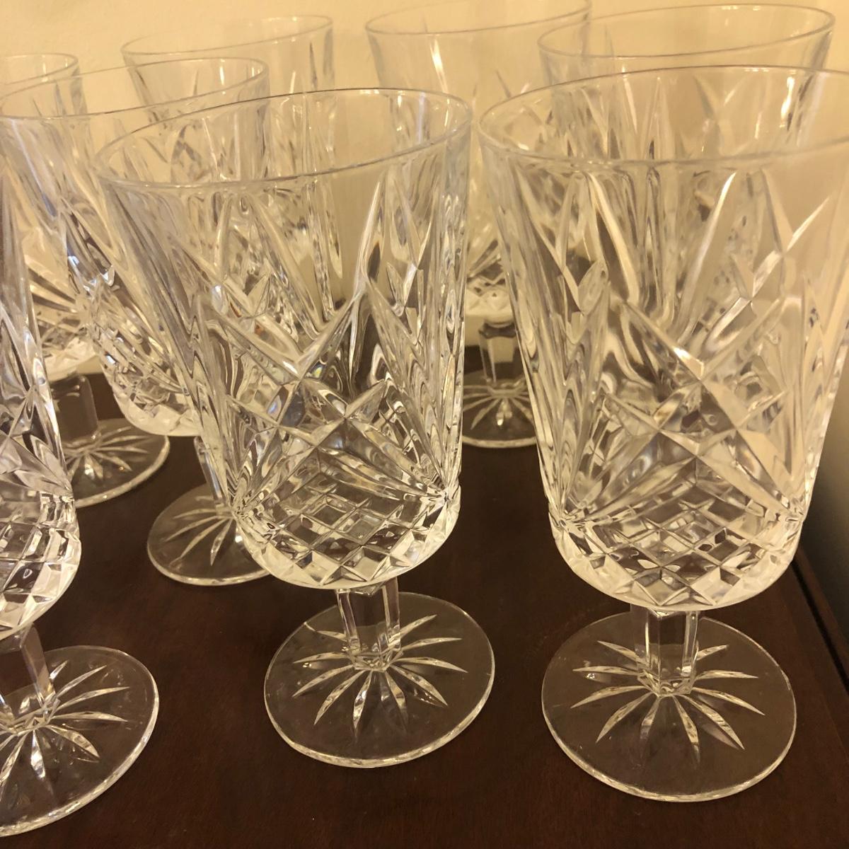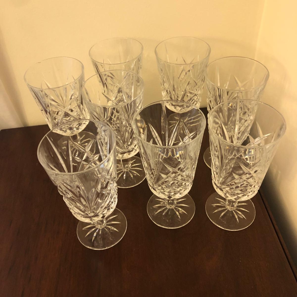 These heavy crystal glasses are comprised of eight wine glasses (four were added later), eight highball glasses and eight water glasses. Shipping Available.