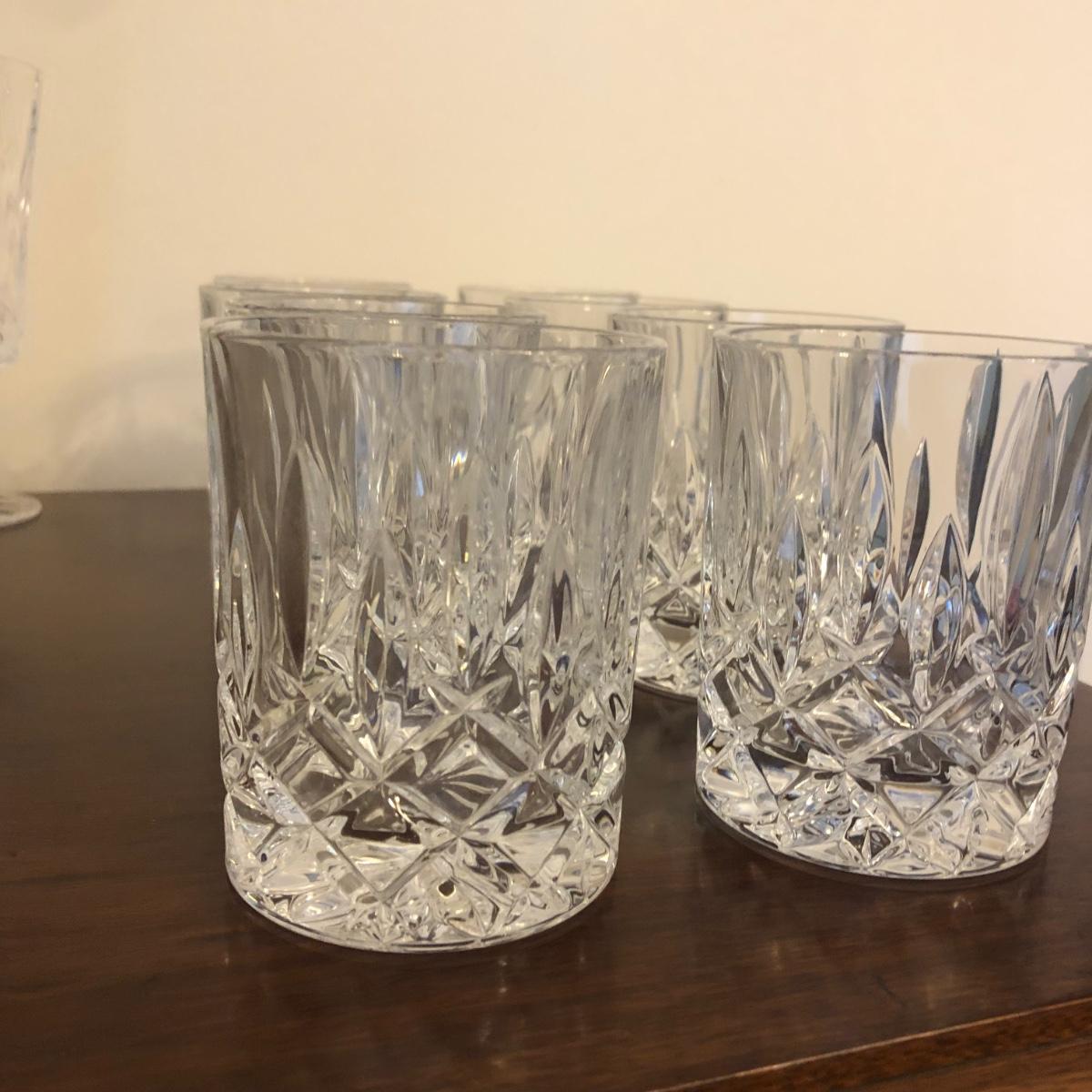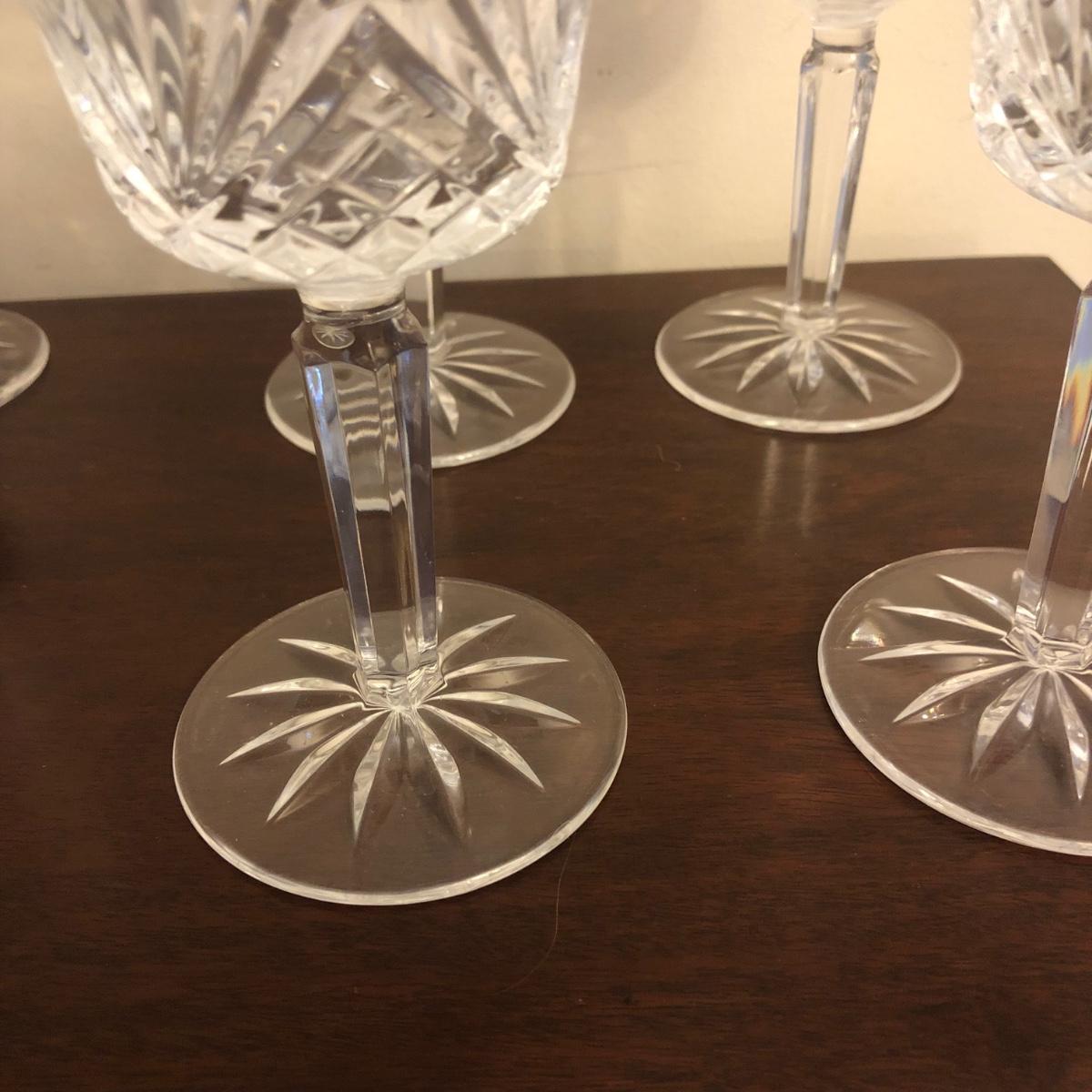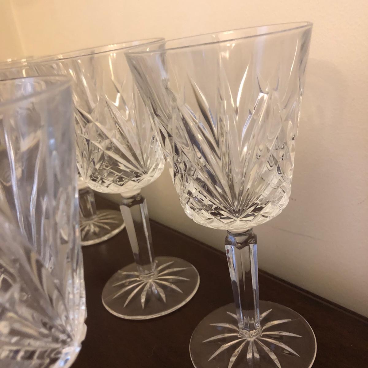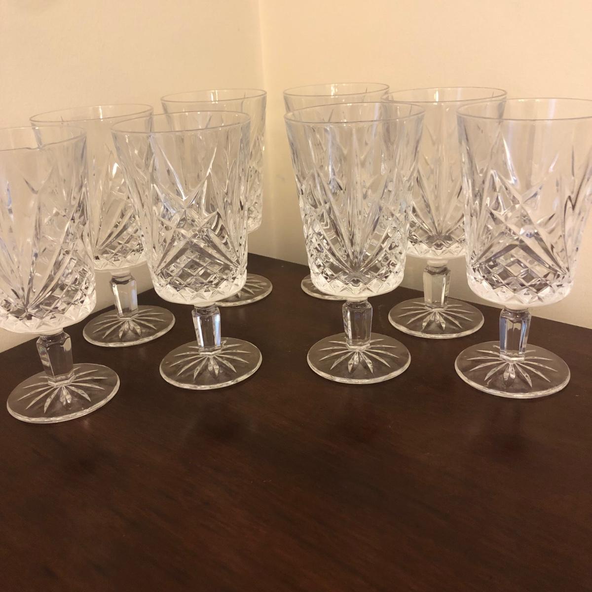 These heavy crystal glasses are comprised of eight wine glasses (four were added later), eight highball glasses and eight water glasses. Shipping Available.