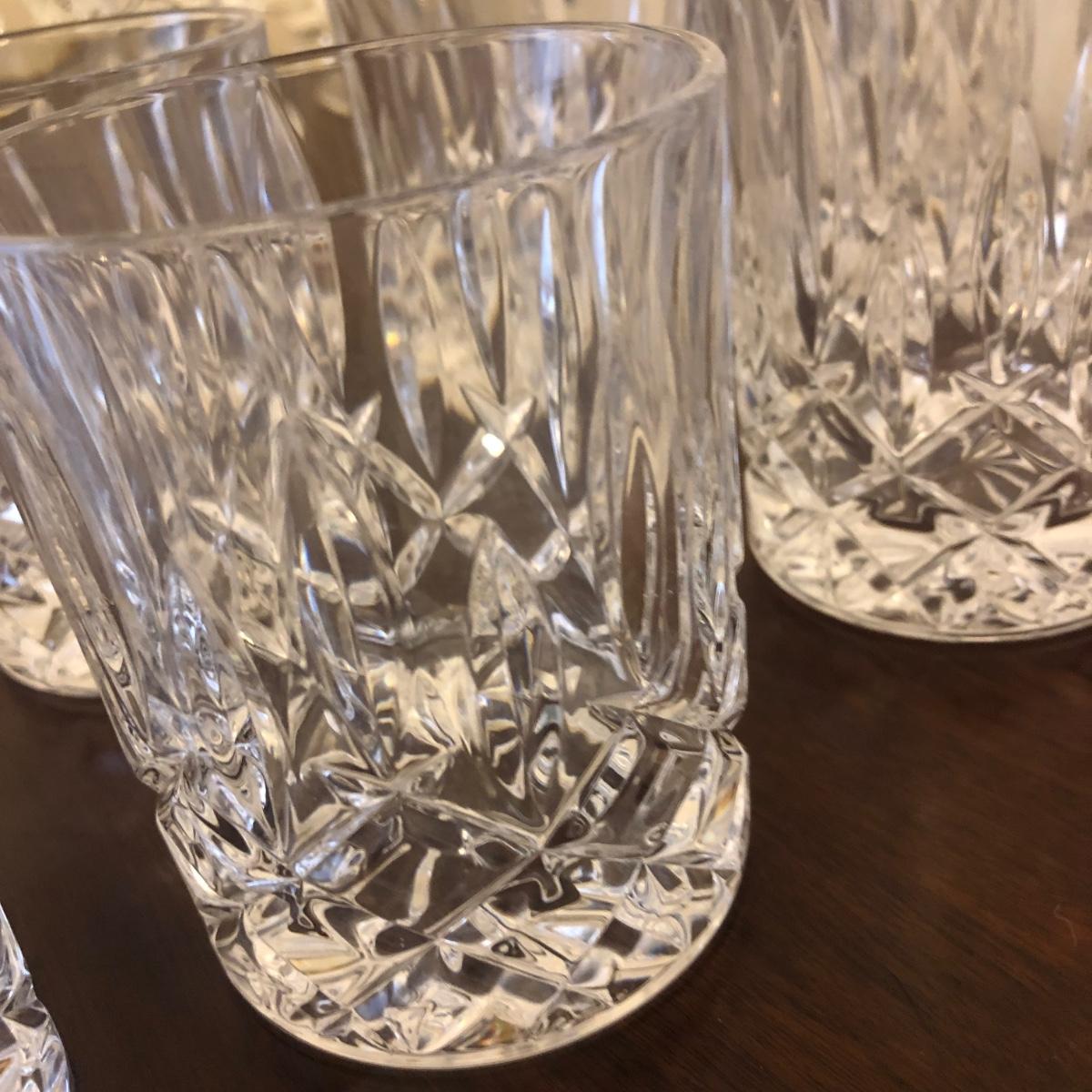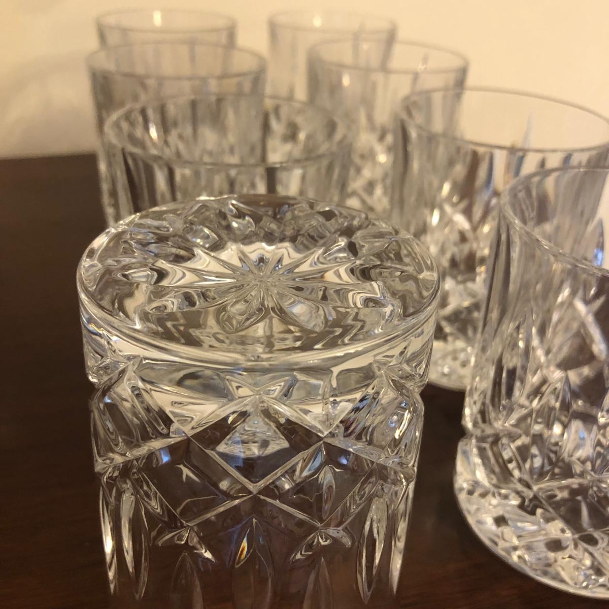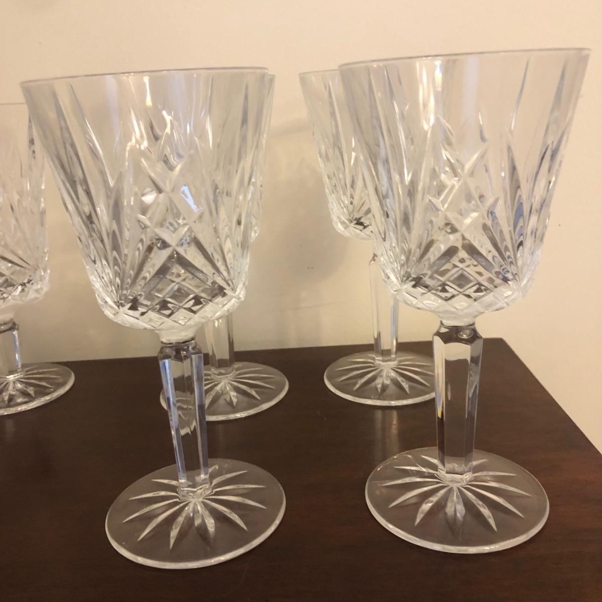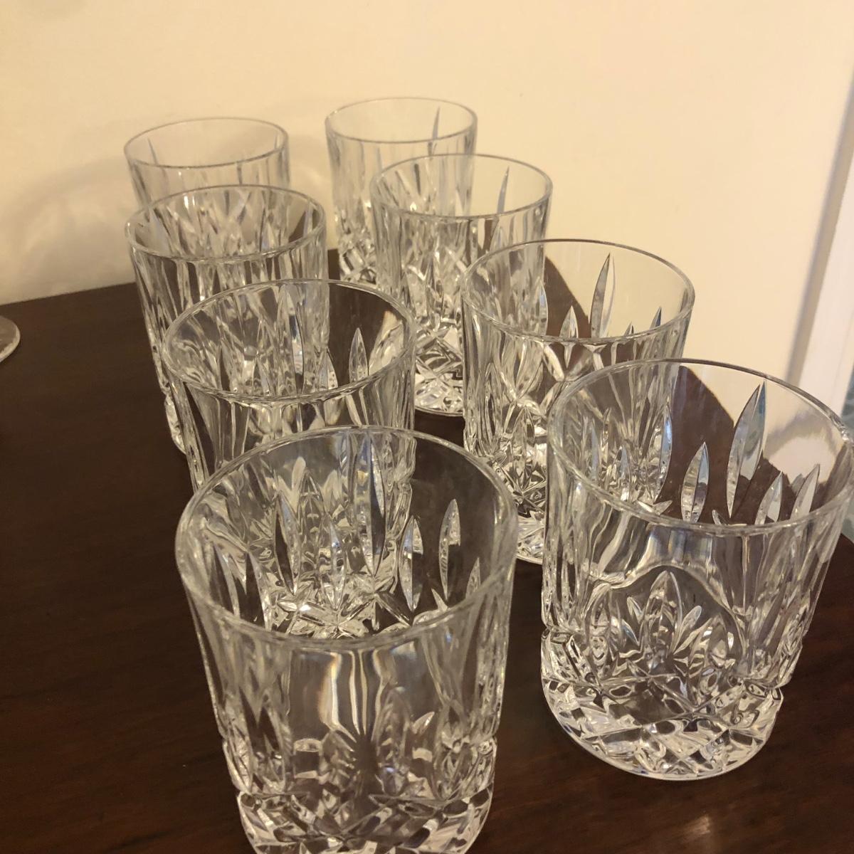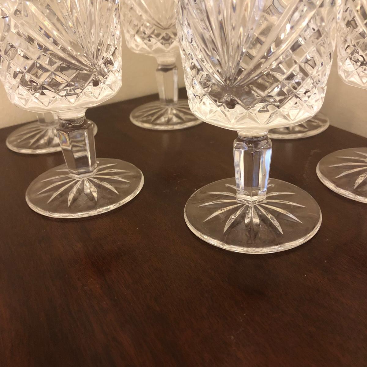 These heavy crystal glasses are comprised of eight wine glasses (four were added later), eight highball glasses and eight water glasses. Shipping Available.