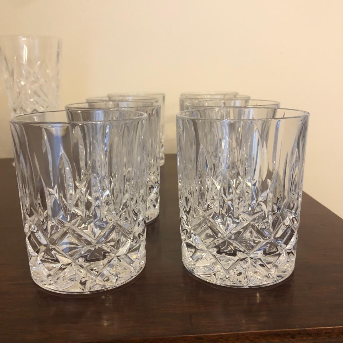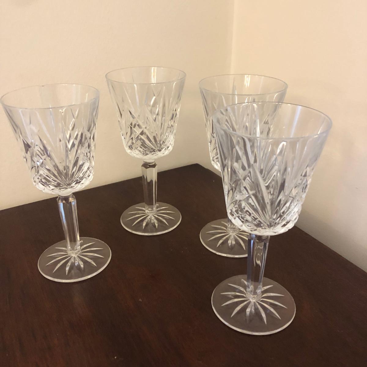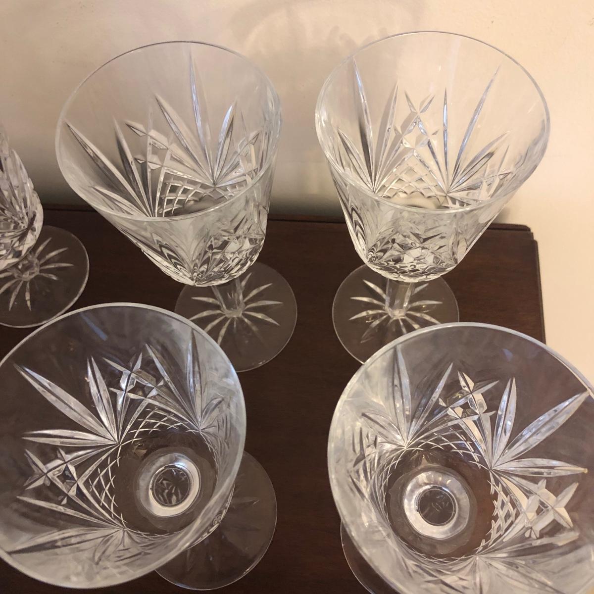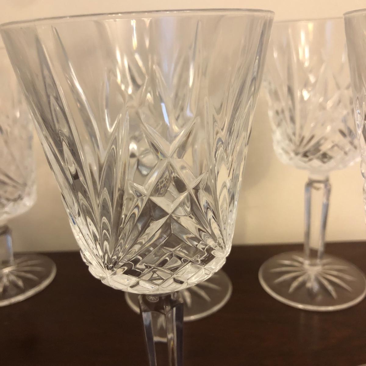 These heavy crystal glasses are comprised of eight wine glasses (four were added later), eight highball glasses and eight water glasses. Shipping Available.