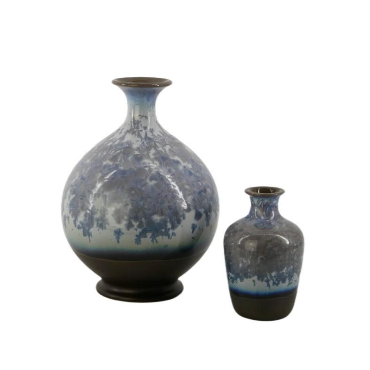 Pair of retired Lladro vases with a beautiful blue snowflake crystalline glaze style design. Large vase measures L 7" x H 9" with a 21" circumference. Large vase is not numbered and has no visible issues. One small flaw in design (see photo). Small vase measures L 3" x H 5" with a 10" circumference. Small vase is numbered 5521. No visible issues. No boxes or certificates included. Weight of lot is 3 lb 3 oz. (C15)