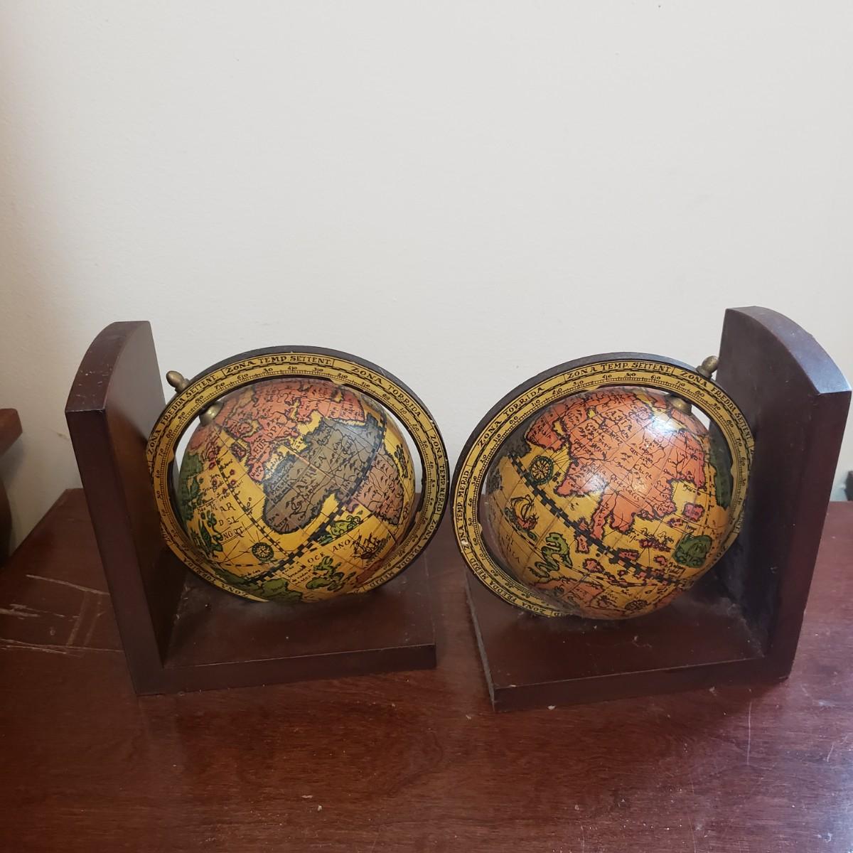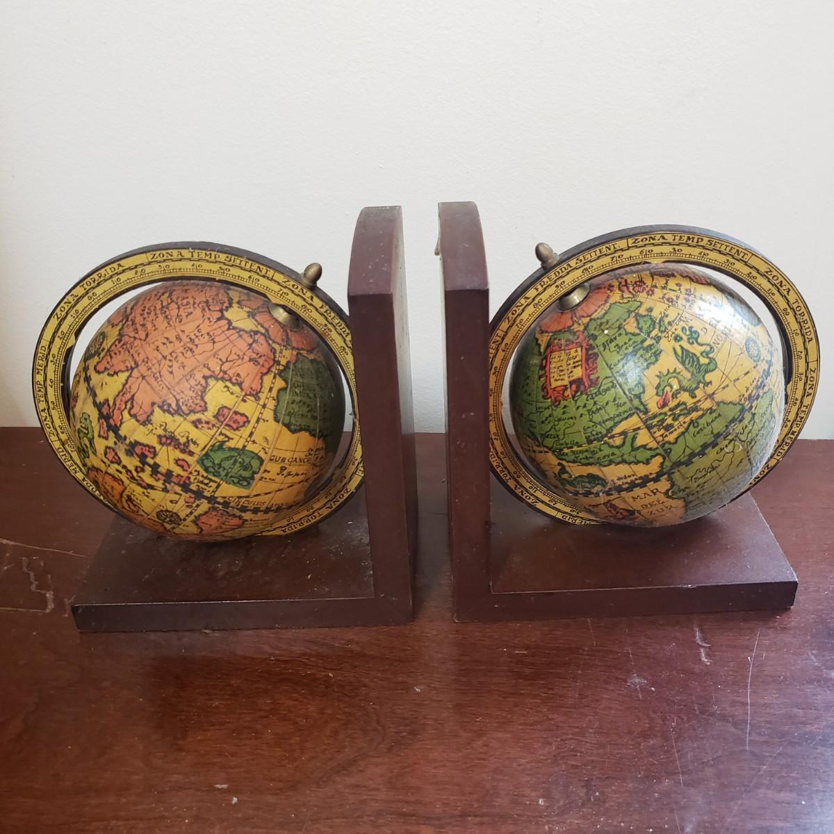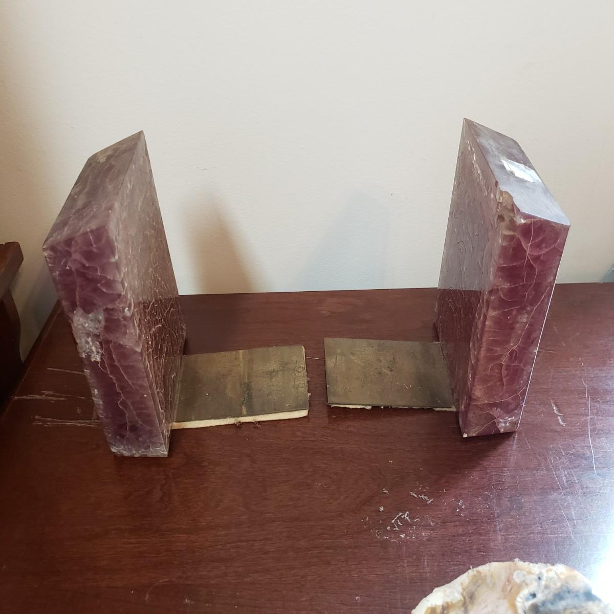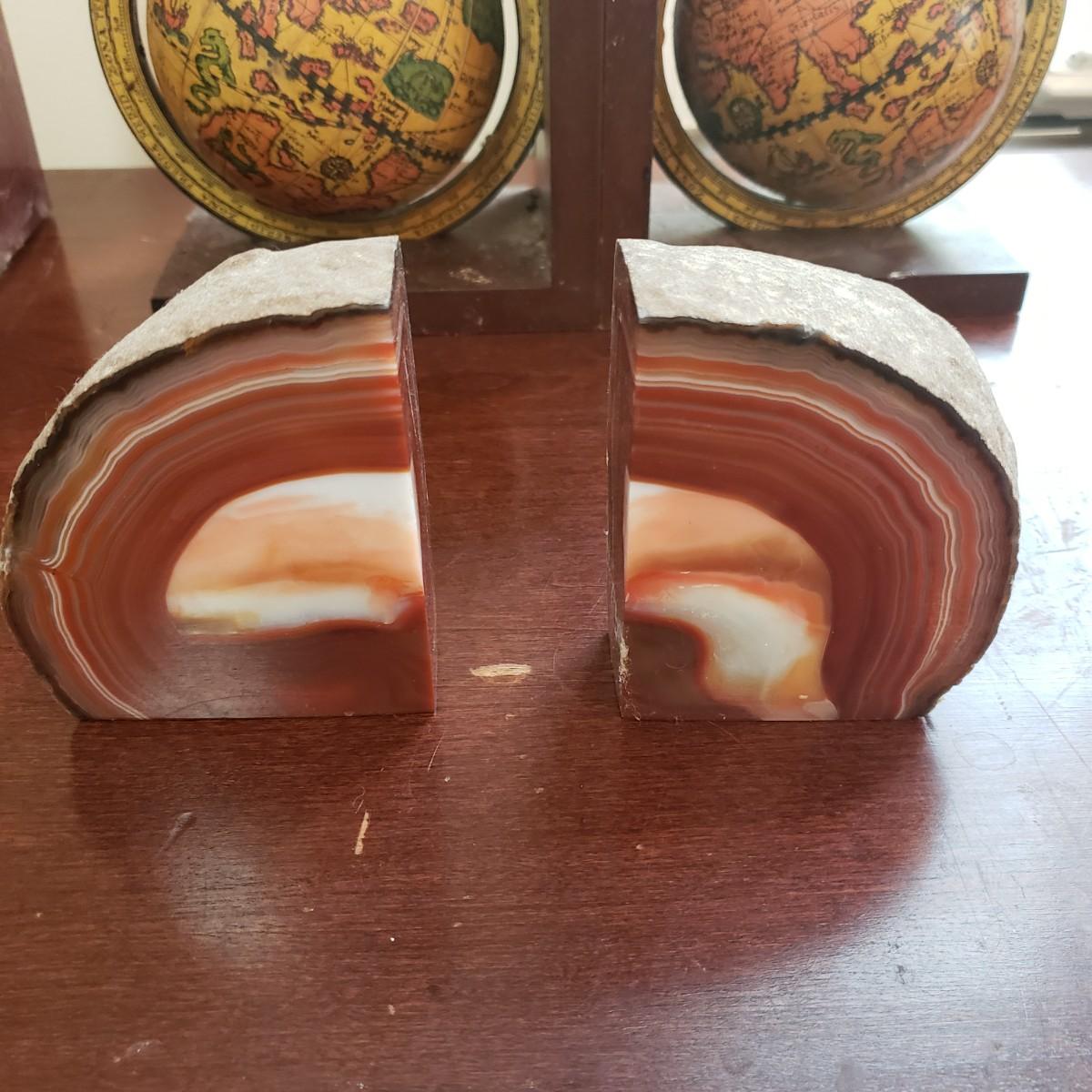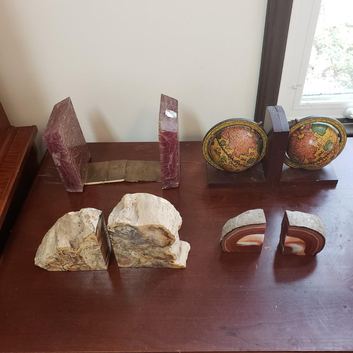 This lot features four sets of unique bookends. The Crystopal bookends (5" x 6" x 7"H) are a purple colored stone with brass stands. The underside is covered in felt on one, and the other side is coming off. The largest cut stone bookends with brownish colors measure 3" x 6" x 7"H. The smaller cut stone bookends have some vibrant coloring. The globe bookends are made in Italy and do rotate!