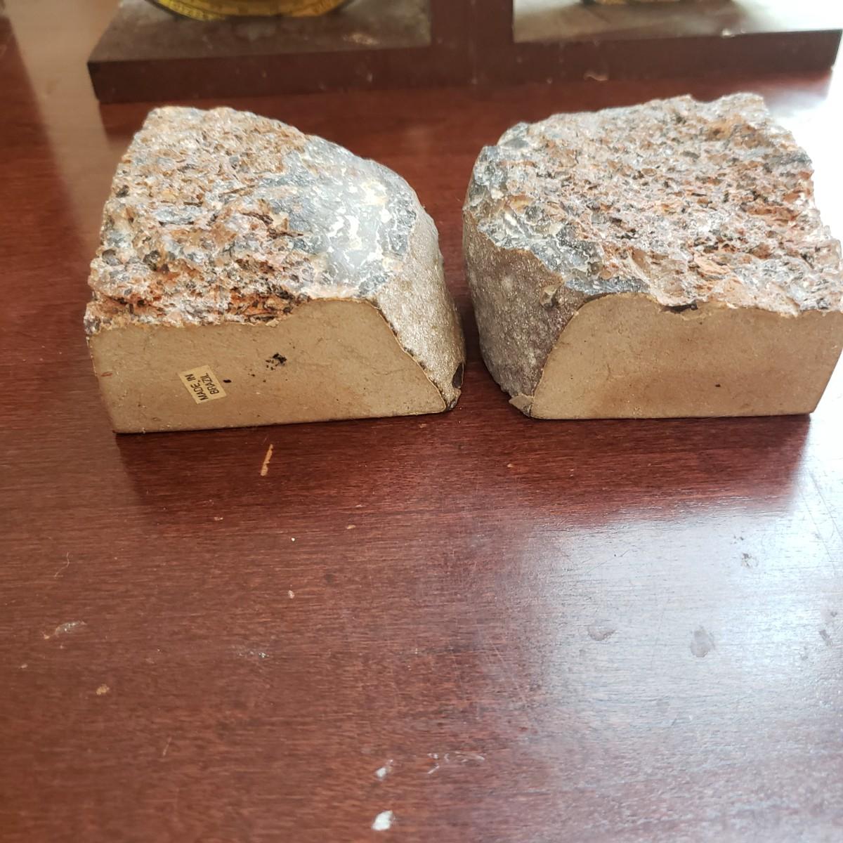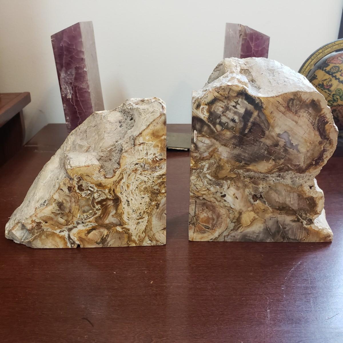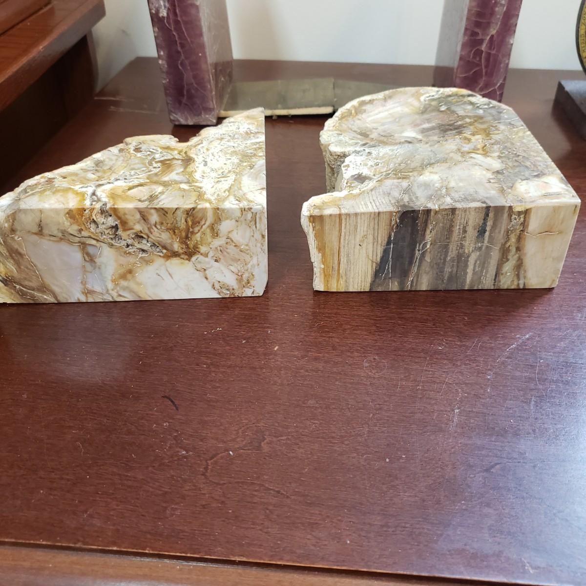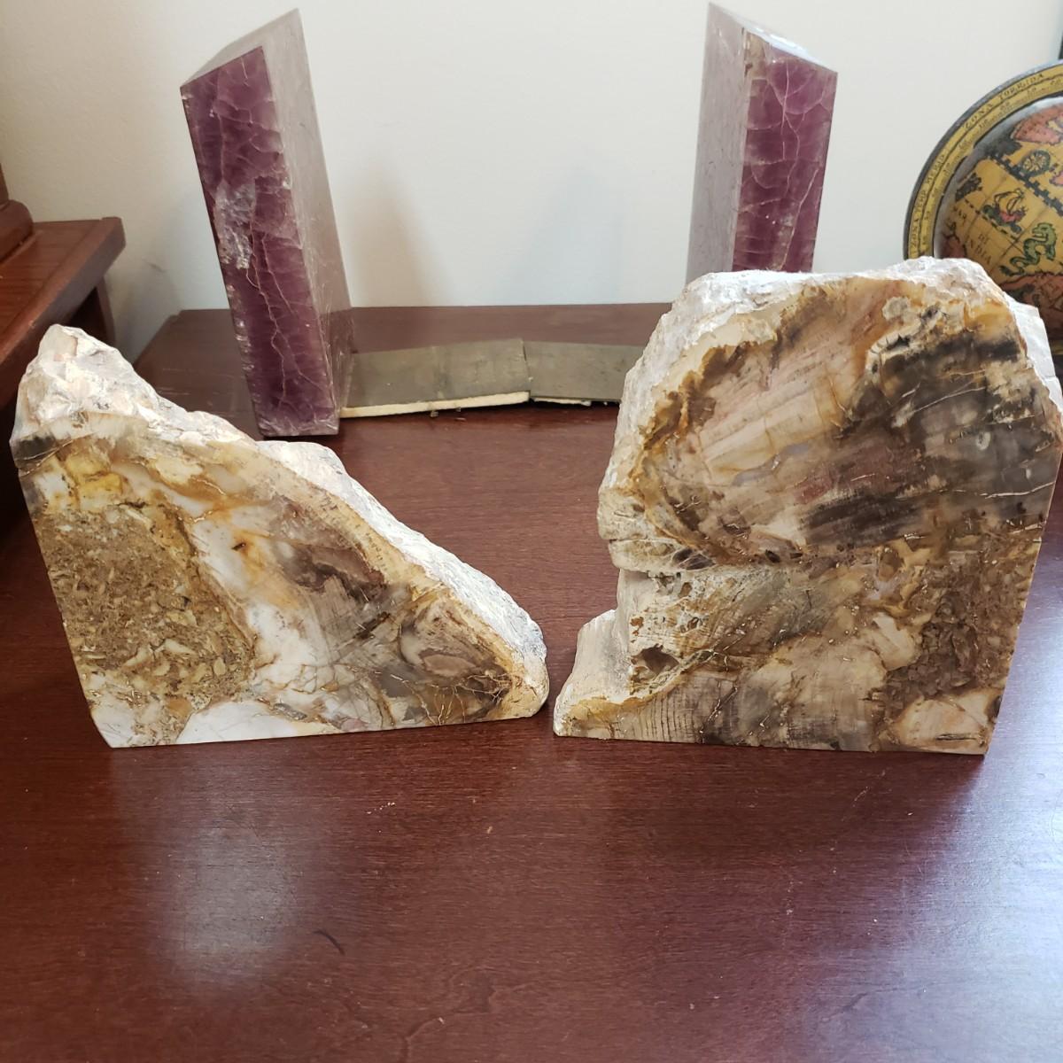 This lot features four sets of unique bookends. The Crystopal bookends (5" x 6" x 7"H) are a purple colored stone with brass stands. The underside is covered in felt on one, and the other side is coming off. The largest cut stone bookends with brownish colors measure 3" x 6" x 7"H. The smaller cut stone bookends have some vibrant coloring. The globe bookends are made in Italy and do rotate!