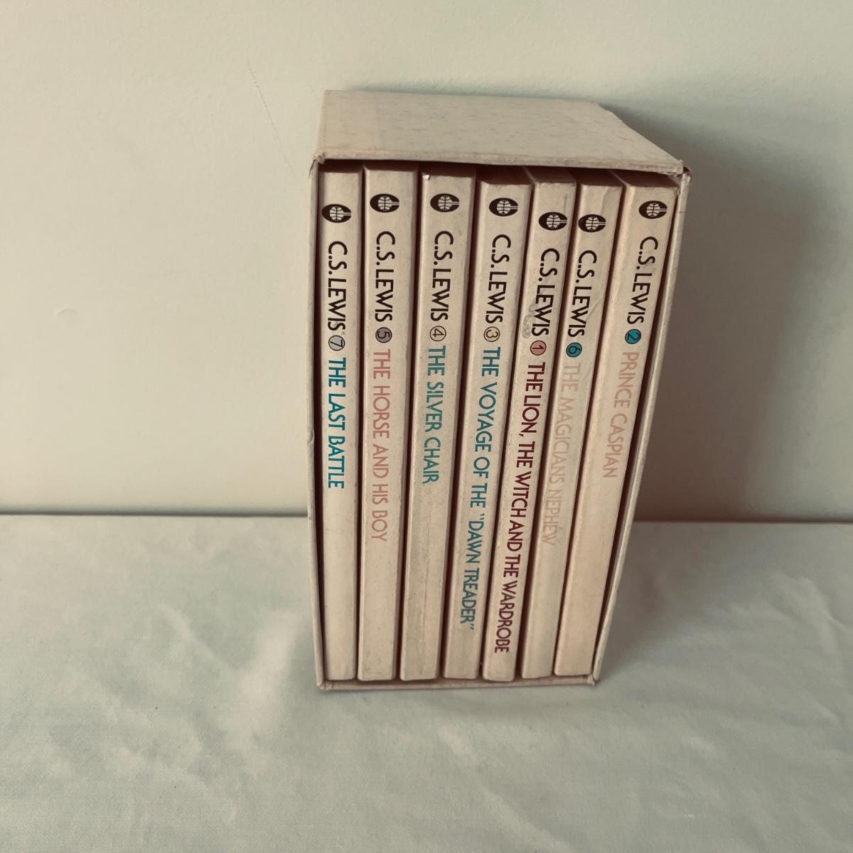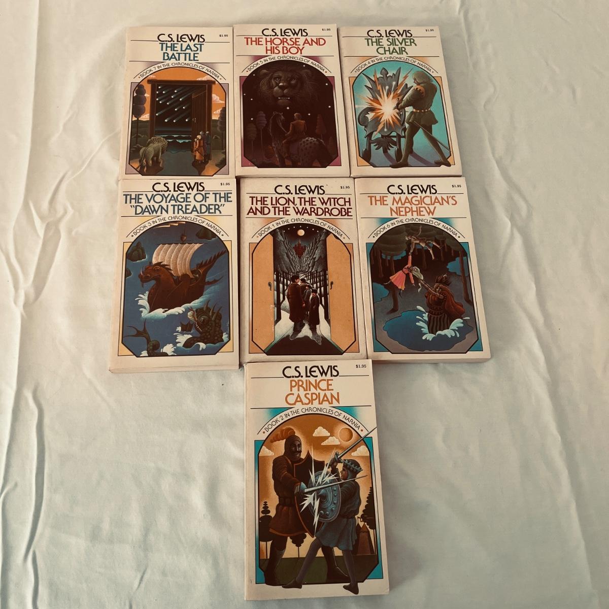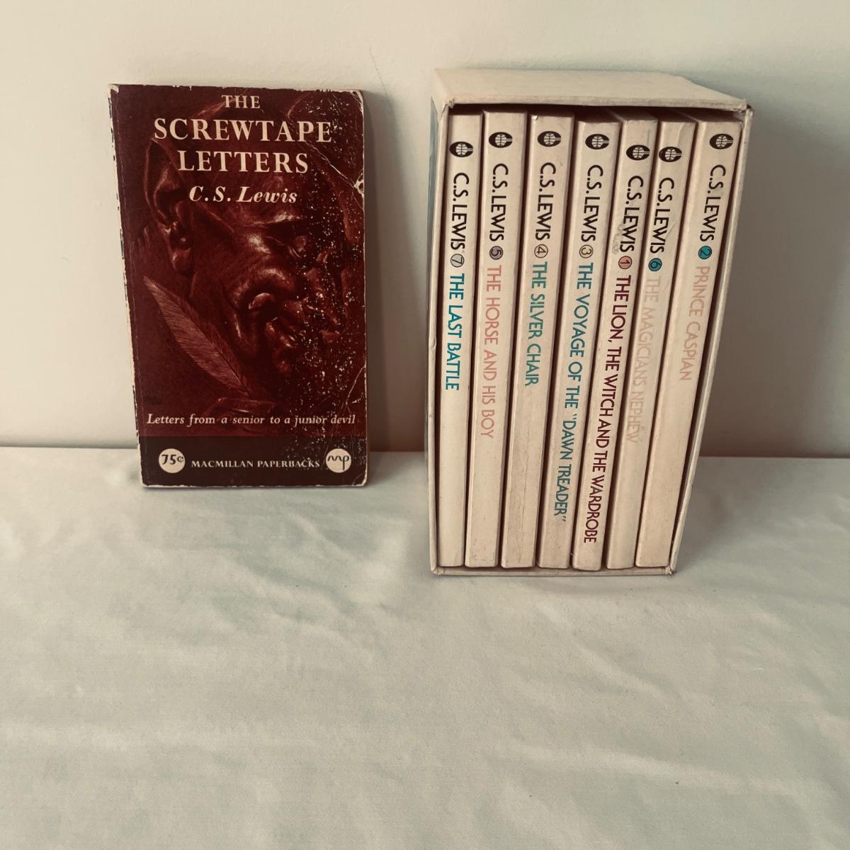 Lot contains C.S.Lewis The Chronicles of Narnia seven paperback book set and The Screwtape Letters also by C.S.Lewis that has age spots on it, see pictures.