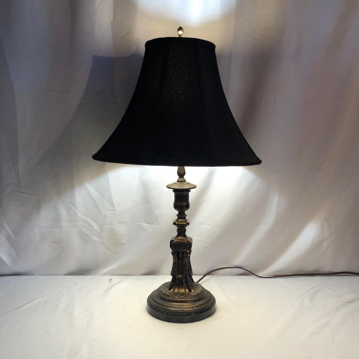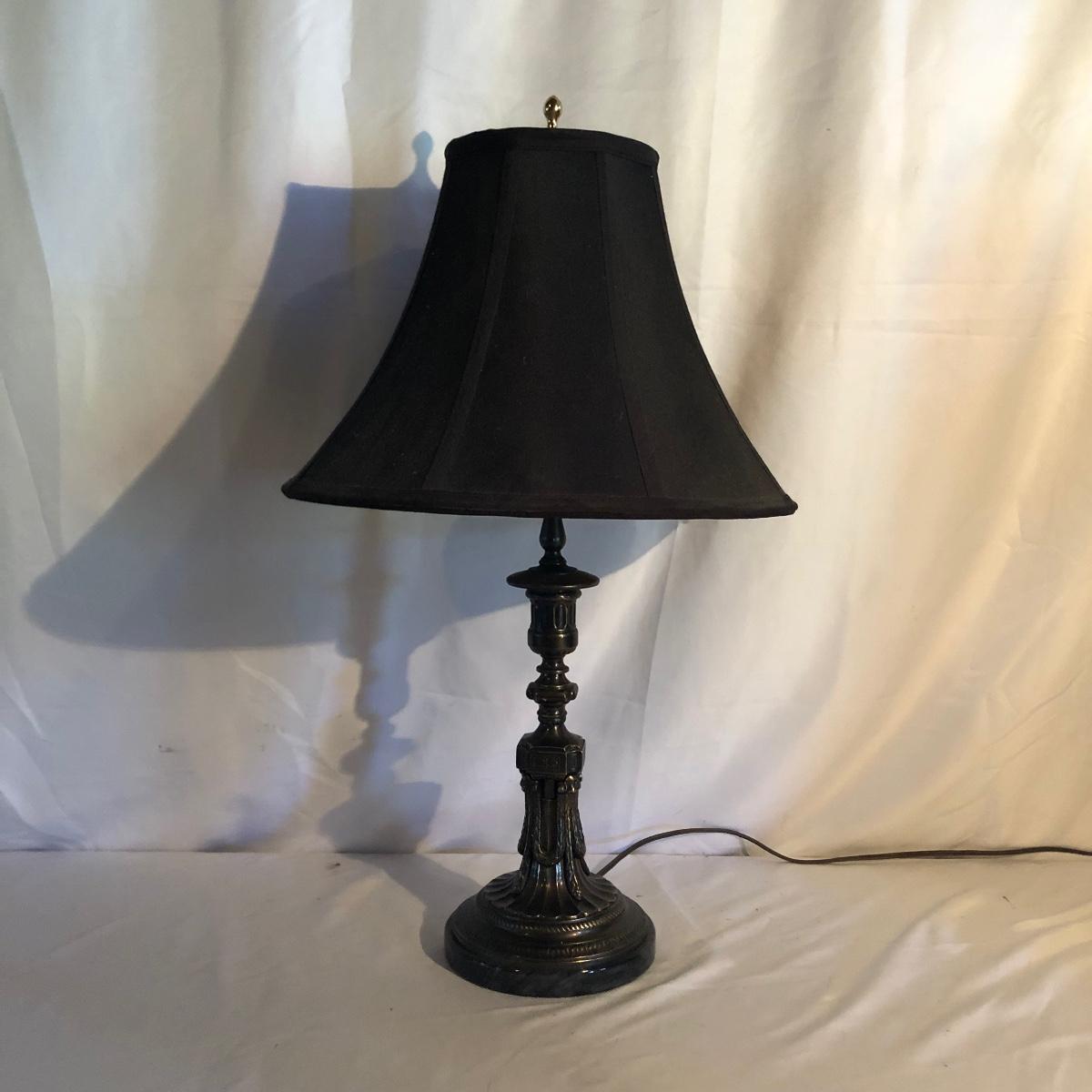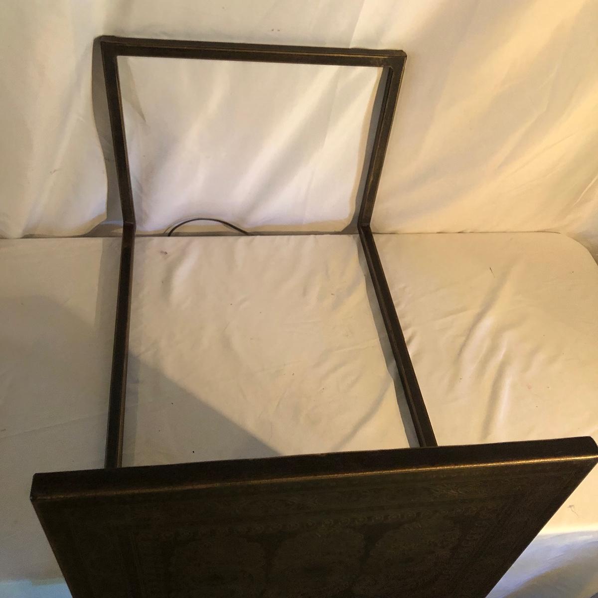 Lot includes a metal c-side table with a unique design on top and metal lamp with a stone base and black shade.