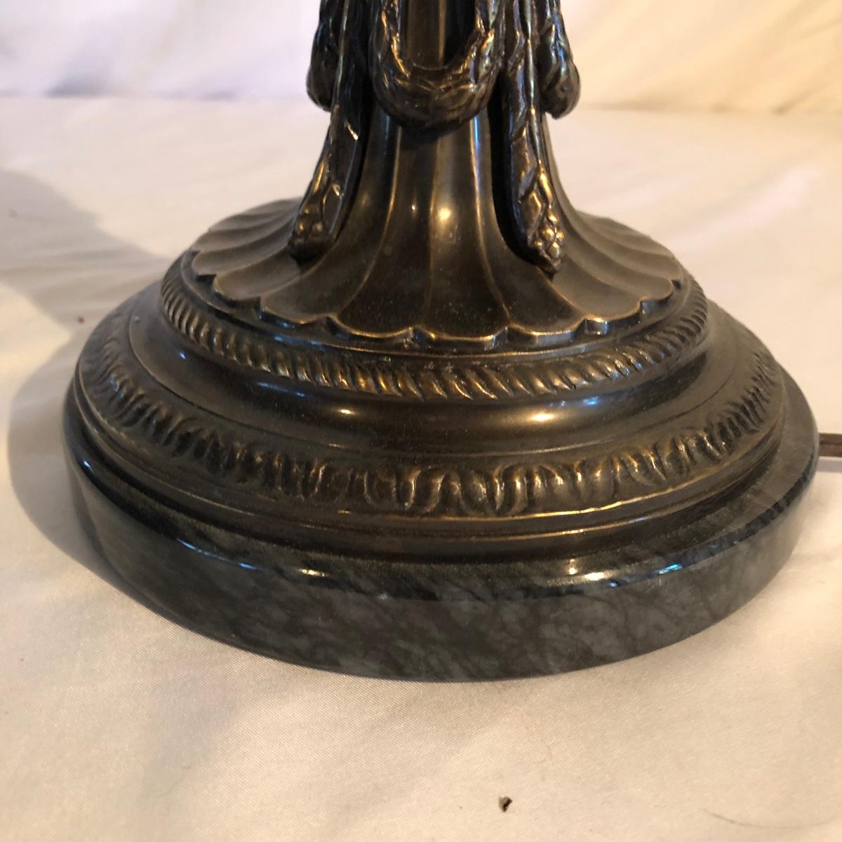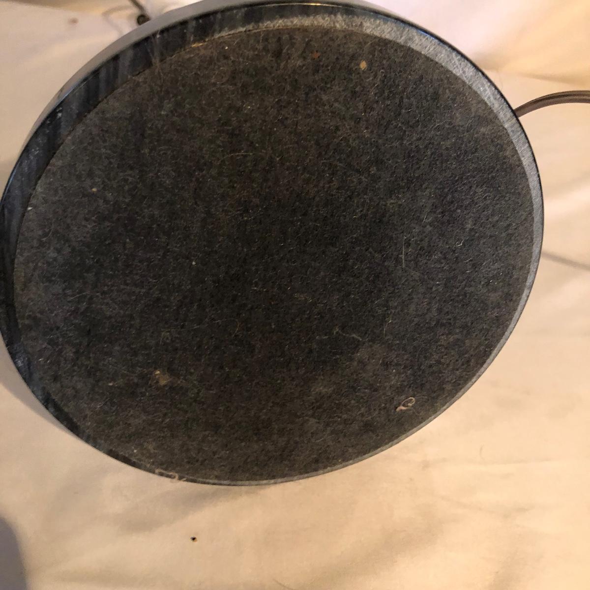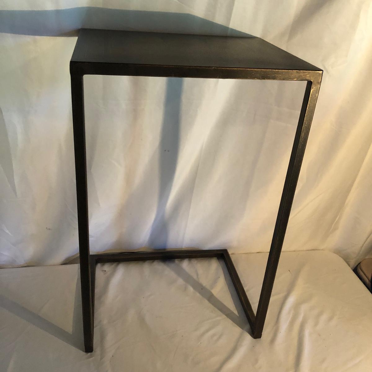Lot includes a metal c-side table with a unique design on top and metal lamp with a stone base and black shade.