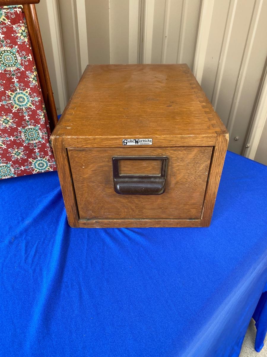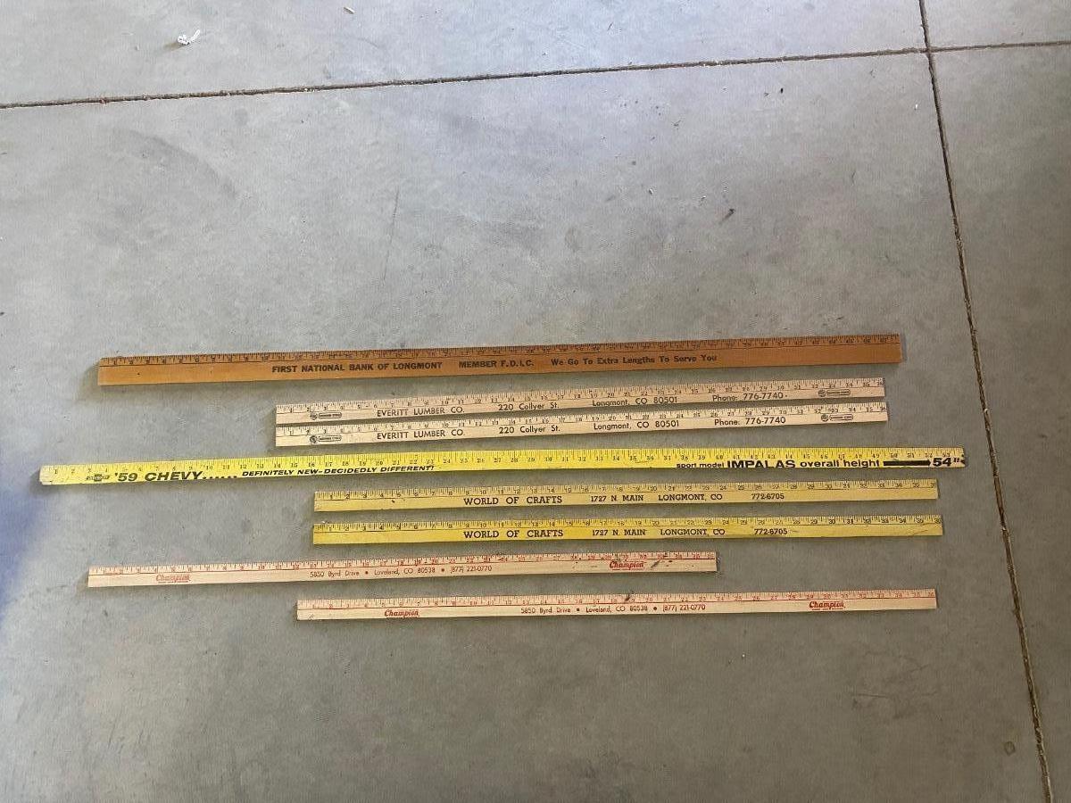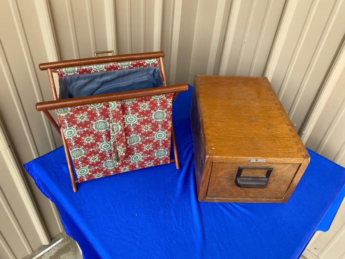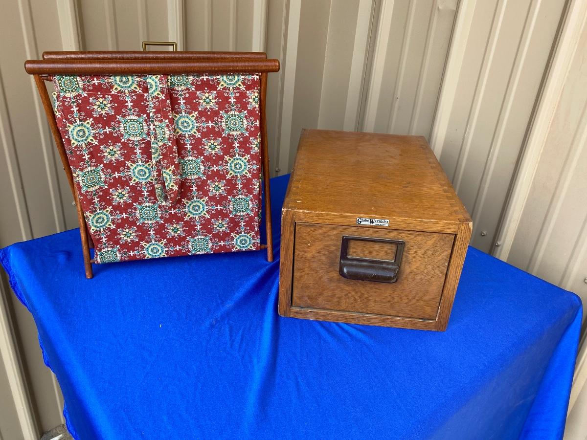 ADVERTISING YARDSTICKS, GLOBE WERNICKE WOODEN FILE BOX AND KNITTING BASKET