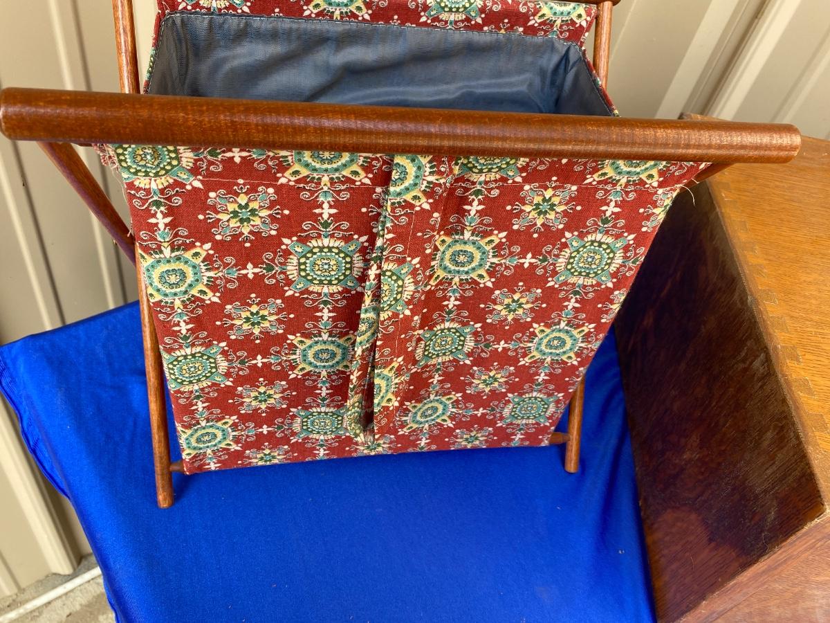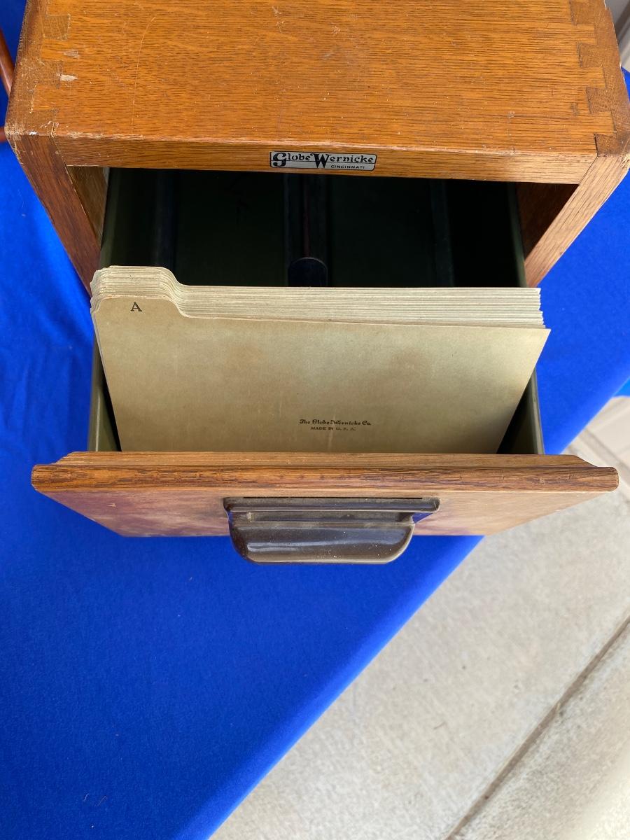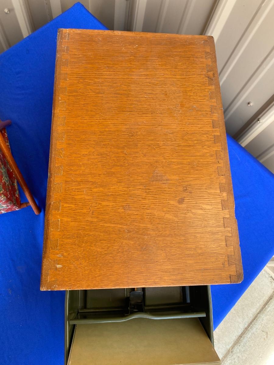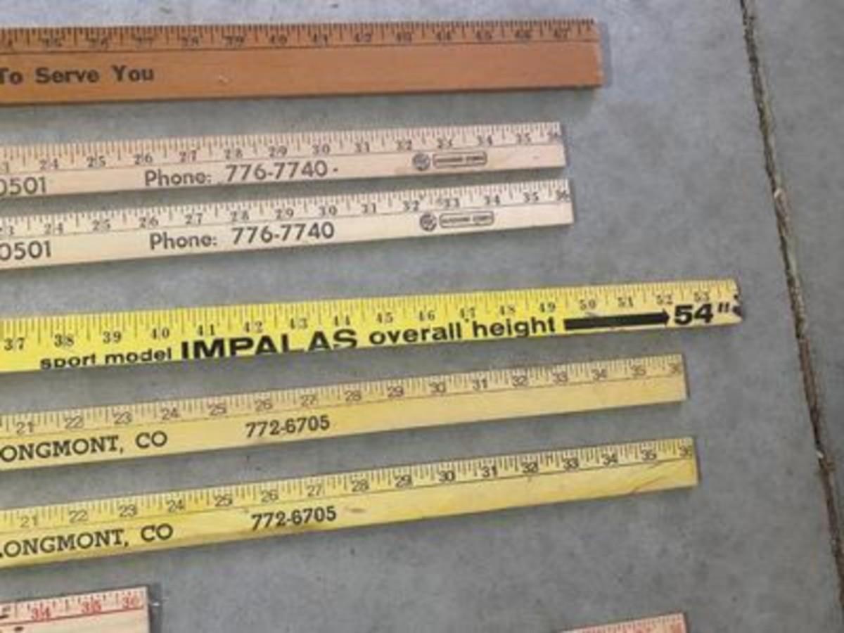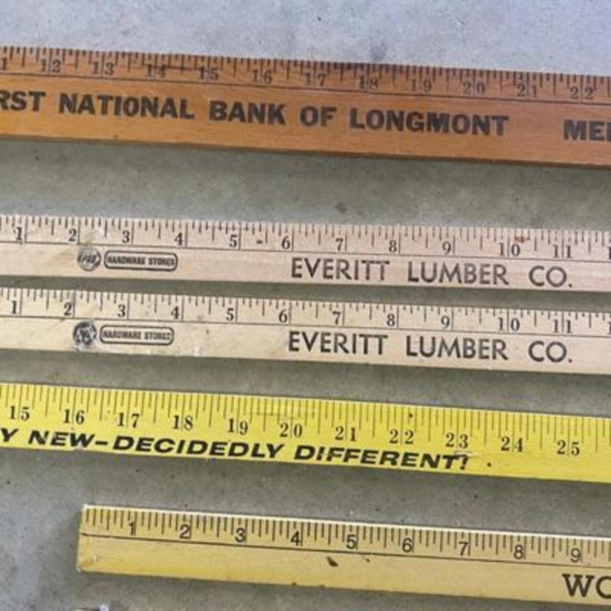 ADVERTISING YARDSTICKS, GLOBE WERNICKE WOODEN FILE BOX AND KNITTING BASKET