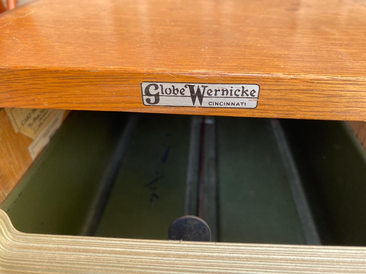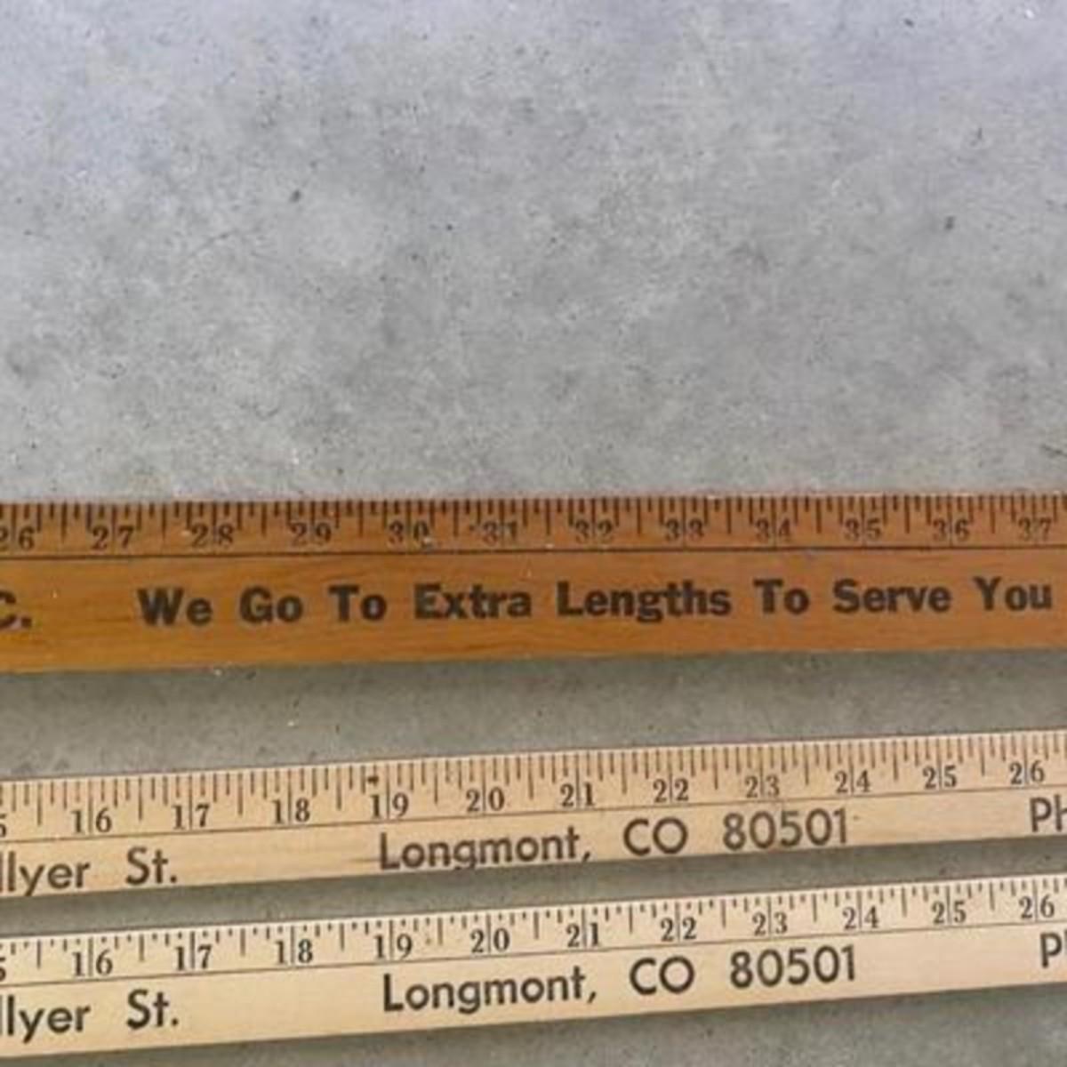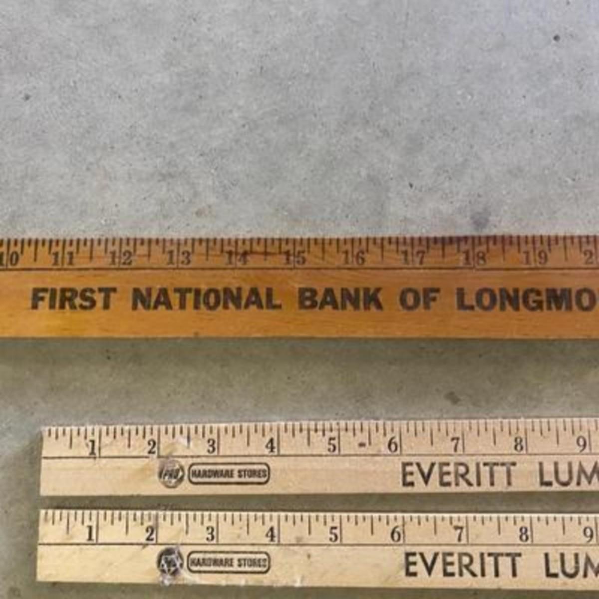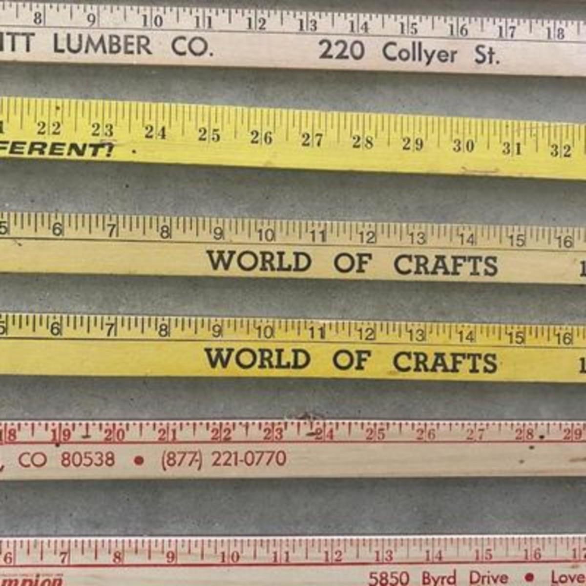 ADVERTISING YARDSTICKS, GLOBE WERNICKE WOODEN FILE BOX AND KNITTING BASKET