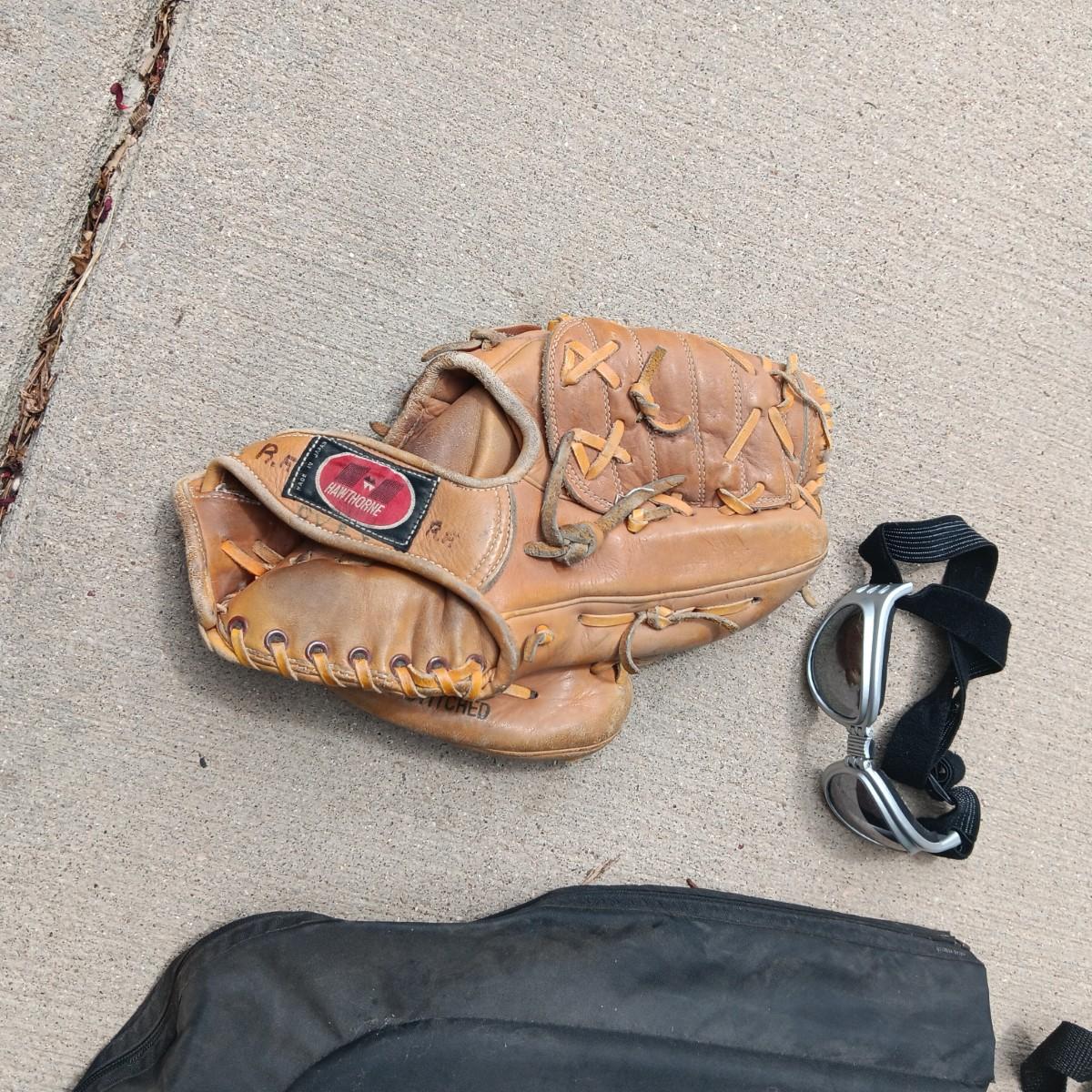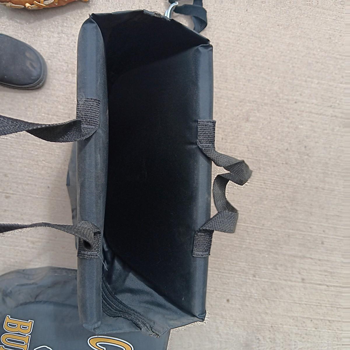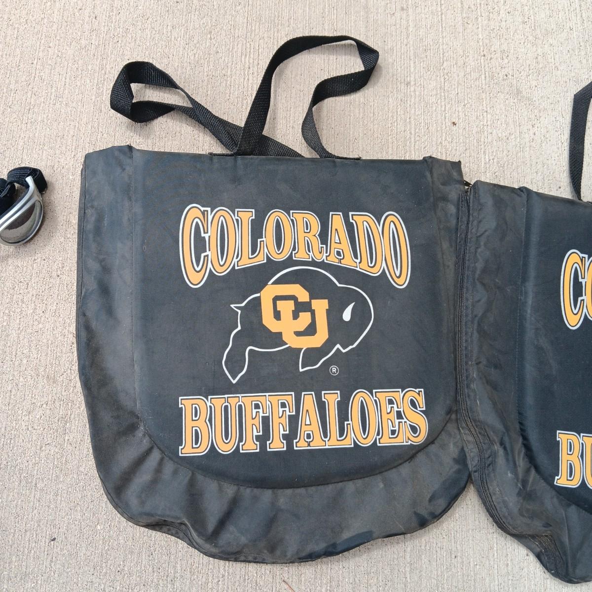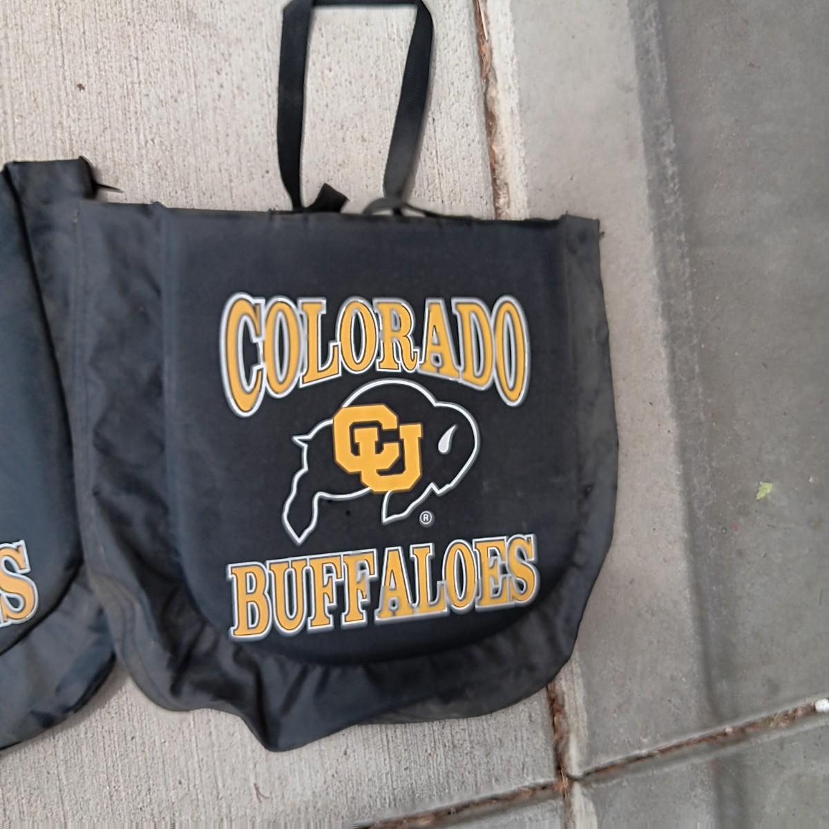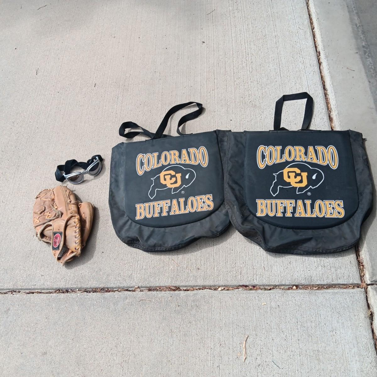 CU BUFFS PADDED BLEACHER SEATS THAT ARE ALSO CARRY TOTES PLUS SAFETY GLASSES AND BASEBALL MITT