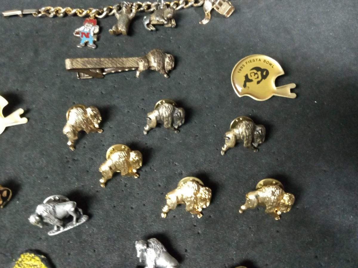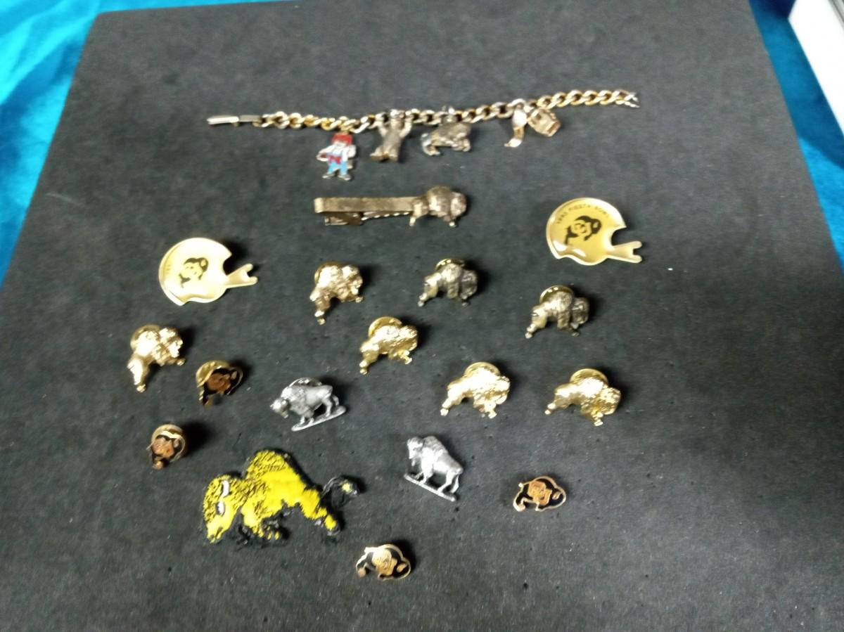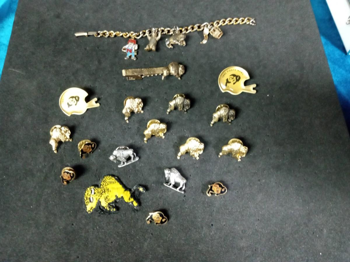 CU BUFFS PINS, TIE CLIP AND CHARM BRACELET