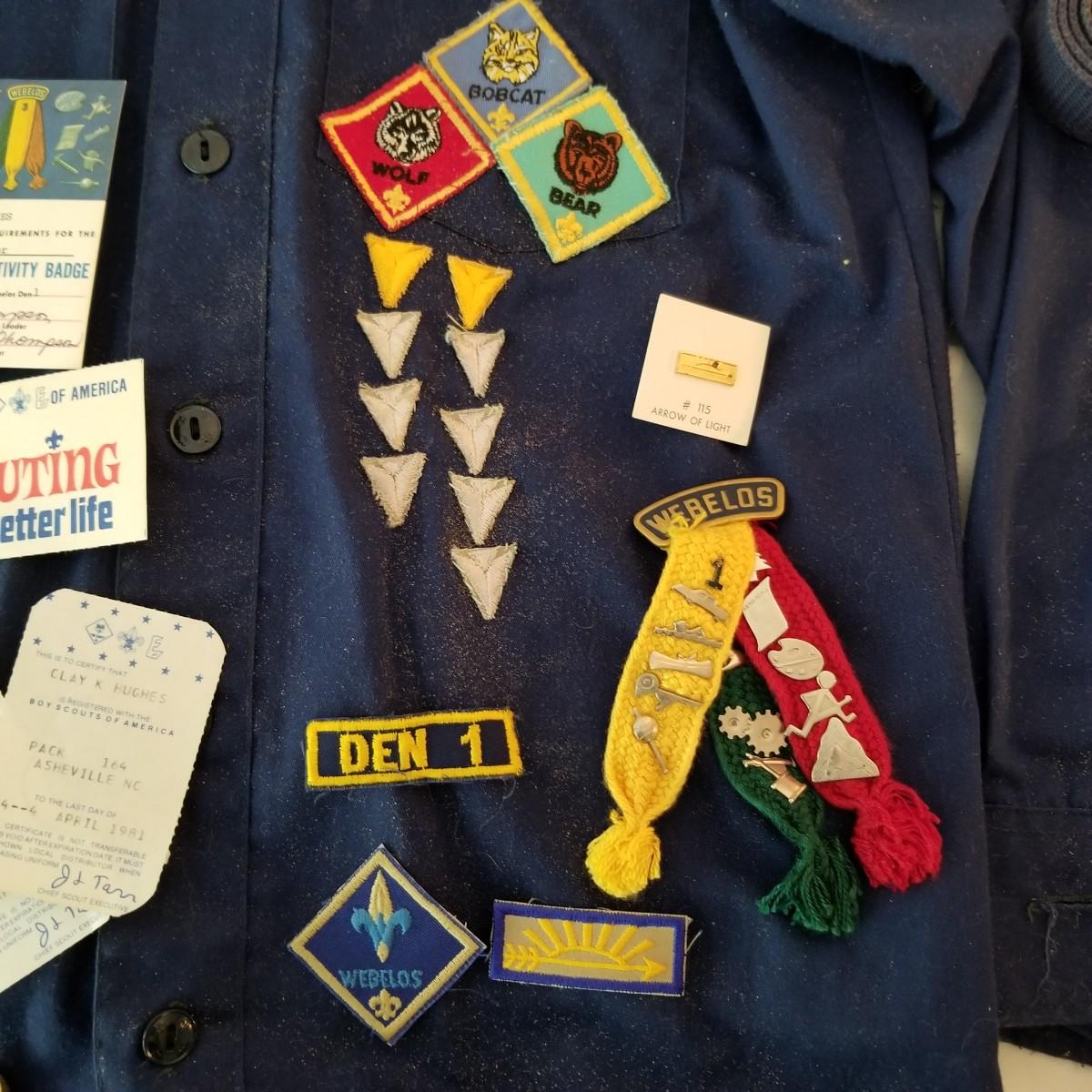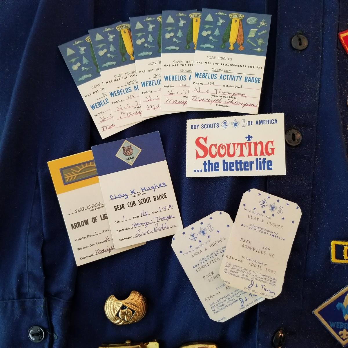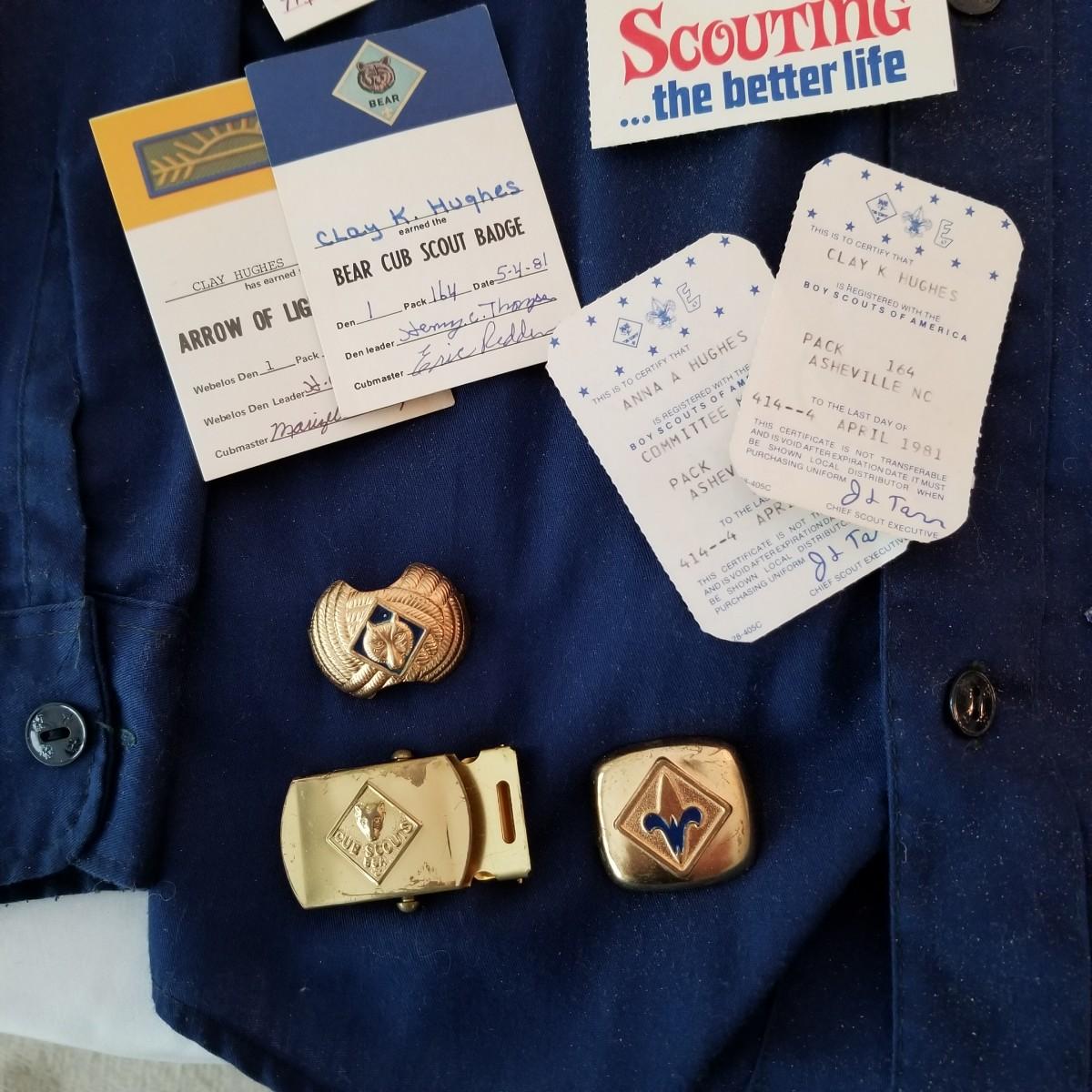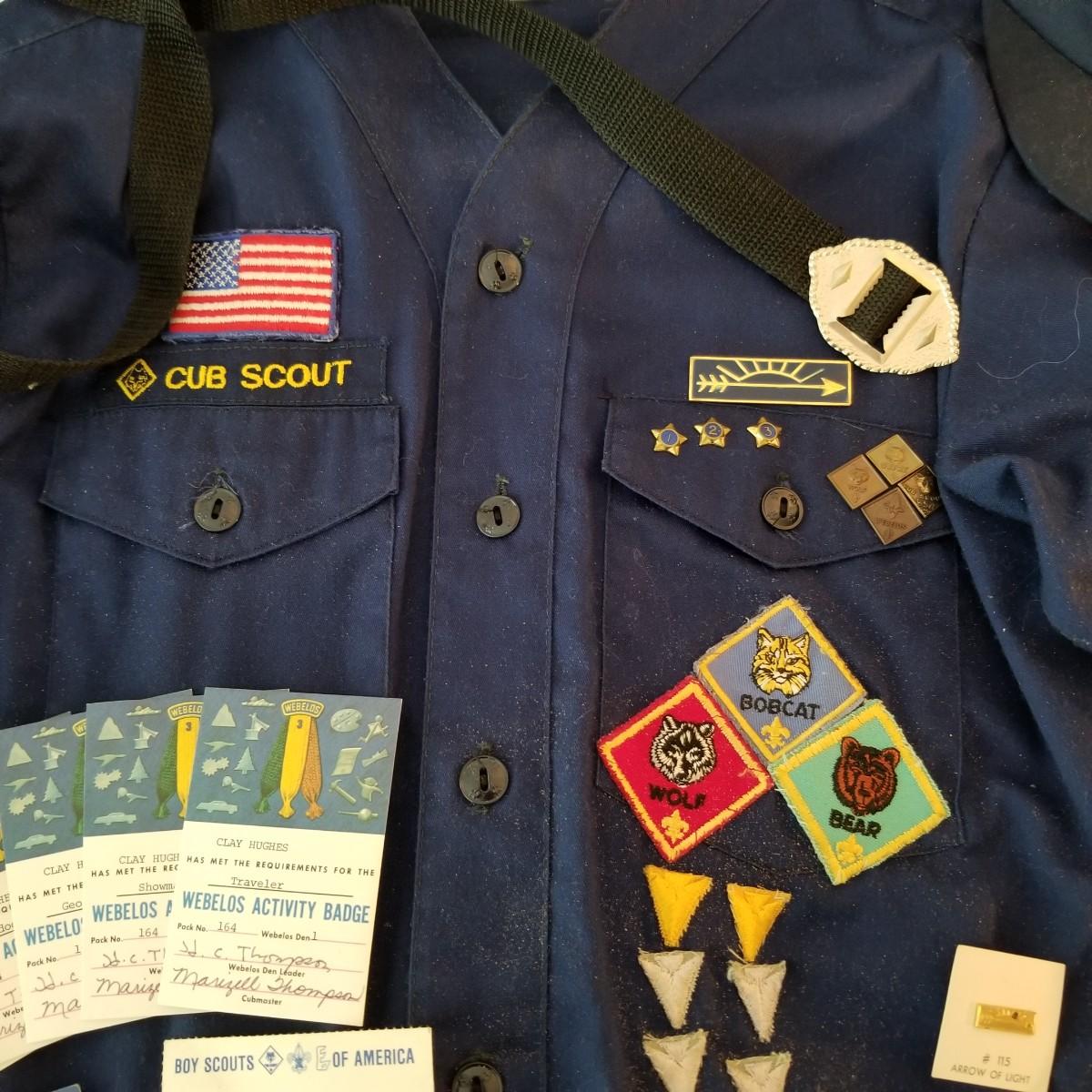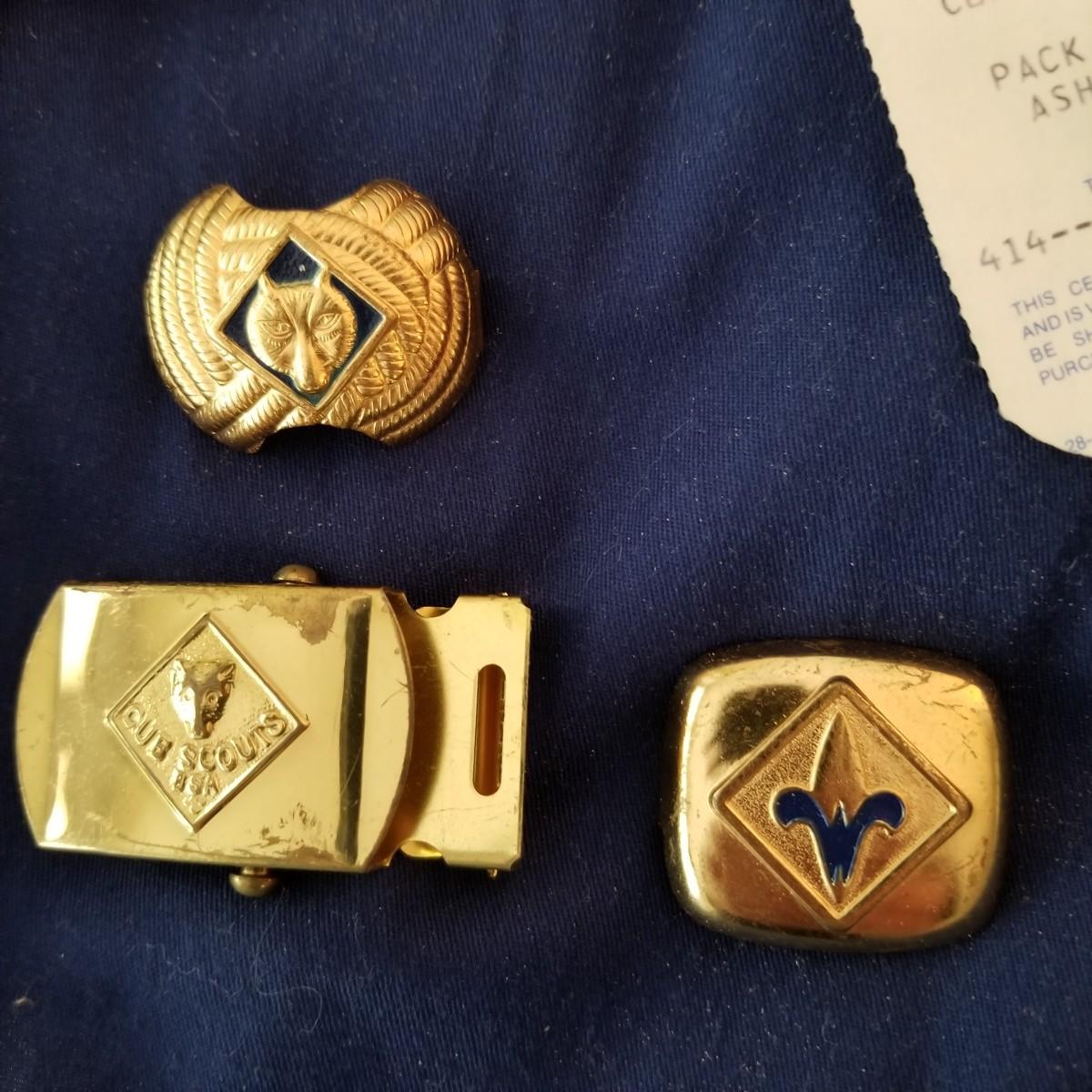 Cub Scout and Webelos items. Shirt, caps, belts, kerchiefs and slides, badges, books, cards and awards of merit.  Also includes a canteen. See photos for detail. Shipping available.