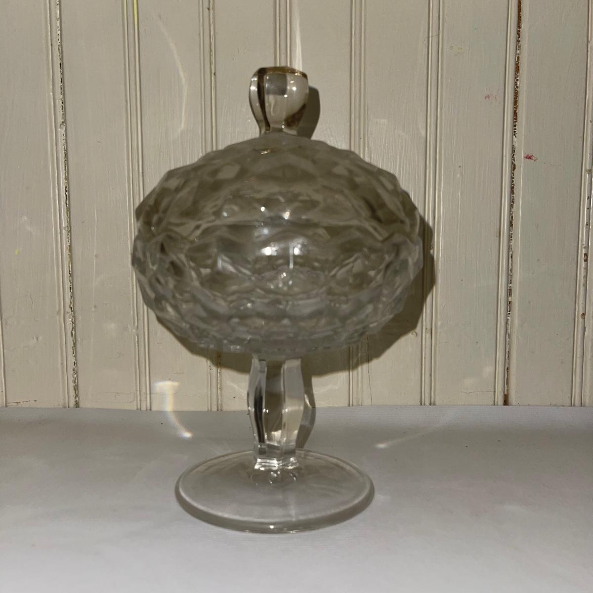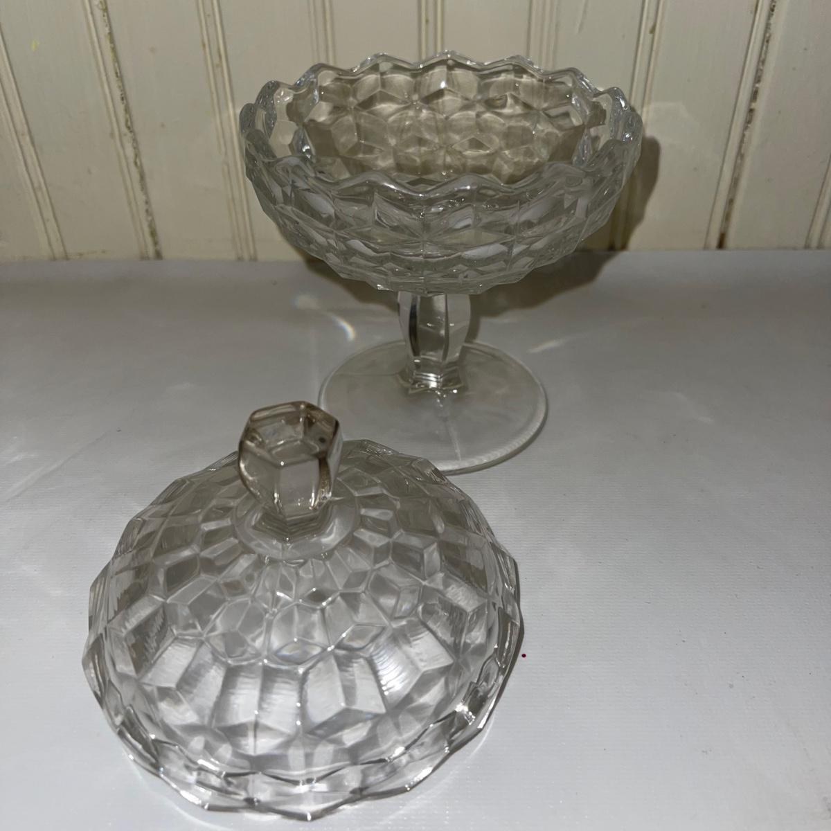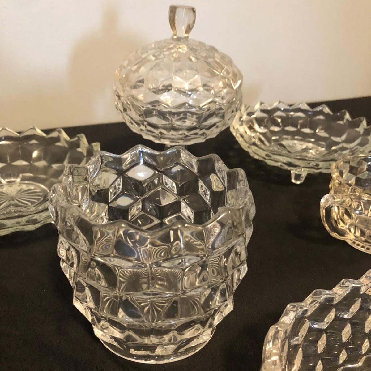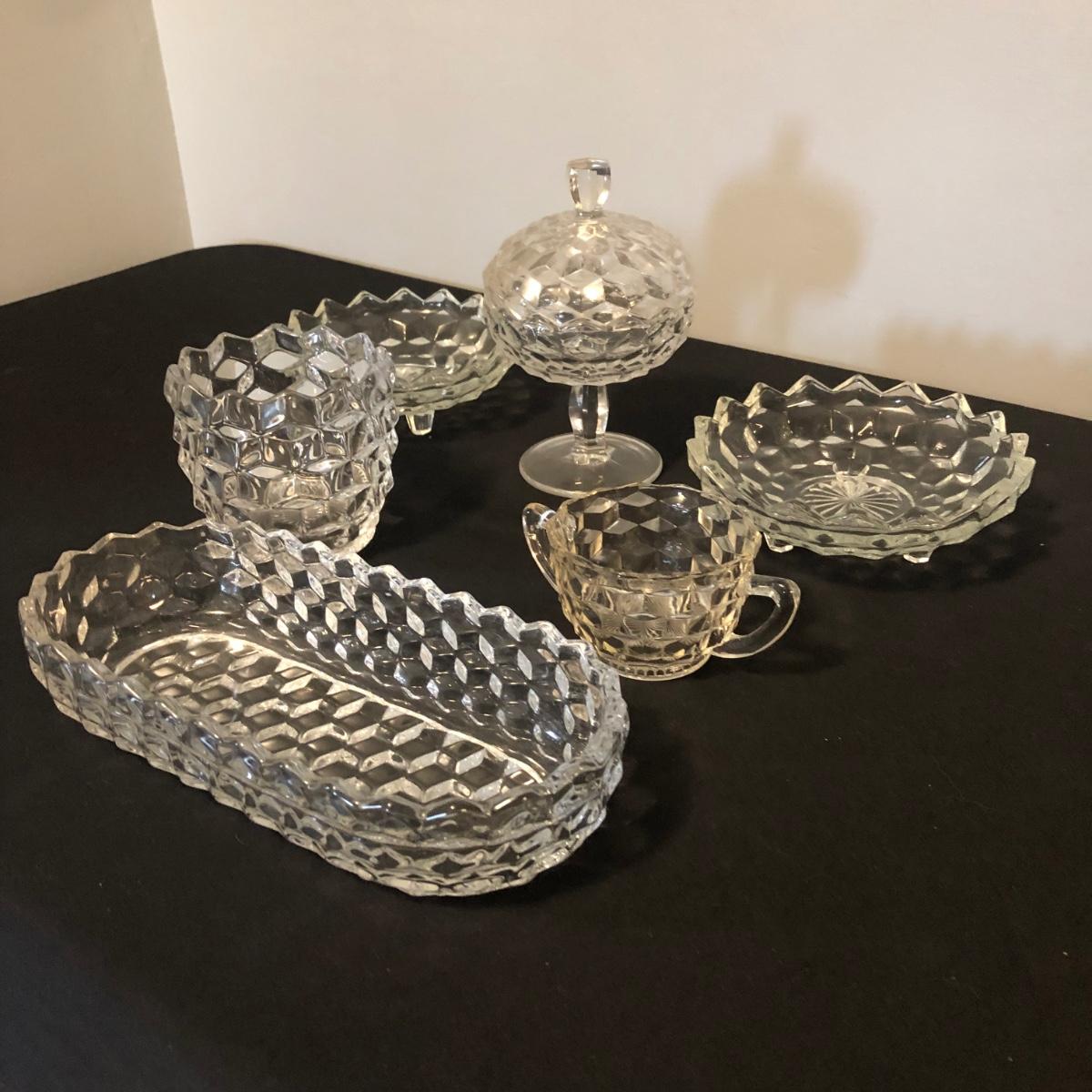 Collection of Fostoria style glassware. Items are an oval dish, a bowl, two matching shallow dishes, a small sugar dish, and a lidded standing dish. There are no signatures or brand names.