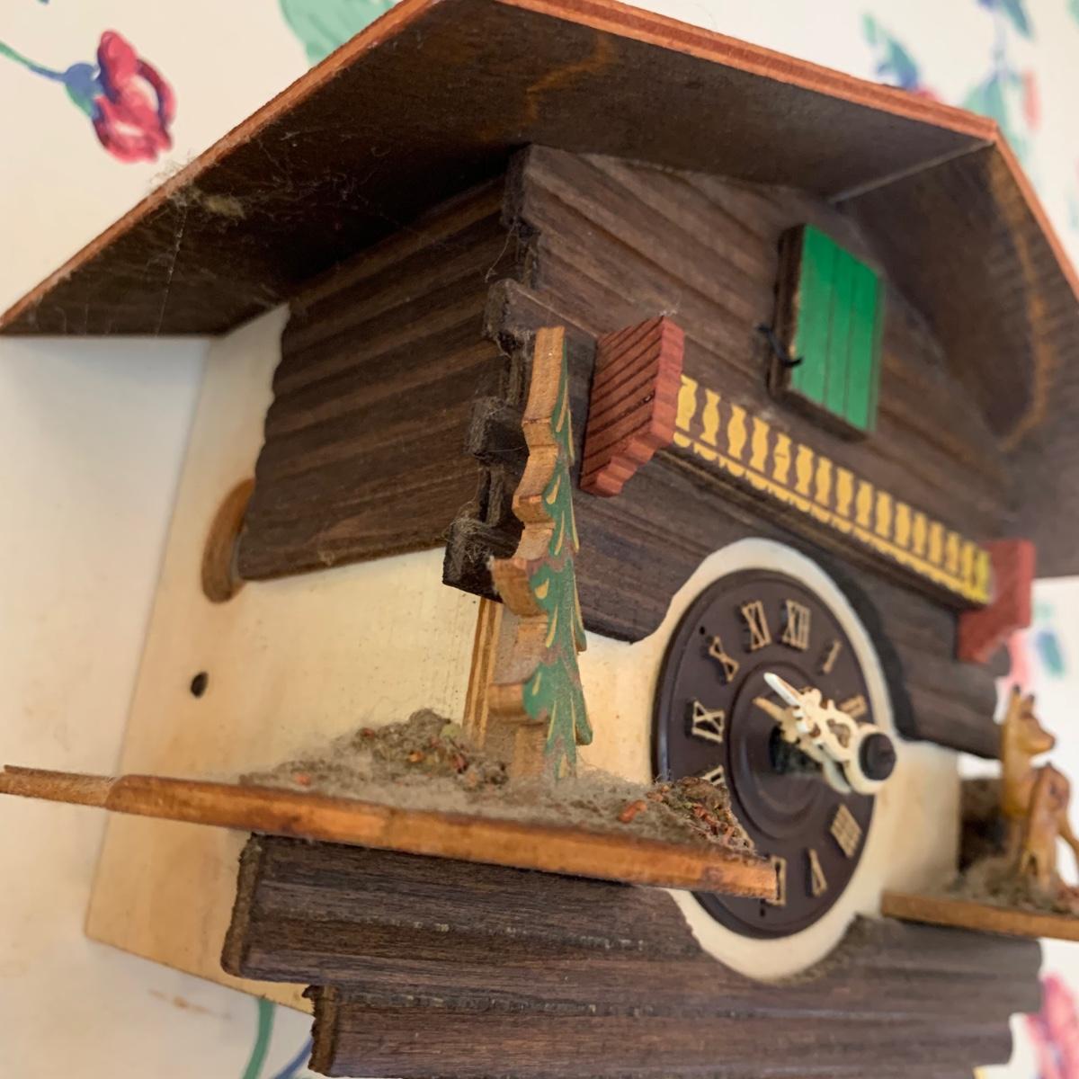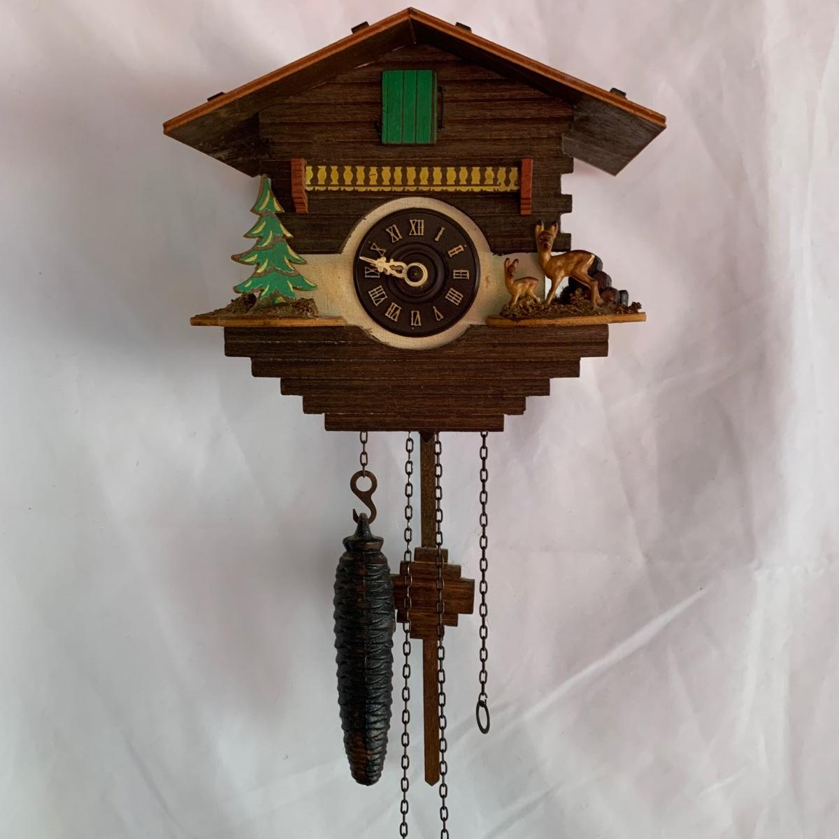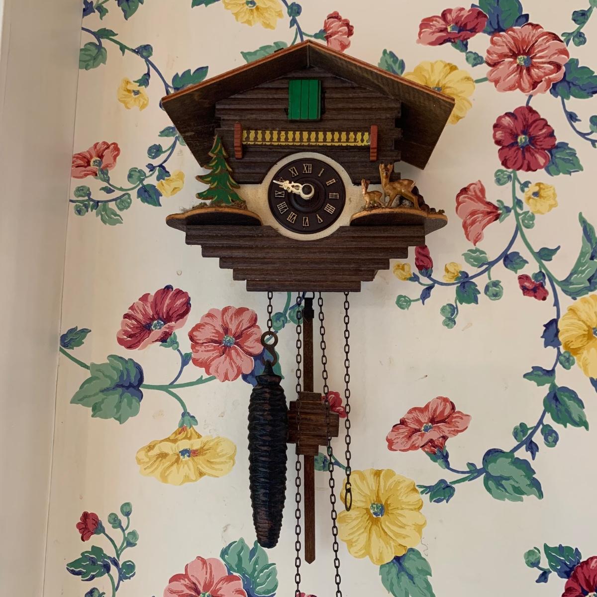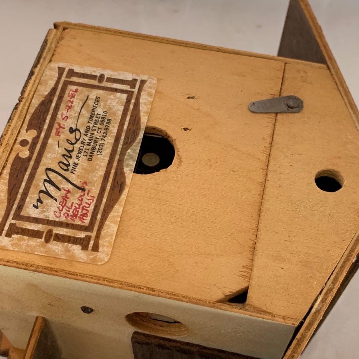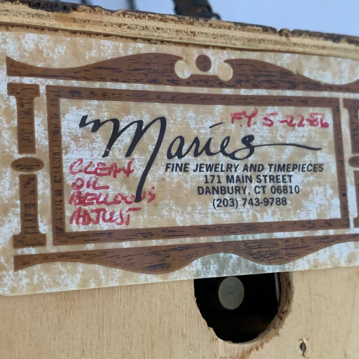 Functioning wooden cuckoo clock from Marie’s Fine Jewelry and Timepieces. Clock has metal chains and weights. Cuckoo clock measures approximately 7.5” x 5” x 6”. It is a bit dusty, but otherwise seems to be in good condition. Clock was not tested for accuracy.
