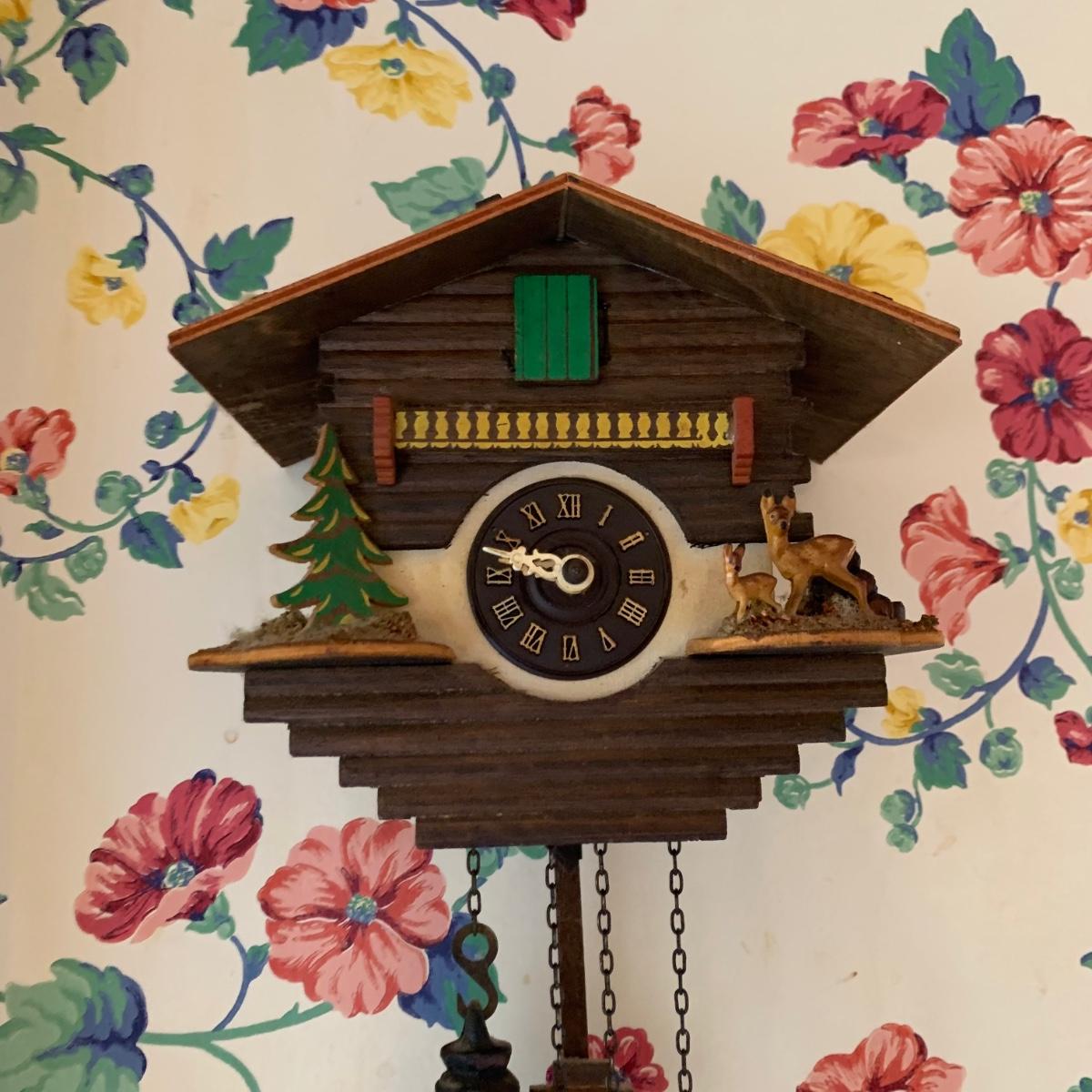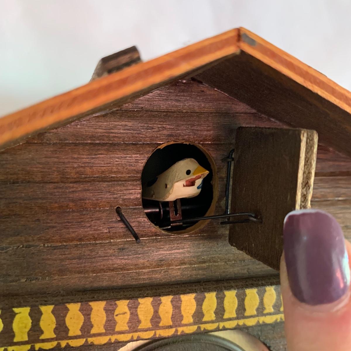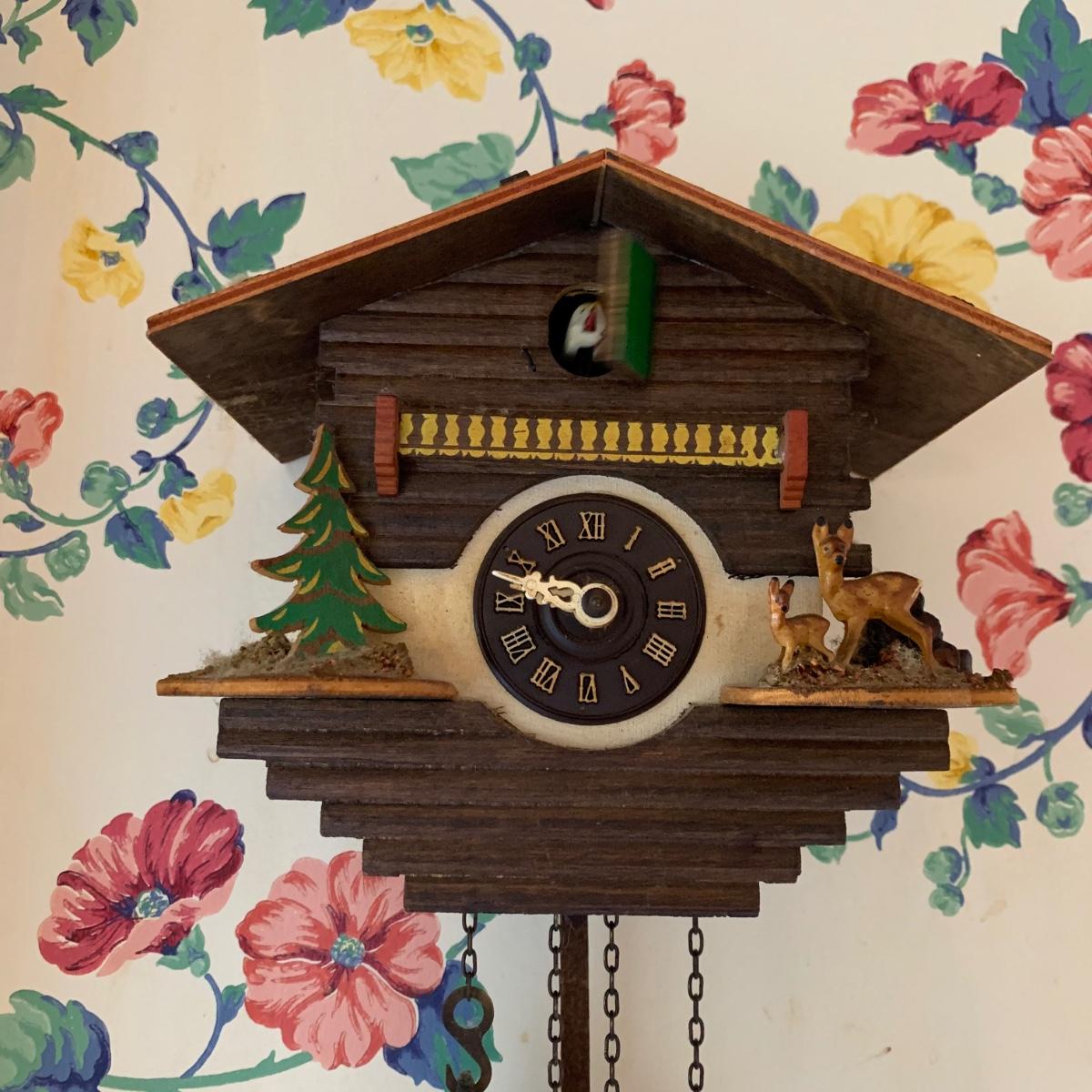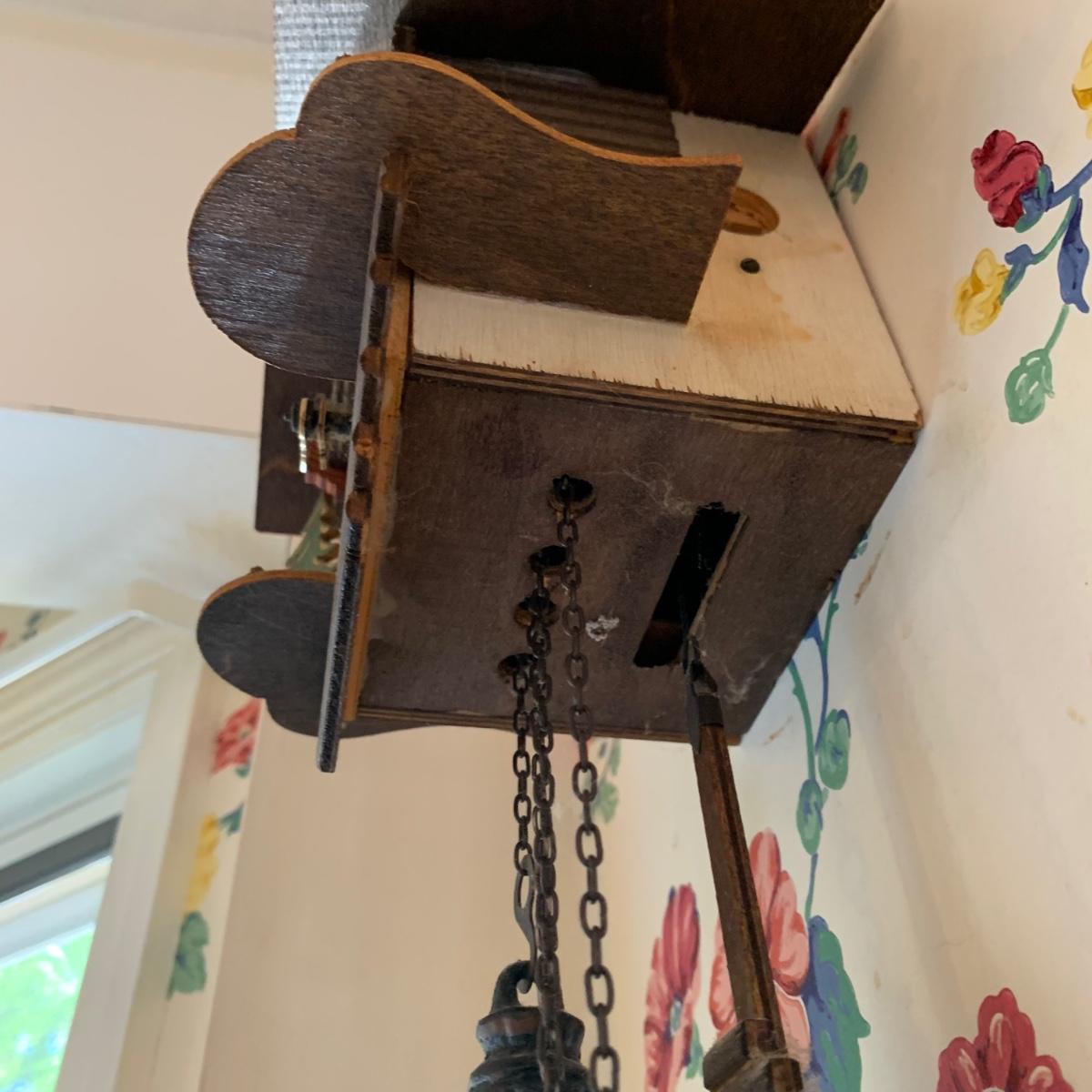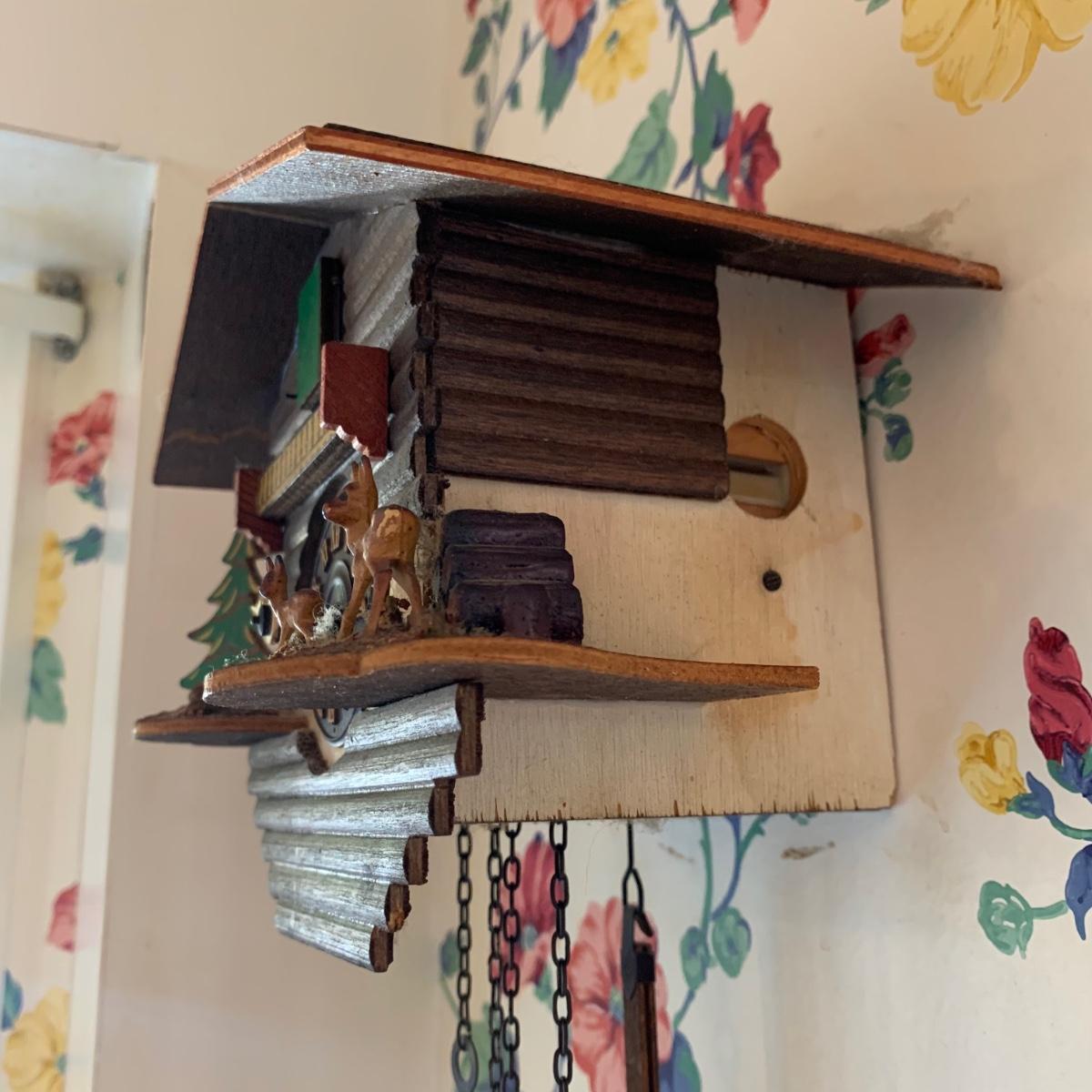 Functioning wooden cuckoo clock from Marie’s Fine Jewelry and Timepieces. Clock has metal chains and weights. Cuckoo clock measures approximately 7.5” x 5” x 6”. It is a bit dusty, but otherwise seems to be in good condition. Clock was not tested for accuracy.